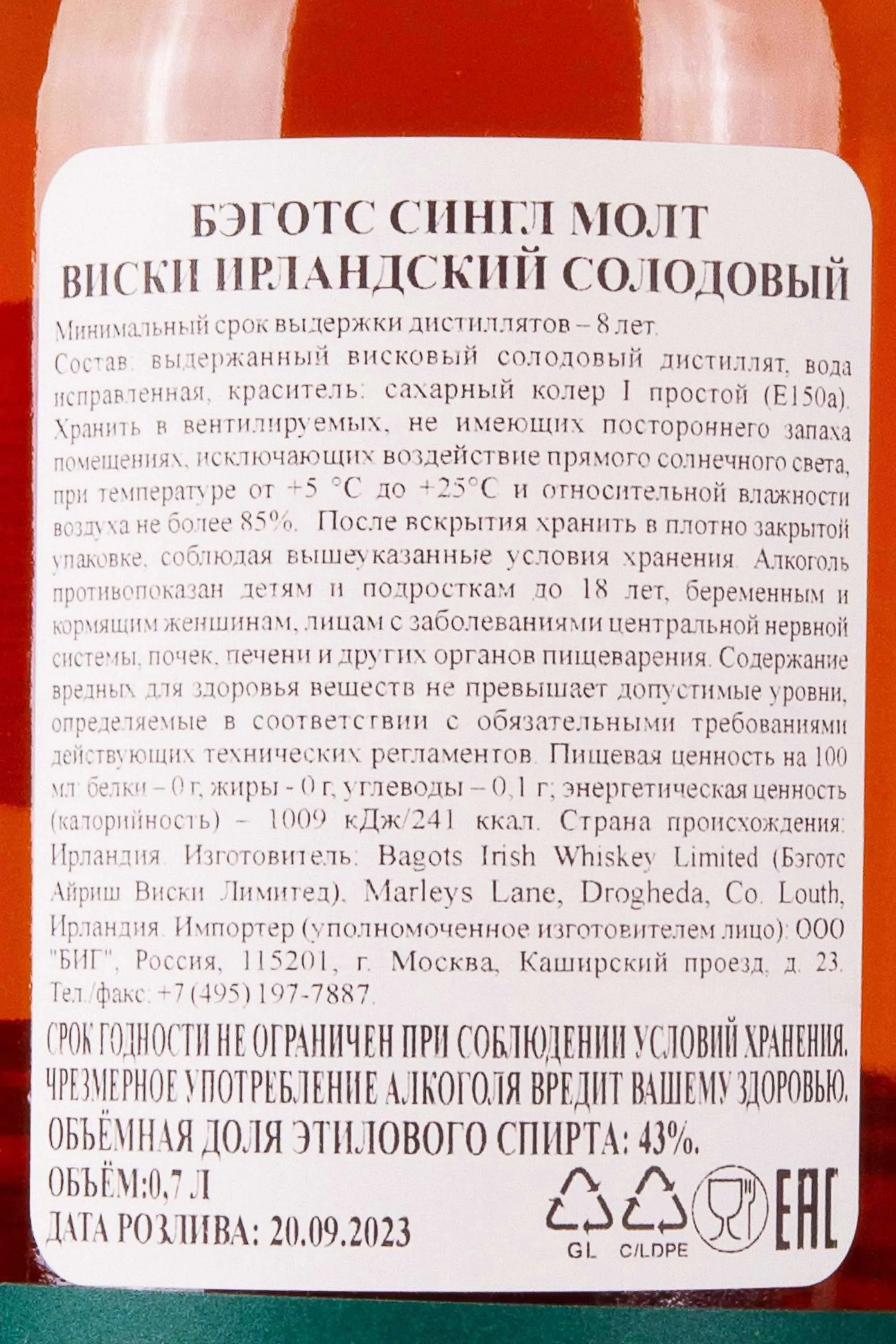Bagots Single Malt in tube 0.7 л купить - Ирландский виски Бэготс Сингл Молт в тубе цена в магазинег. Москва, ул. Профсоюзная, д. 16/1010:00-22:00 Ежедневно+7 (495) 920-20-02info@cru.ru