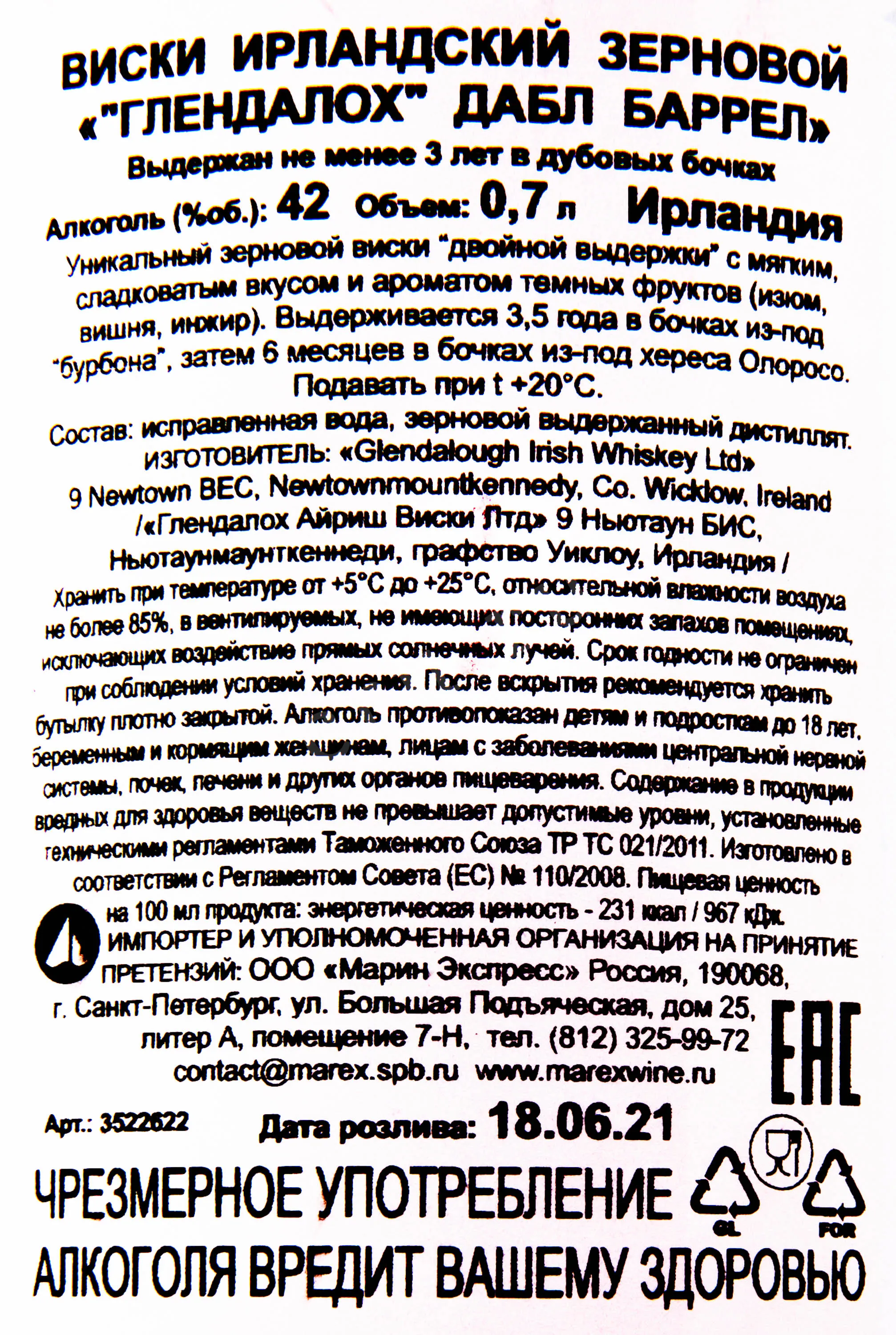 Виски Glendalough Double Barrel 0.7 l – это уникальный однозерновой ирландский whiskey, созданный из ячменного солода и кукурузы. После непрерывной дистилляции напиток подвергают холодной фильтрации. Полученные спирты выдерживаются сначала в течение 3.5 лет в барриках из-под бурбона, а после еще полгода в дубовых емкостях из-под хереса Олоросо. 42-процентный виски был отмечен серебряной и золотыми медалями на дегустационных конкурсах в Великобритании и США.