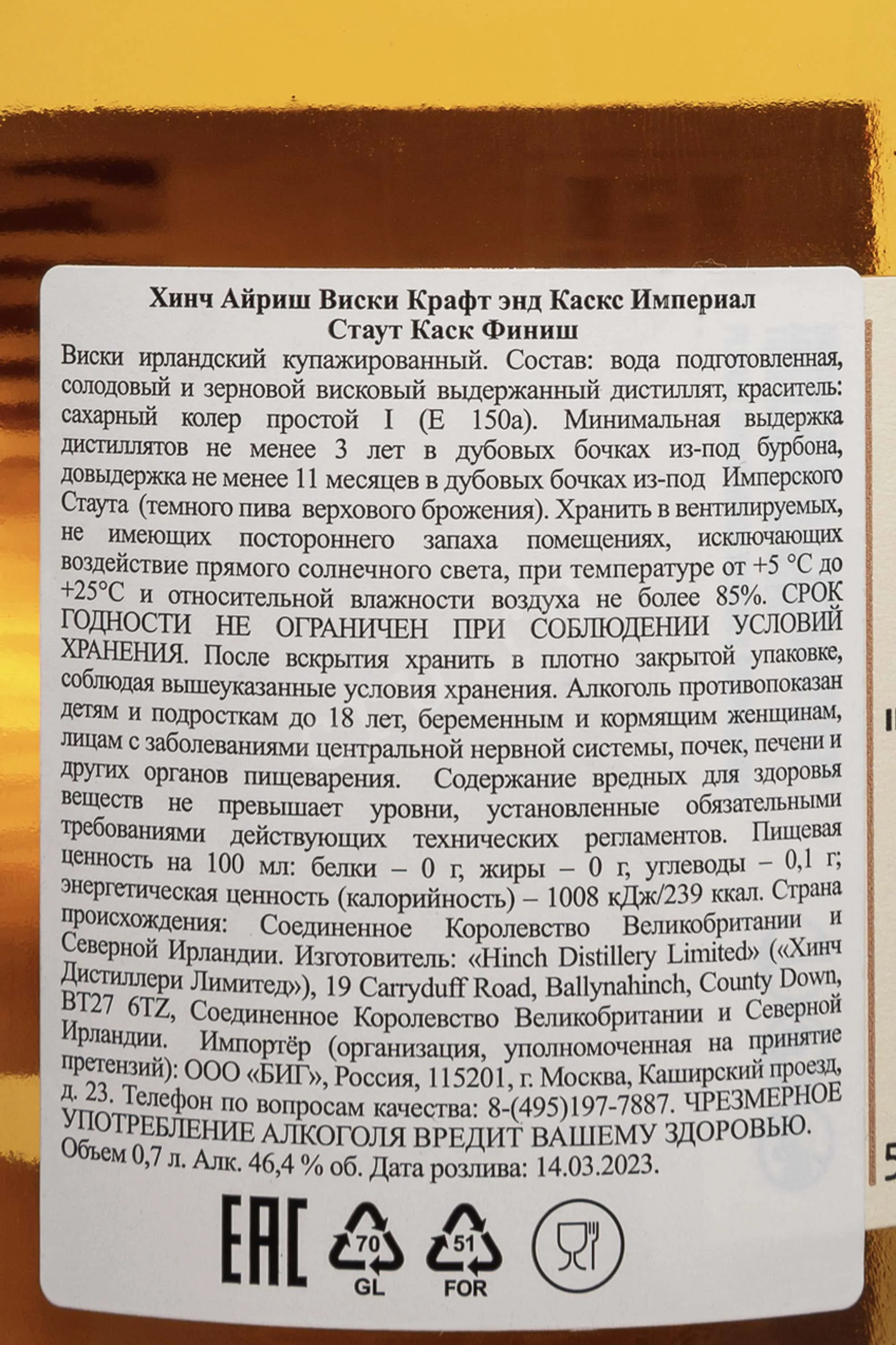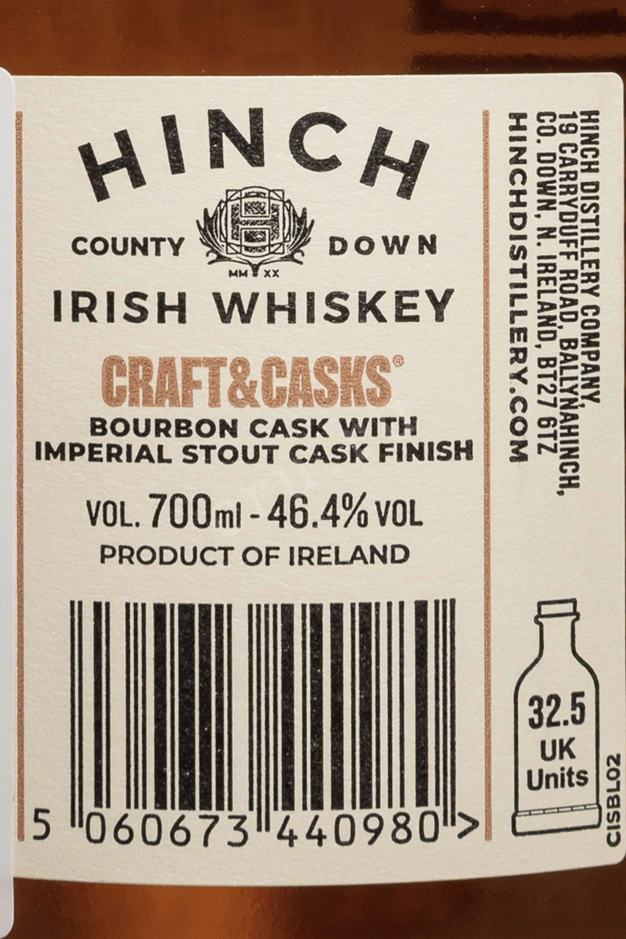 Виски Hinch Irish Whiskey Craft & Casks Imperial Stout Cask Finish 0.7 л — ирландский купажированный скотч лимитированного выпуска, созданный в рамках серии Крафт энд Каскс. Она посвящена экспериментам с финишной выдержкой и сотрудничеству с независимыми производителями. В основе напитка — смесь солодовых и зерновых дистиллятов, выдержанных не менее трёх лет. Ключевая особенность — дополнительное созревание в бочках из-под имперского стаута пивоварни Whitewater. Сначала в этих бочках в течение полугода выдерживалось крепкое тёмное пиво, после чего они были использованы для дозревания виски почти на год. Такой подход усиливает глубину вкуса и подчёркивает крафтовый характер релиза. Выпуск ограничен по объёму и ориентирован на ценителей нестандартных стилей. Серия получила положительные отклики за смелое сочетание традиционного ирландского виски и пивных технологий.