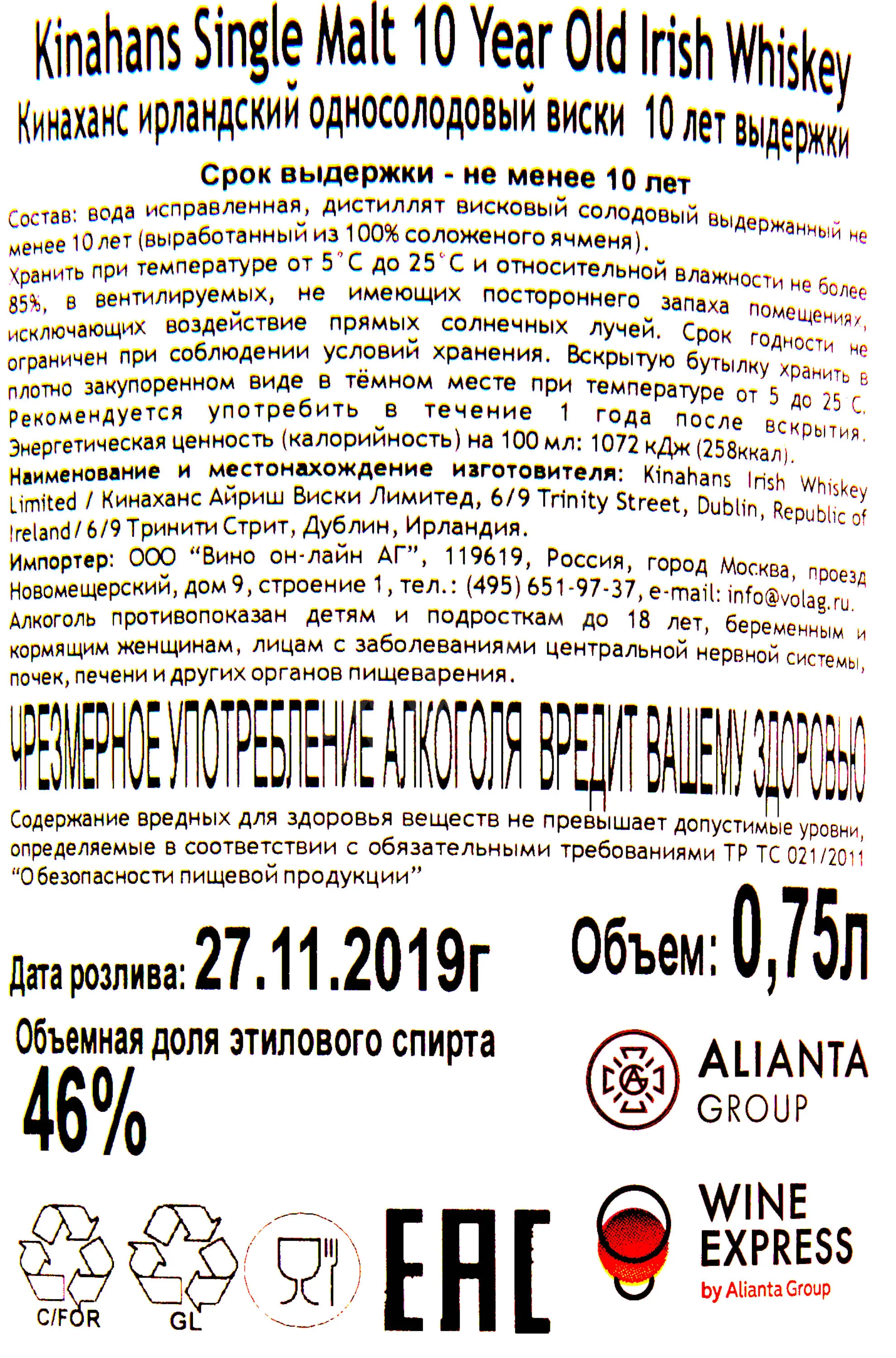 Kinahans Single Malt 10 years in tube 0.7 л купить - Ирландский виски Кинаханс 10 лет в тубе цена в магазинег. Москва, ул. Профсоюзная, д. 16/1010:00-22:00 Ежедневно+7 (495) 920-20-02info@cru.ru