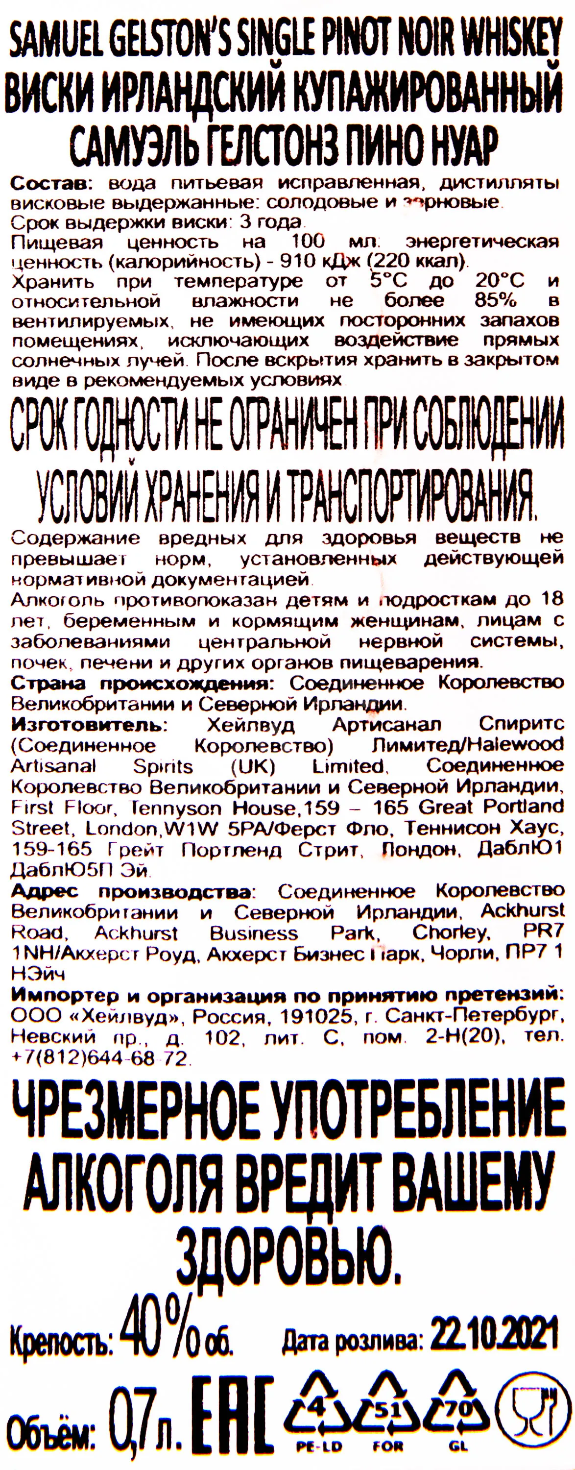 Виски Samuel Gelston`s Pino Noir gift box 0.7 l — это эксклюзивный ирландский алкоголь, изготовленный братьями Джонни и Сэмом Нилом. 40-процентный напиток, производимый на одной винокурне из смеси солодового и несоложеного ячменя, которые перегоняются вместе в традиционном медном перегонном кубе. Это не купаж, это не односолодовый напиток, это совершенно уникальный виски, обладающий насыщенным вкусом и характером.