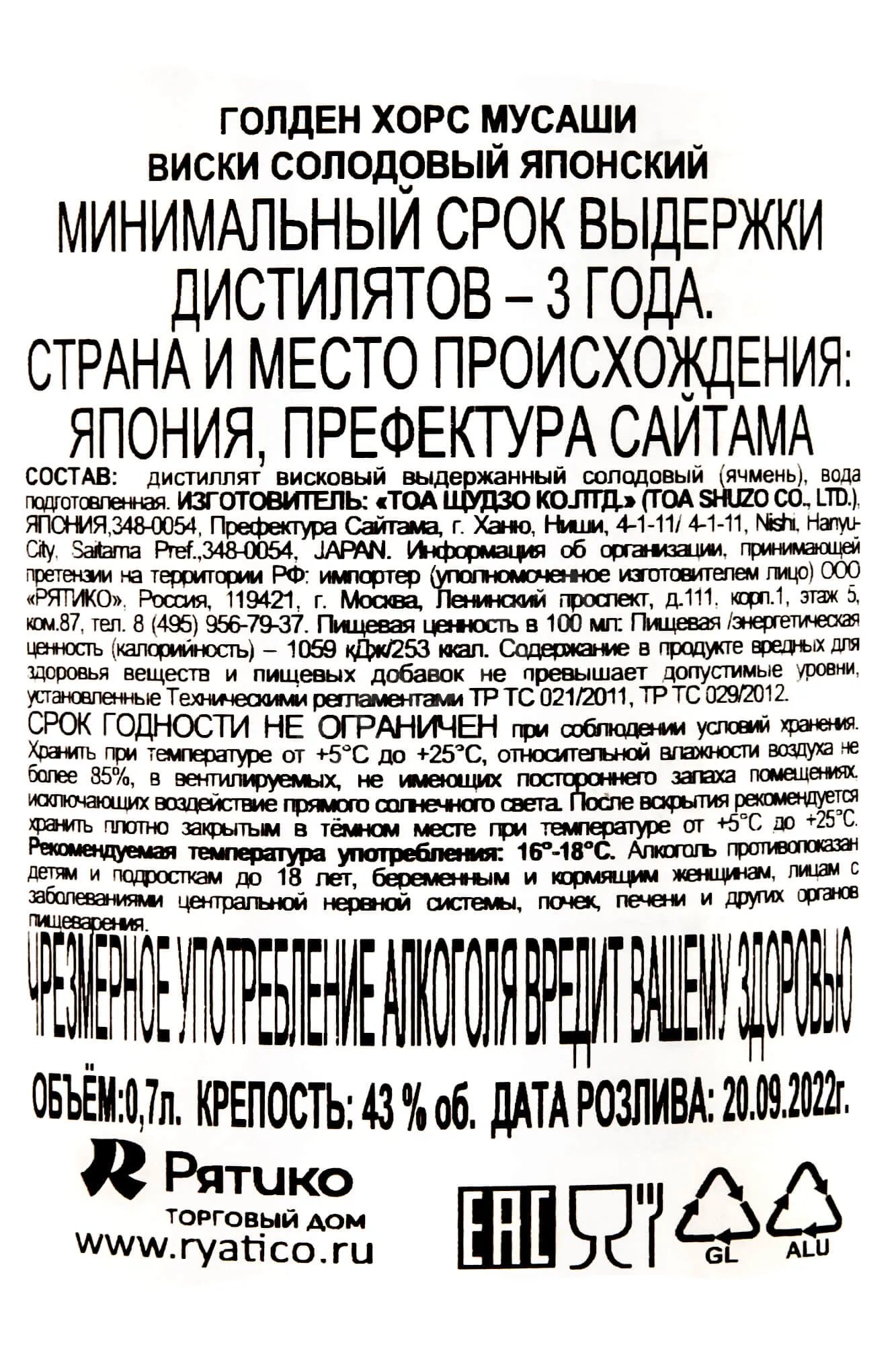 Виски Golden Horse Musashi 3 года 0,7 л — солодовый, незаурядный, с выразительным характером, произведен японской дистиллерией Toa Shuzo в префектуре Сайтама по классической рецептуре. В основе лежат отборные шотландские дистилляты с бочковой выдержкой не менее трёх лет. Для доведения виски до нужной крепости использовалась водка из родникового источника Ханью. Уникальность напитка заключена в элегантной текстуре, гармоничном балансе фруктовых нот и мягком пробуждении зернового ядра. Переиздание легендарного бренда Голден Хорс («Золотая лошадь») получило теплые отзывы — средняя оценка по Whiskybase 81,4.