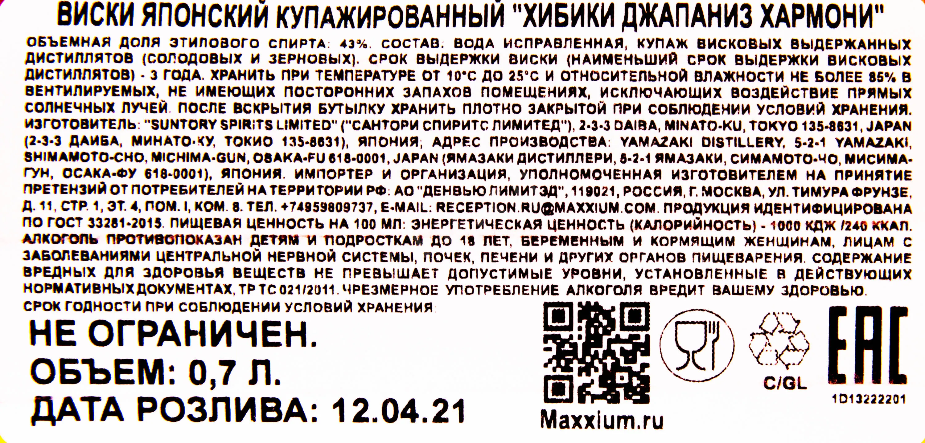 Виски Hibiki Japanese Harmony gift box 0.7 l – это купажированный японский алкоголь, выпускаемый в брендовых сувенирных упаковках. Изготавливают напиток методом двойной перегонки с последующей выдержкой в барриках из-под бурбона не менее 3-х лет. Перед бутилированием виски подвергают холодной фильтрации. 43-процентный алкоголь был отмечен несколькими медалями на дегустационных конкурсах в Лондоне и Сан-Франциско.