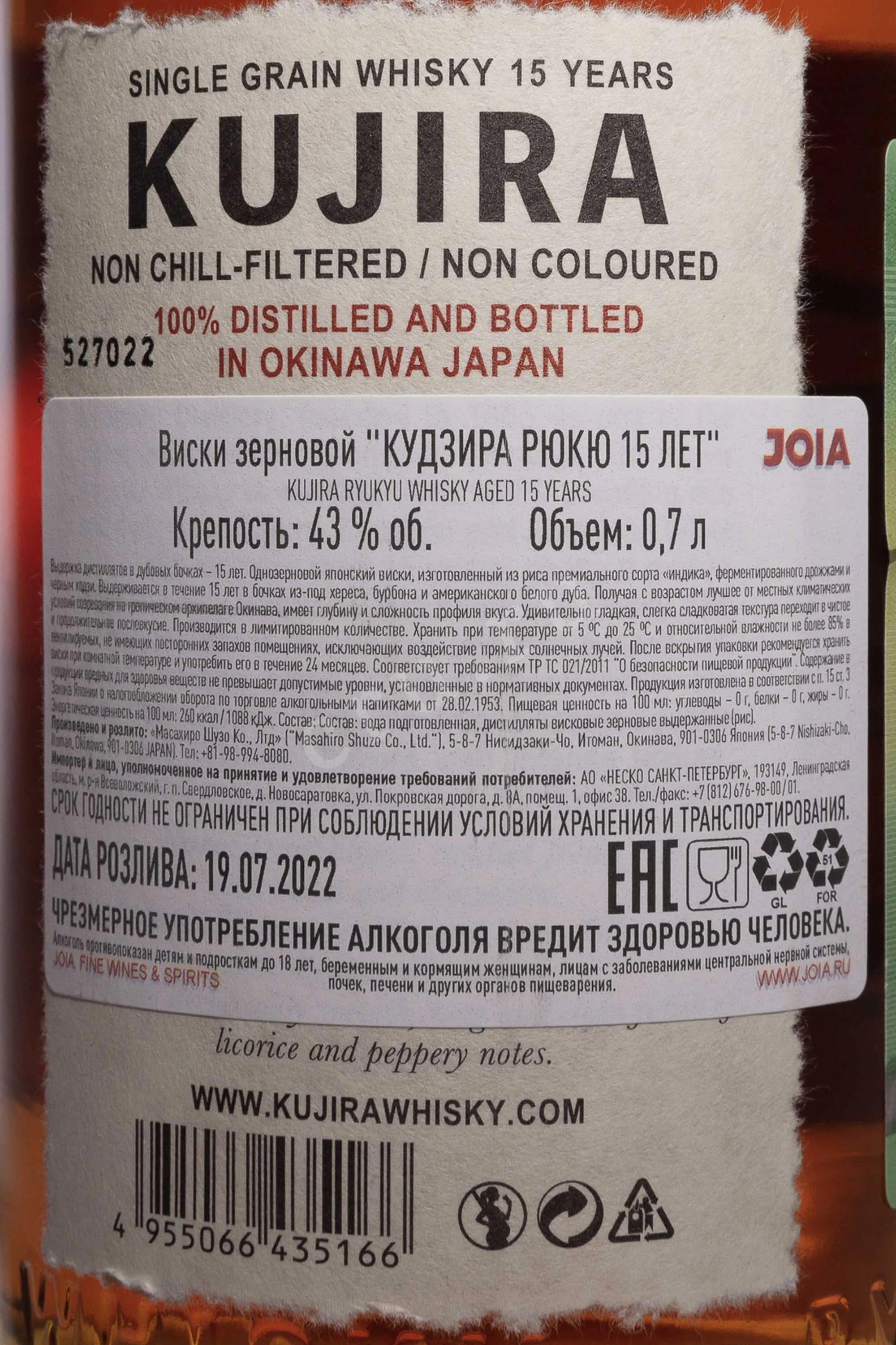 Виски Kujira Ryukyu 15 лет в подарочной упаковке 0.7 л — премиальный, зерновой, родом с японских островов Рюкю. Он отражает сочетание местных традиций и современных технологий дистилляции. Напиток создаётся в субтропическом климате Окинавы, который ускоряет созревание и формирует округлый характер. Производство основано на использовании длиннозернистого риса сорта Индика, чёрного кодзи и чистой местной воды. Дистилляция проходит на вискикурне Masahiro Distillery, одной из старейших в регионе. Для длительной выдержки применяются бочки из-под хереса и бурбона, а также из американского белого дуба. Такой подход придаёт виски мягкую текстуру и сложный профиль. Линейка Кудзира относится к флагманским в портфеле японского производителя и регулярно получает высокие оценки за баланс и зрелость вкуса. Подарочная упаковка подчёркивает премиальный статус напитка.