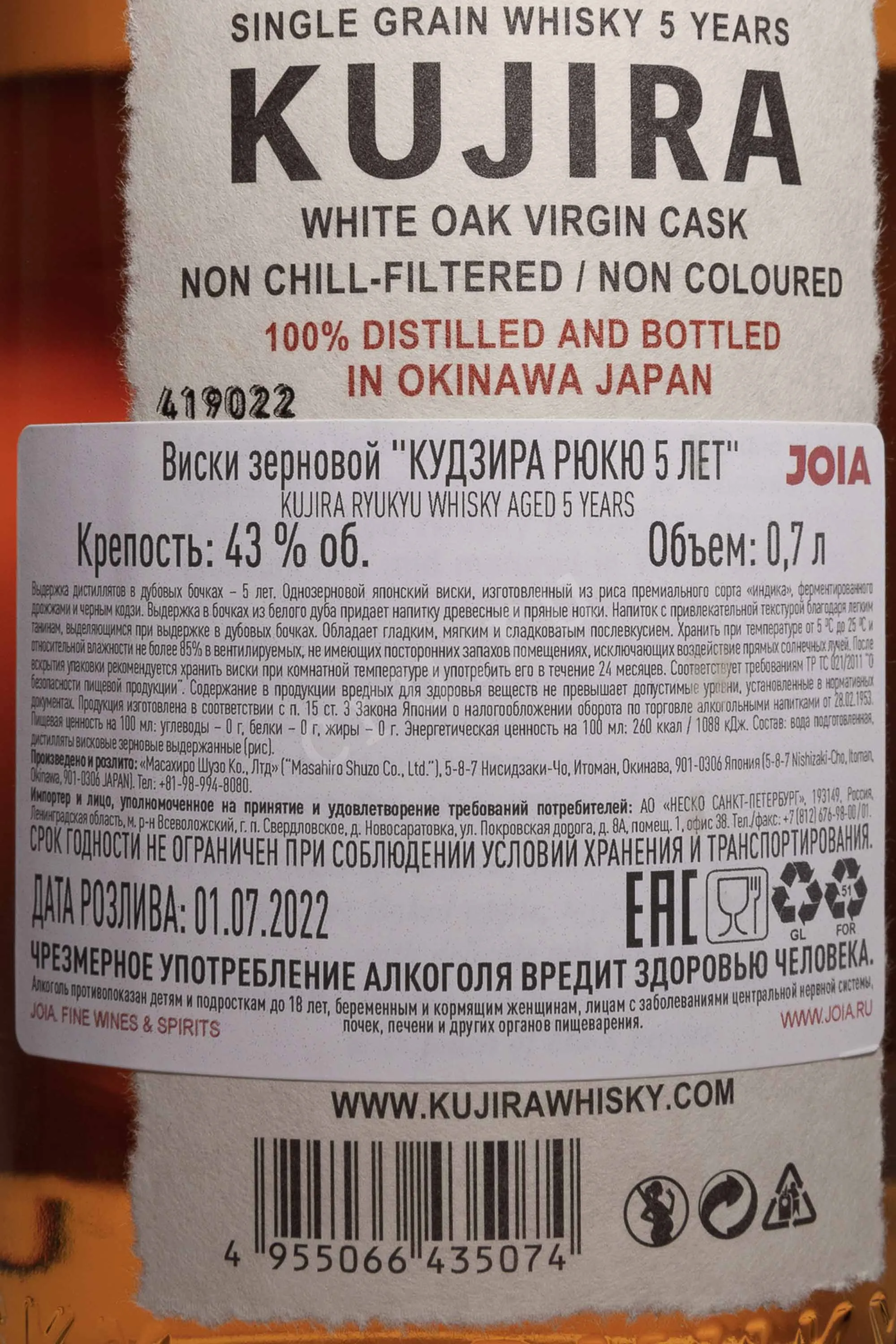 Виски Kujira Ryukyu 5 лет в подарочной упаковке 0.7 л — зерновой, родом из Японии, отмеченный выраженной региональной идентичностью и спокойным, выверенным характером. Он создается на Окинаве и отражает местные традиции дистилляции. В качестве сырья используется длиннозерный рис сорта индика, а ферментация проходит с применением черного кодзи, характерного для островных спиртов. Дистилляция ориентирована на сохранение мягкой текстуры и чистоты вкуса. Выдержка в течение пяти лет осуществляется в новых бочках из белого дуба в теплом южном климате Окинавы, что ускоряет развитие ароматов и усиливает древесные оттенки. Перед розливом виски не подвергается холодной фильтрации и не окрашивается, благодаря чему сохраняет естественный вкус. Он был выпущен ограниченной серией и получил высокую оценку профессионального сообщества, а также несколько медалей медали на престижных международных конкурсах.