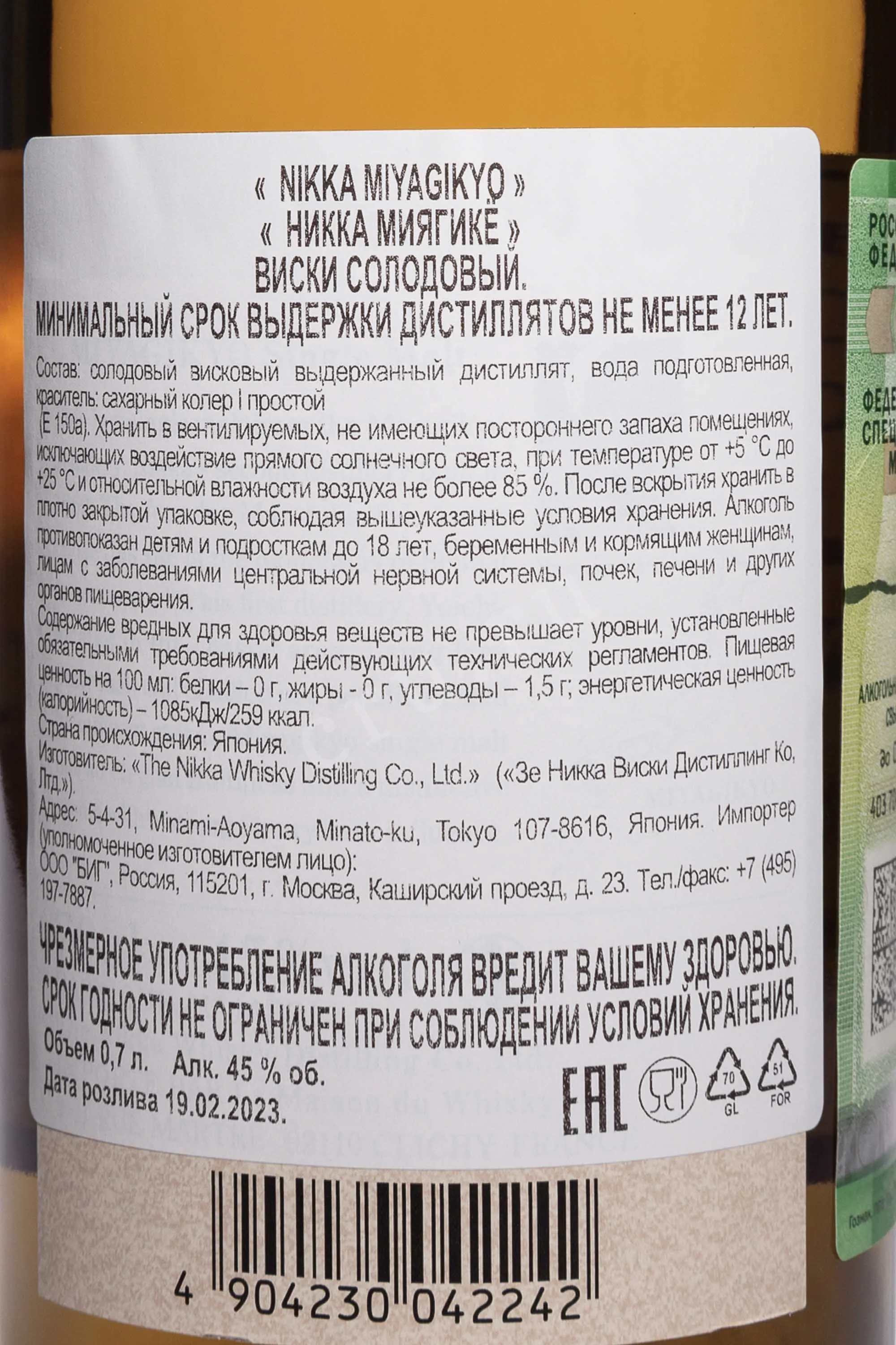 Виски Nikka Miyagikyo Single Malt 0,7 л в подарочной упаковке — это японский односолодовый виски без указания возраста, выпускаемый с 2015 года. Напиток производится на вискикурне Miyagikyo, расположенной в префектуре Мияги, на севере острова Хонсю. Эта дистиллерия была основана в 1969 году Масатакой Такэцуру — пионером японского виски. При создании напитка используется смесь солода из Шотландии и Австралии. Перегонка выполняется на медных кубах с непрямым паровым нагревом. Такой метод обеспечивает мягкость, лёгкость и фруктовый стиль. Виски выдерживается в дубовых бочках из-под бурбона и хереса в условиях прохладного климата и высокой влажности. Это придаёт напитку характерную сладость, сложные фруктовые и пряные ноты. Алкоголь крепостью 45%.