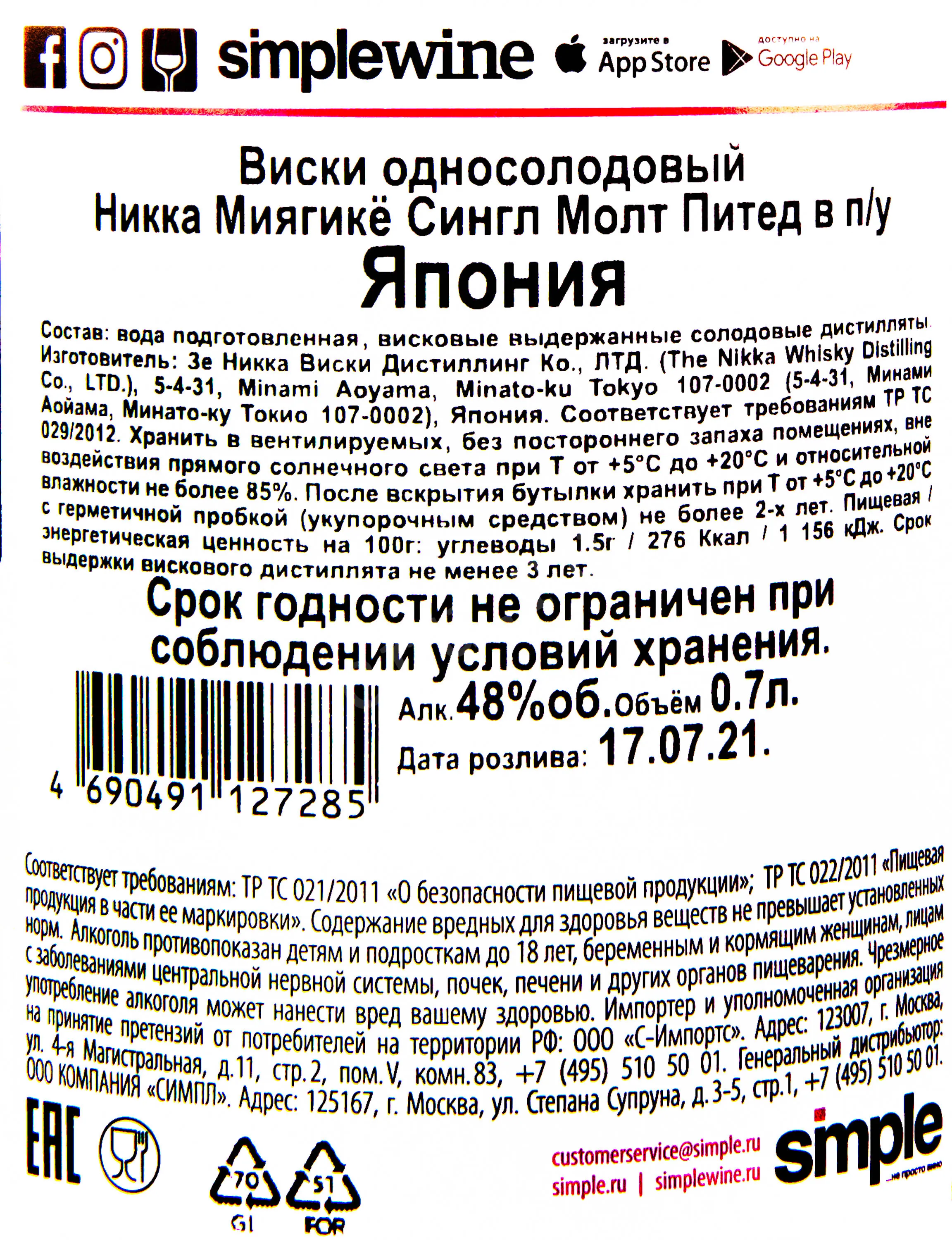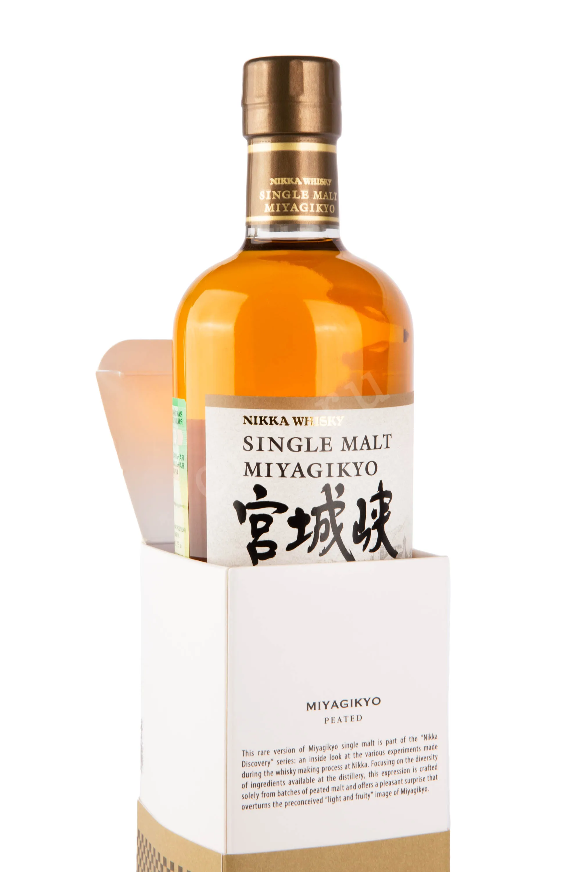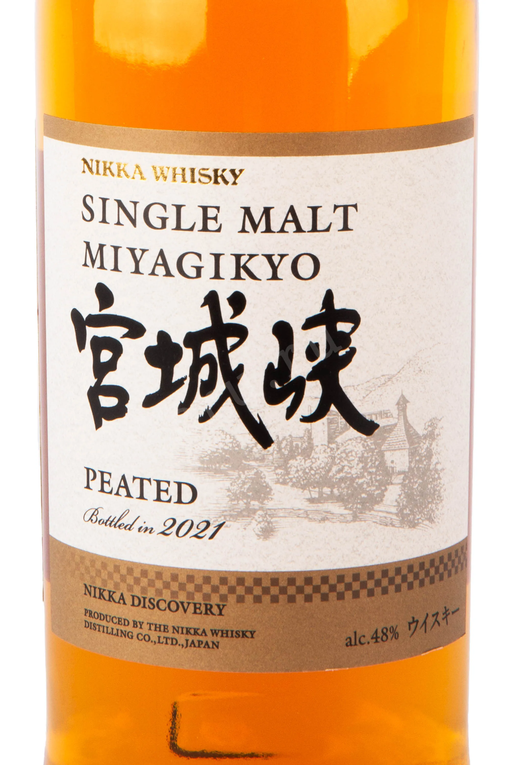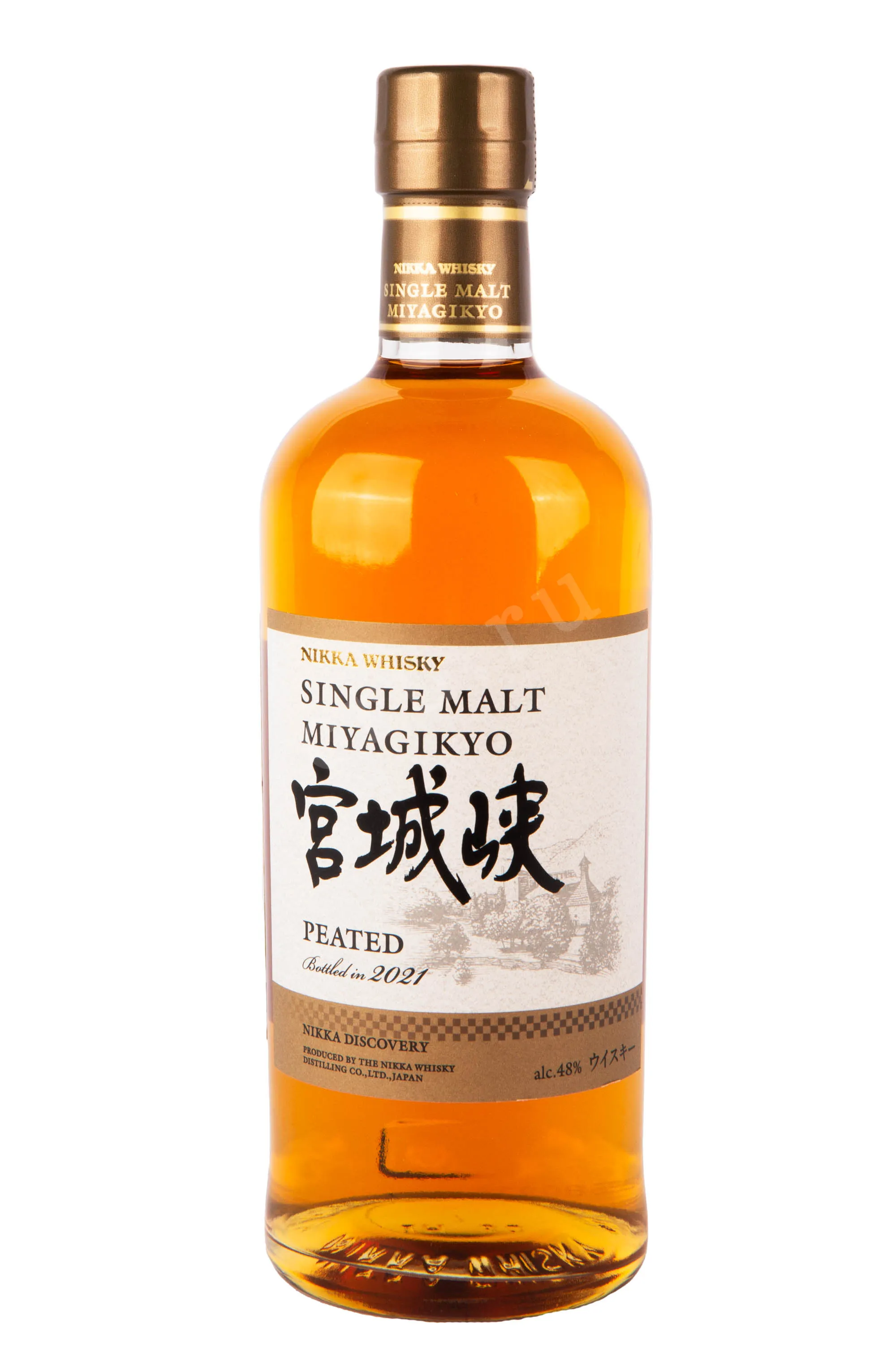 Виски Nikka Miyagikyo Single Malt Peated 0.75 л — японский односолодовый сорт из экспериментальной линейки Никка Дискавери. Создан на вискикурне Миягике, расположенной на острове Хонсю к западу от города Сендай. Она работает с 1969 года и находится в долине, где климат и влажность напоминают условия шотландских регионов. Для дистилляции используют солод, привезенный из Шотландии и Австралии. Двухэтапная перегонка проходит в медных кубах. Затем спирты выдерживают в бочках из американского белого дуба. Версия Питед выделяется использованием торфяного солода, который придает напитку дымные оттенки. Розлив осуществлялся при крепости 48%. Выпуск ограничен — около 20 тыс. бутылок.