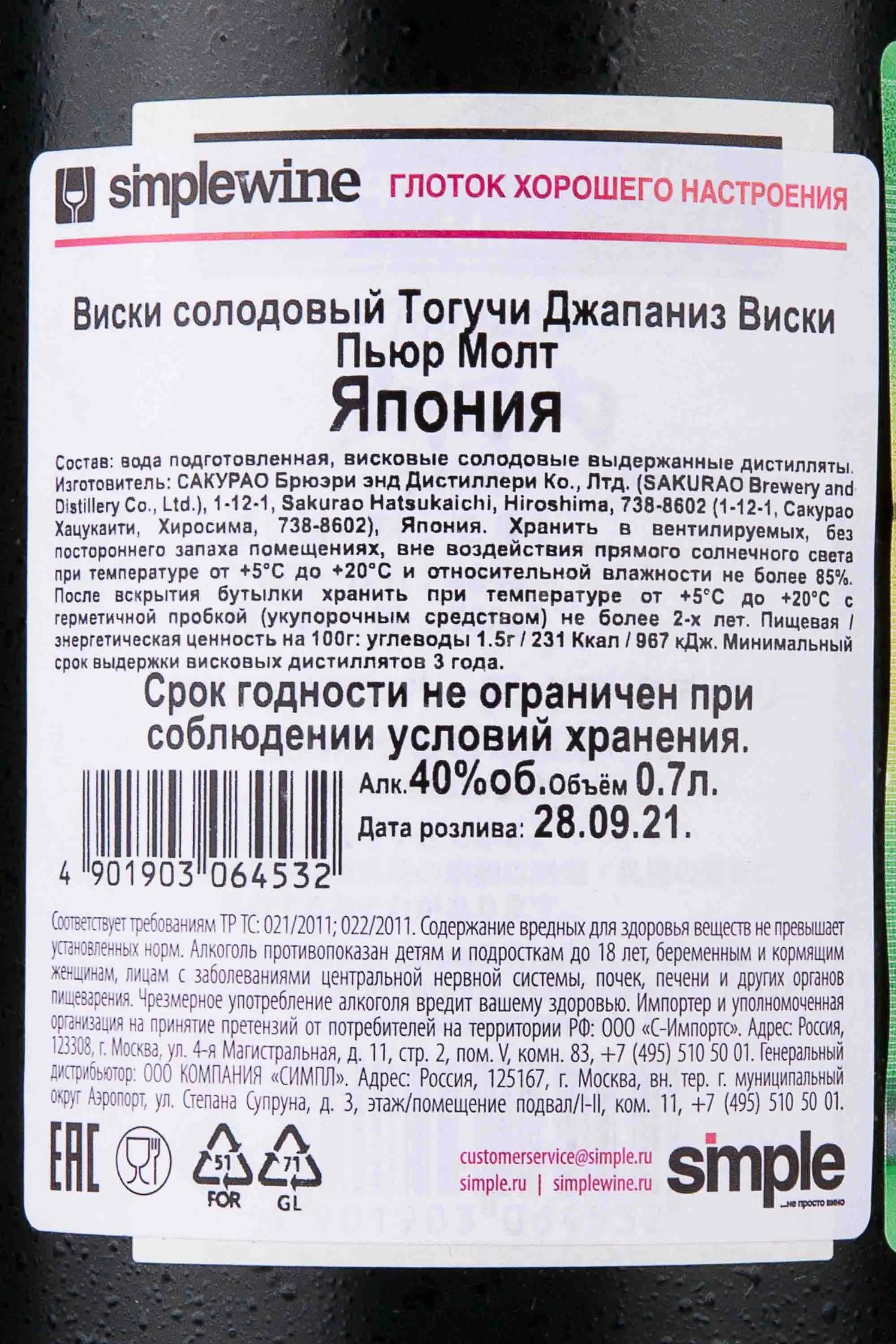 Виски Togouchi Pure Malt gift box 0.7 л — японский виски, созданный из тщательно подобранных шотландских солодовых спиртов. Он производится в лучших традициях вискикурни Сакурао и региона Хиросима, с применением ноу-хау и опыта талантливых мастеров, которые работали над совершенствованием рецептуры несколько десятилетий. Виски выдерживался в бочках из-под бурбона и хереса в уникальных условиях — в заброшенном железнодорожном тоннеле с постоянной температурой и влажностью. Эта технология старения обеспечила напитку особую мягкость и тонкий аромат. Тогучи Пьюр Молт ценится за баланс вкусов и изысканную подачу, идеально подходящую для подарка.