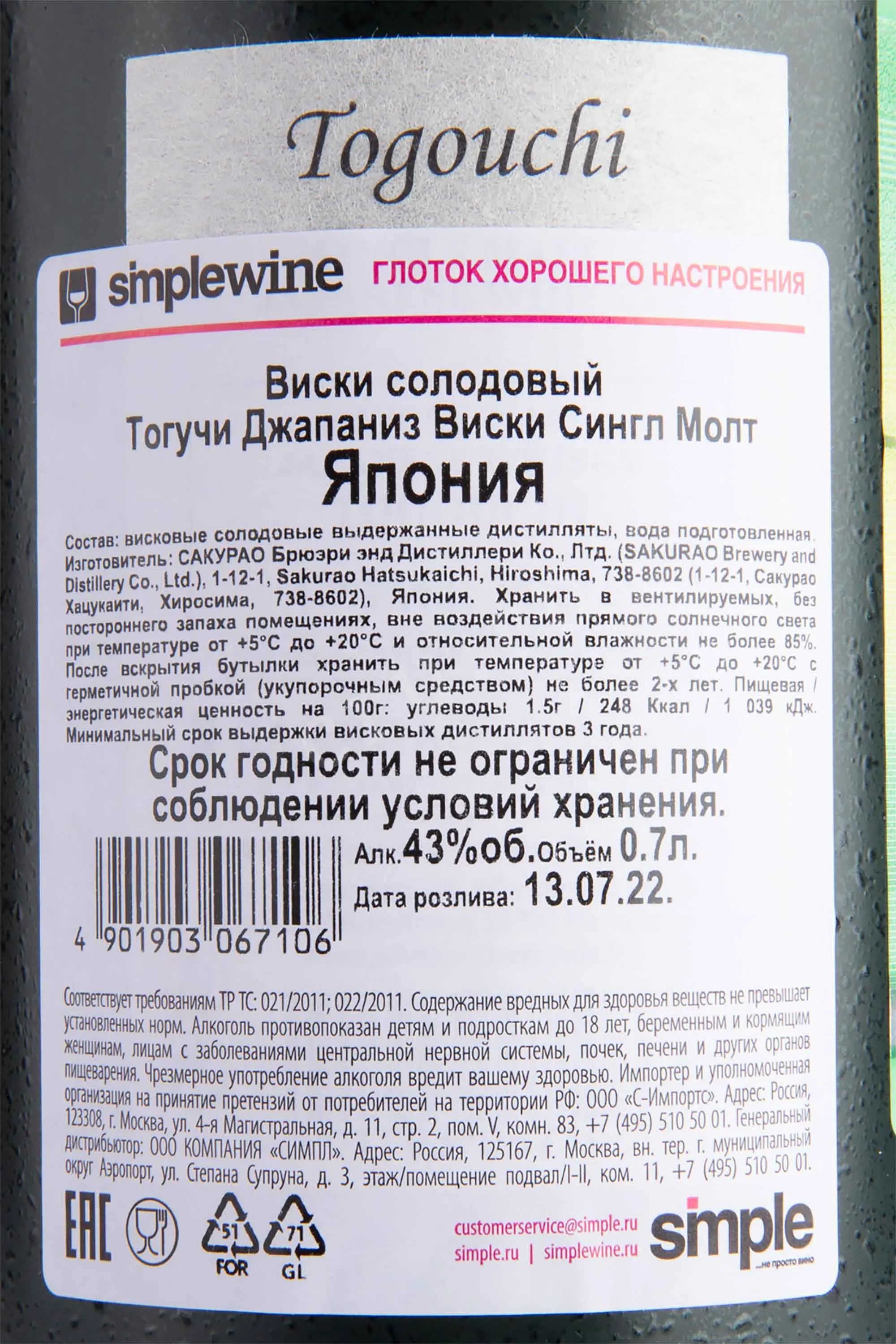 Виски Togouchi Single Malt with gift box 0.7 л был создан в исключительных условиях в Японии, благодаря тщательно подобранным ингредиентам и особой технологии выдержки. Производство осуществлялось в старом железнодорожном тоннеле в префектуре Хиросима, где стабильные низкие температуры и высокая влажность обеспечивали плавное и глубокое созревание спиртов. Бочки, изготовленные из японского дуба мидзунара и отборного европейского дуба, придавали напитку неповторимый, элегантный характер и тонкие оттенки вкуса.