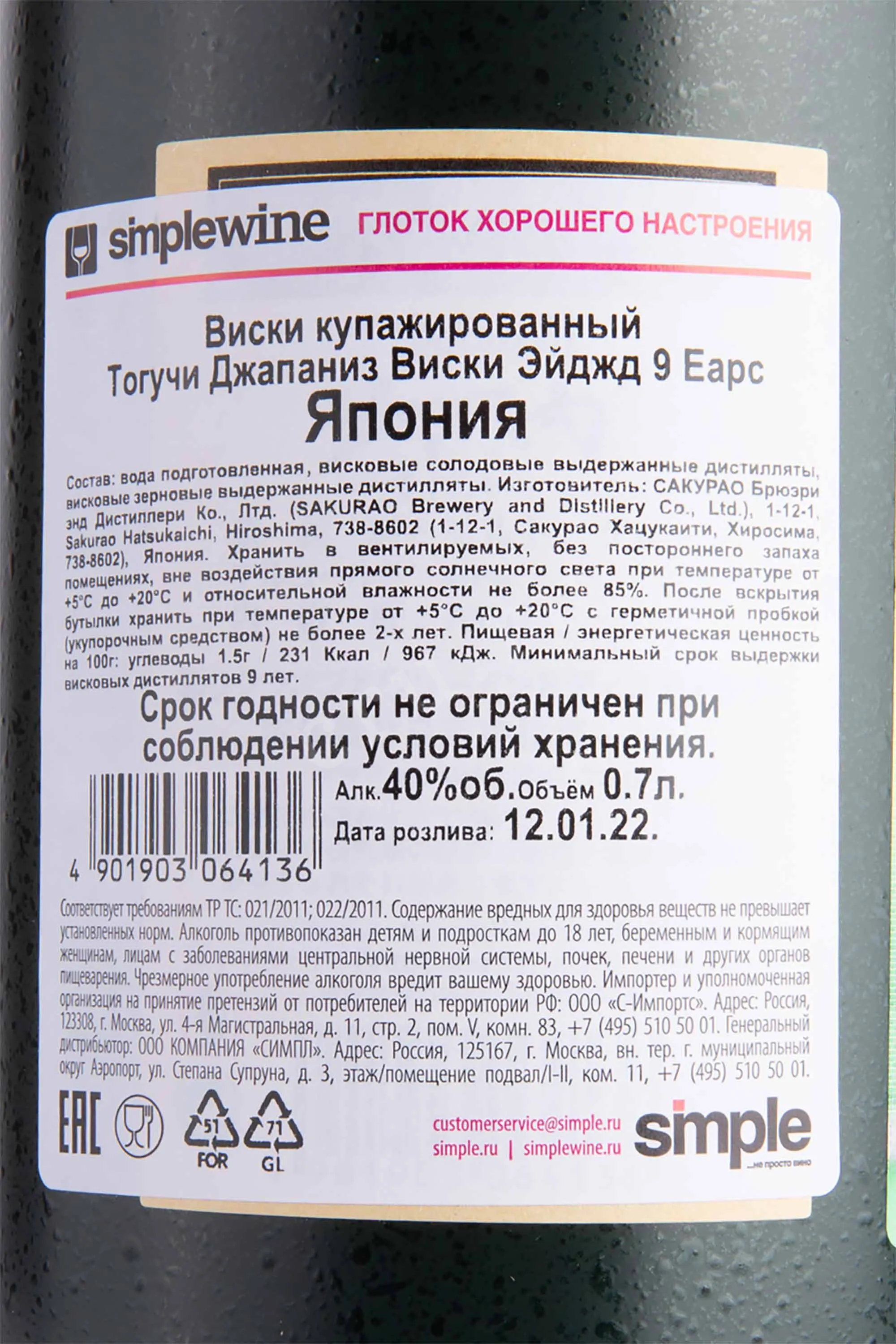 Виски Toguchi 9 лет 0,7 л в подарочной упаковке — это благородный японский купаж из солодовых и зерновых спиртов, выдержанных минимум 9 лет в дубовых бочках. Создан уникальной дистиллерией Сакурао (бывший Чугоку Дзёзо), где купажируют и выдерживают спирты из Шотландии и Канады в тоннеле рядом с городом Тогучи при стабильной температуре около 14 °C и влажности 80 %. Такой подход придаёт напитку мягкость, сбалансированность и тонкие минеральные оттенки, пропитанные духом Хиросимы. Независимые дегустаторы отмечают выраженный цитрусовый аромат, пряные ноты и лёгкую дымность виски. Он получил многочисленные положительные оценки от профильных изданий, ему справедливо отдают предпочтение коллекционеры, ценящие гармонию вкуса и японское мастерство.