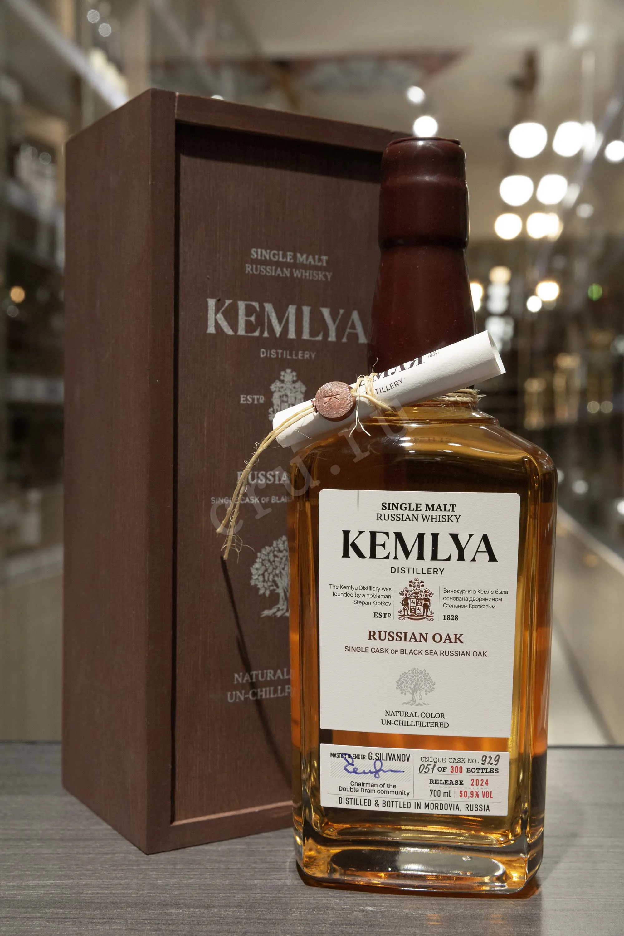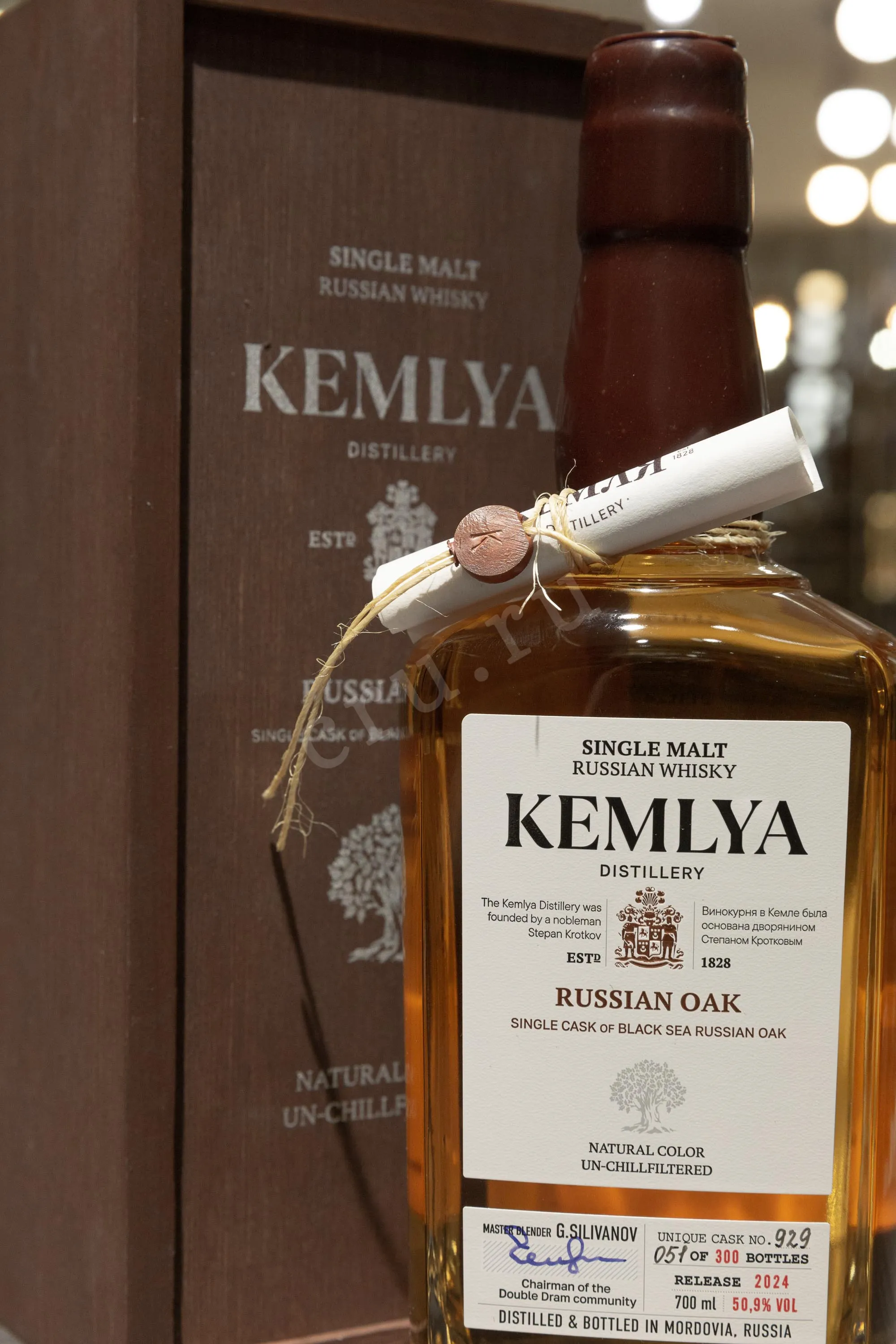 Kemlya Russian OAK wooden box 0.7 л купить - Российский виски Кемля Рашен ОУК в деревянной упаковке цена в магазинег. Москва, ул. Профсоюзная, д. 16/1010:00-22:00 Ежедневно+7 (495) 920-20-02info@cru.ru