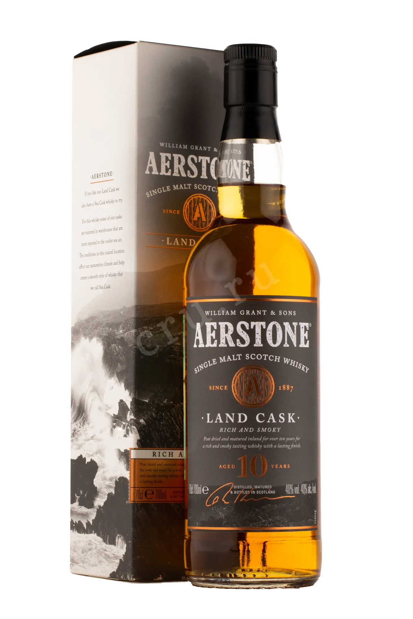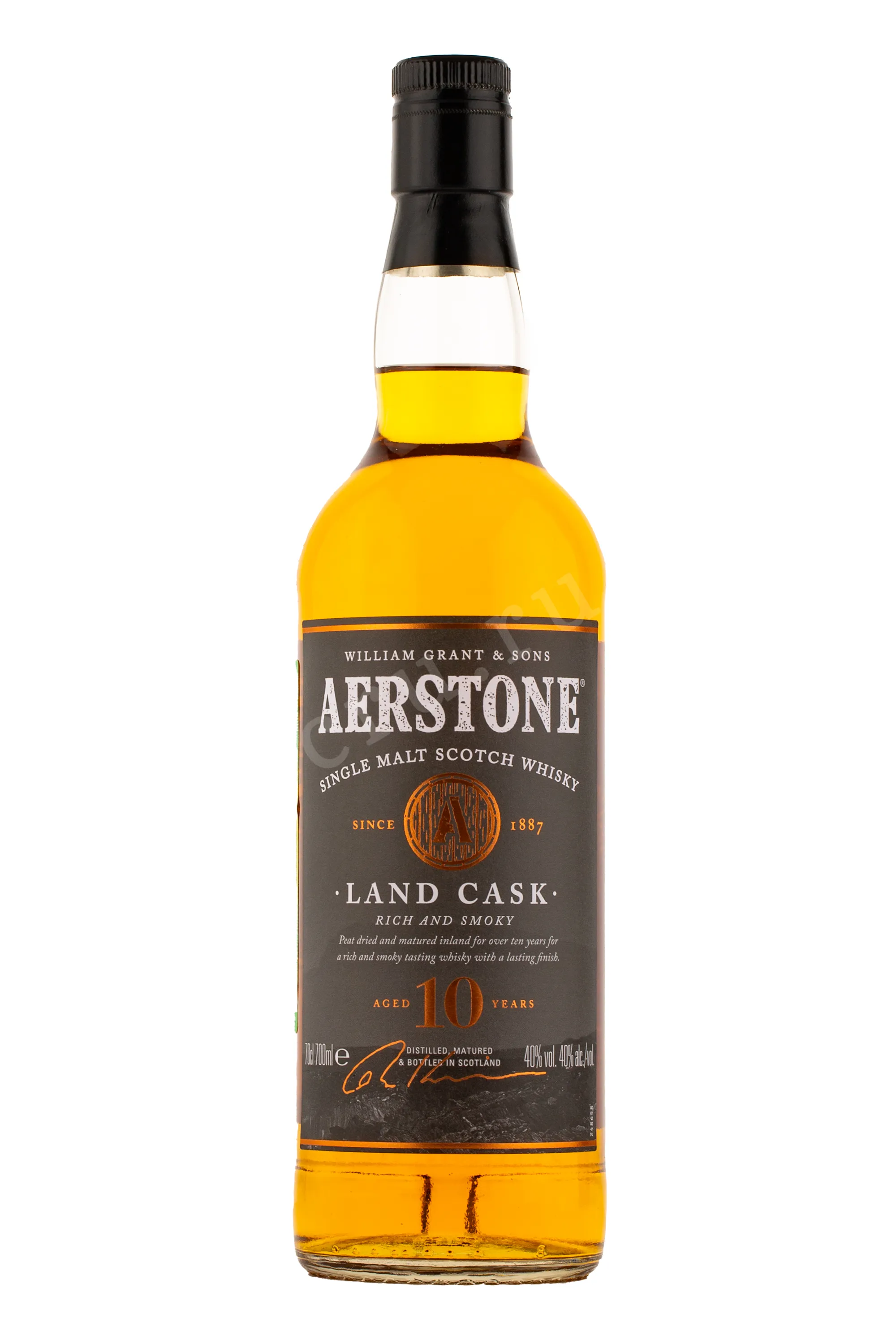 Виски Aerstone 10 Years Old Land Cask gift box 0.7 l – это односолодовый шотландский скотч, представленный в фирменном сувенирном боксе. После двойной дистилляции спирты переместили в дубовые баррики, где они созревали в течение 10 лет. Розлив осуществлялся после холодной фильтрации при крепости 40%. Виски был отмечен бронзовой и несколькими серебряными медалями на дегустационном конкурсе в Лондоне.