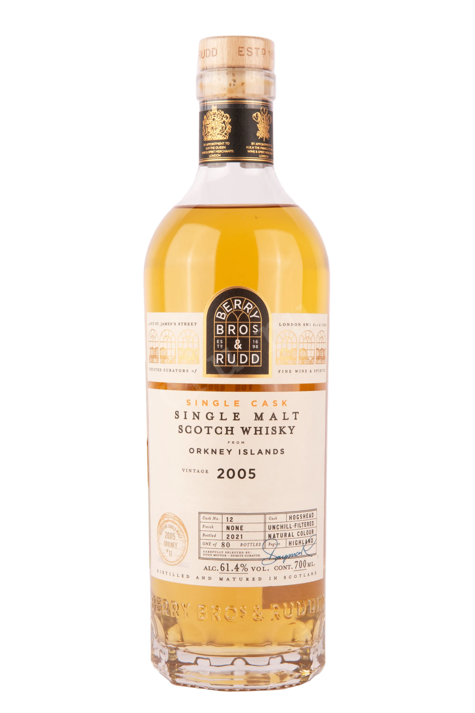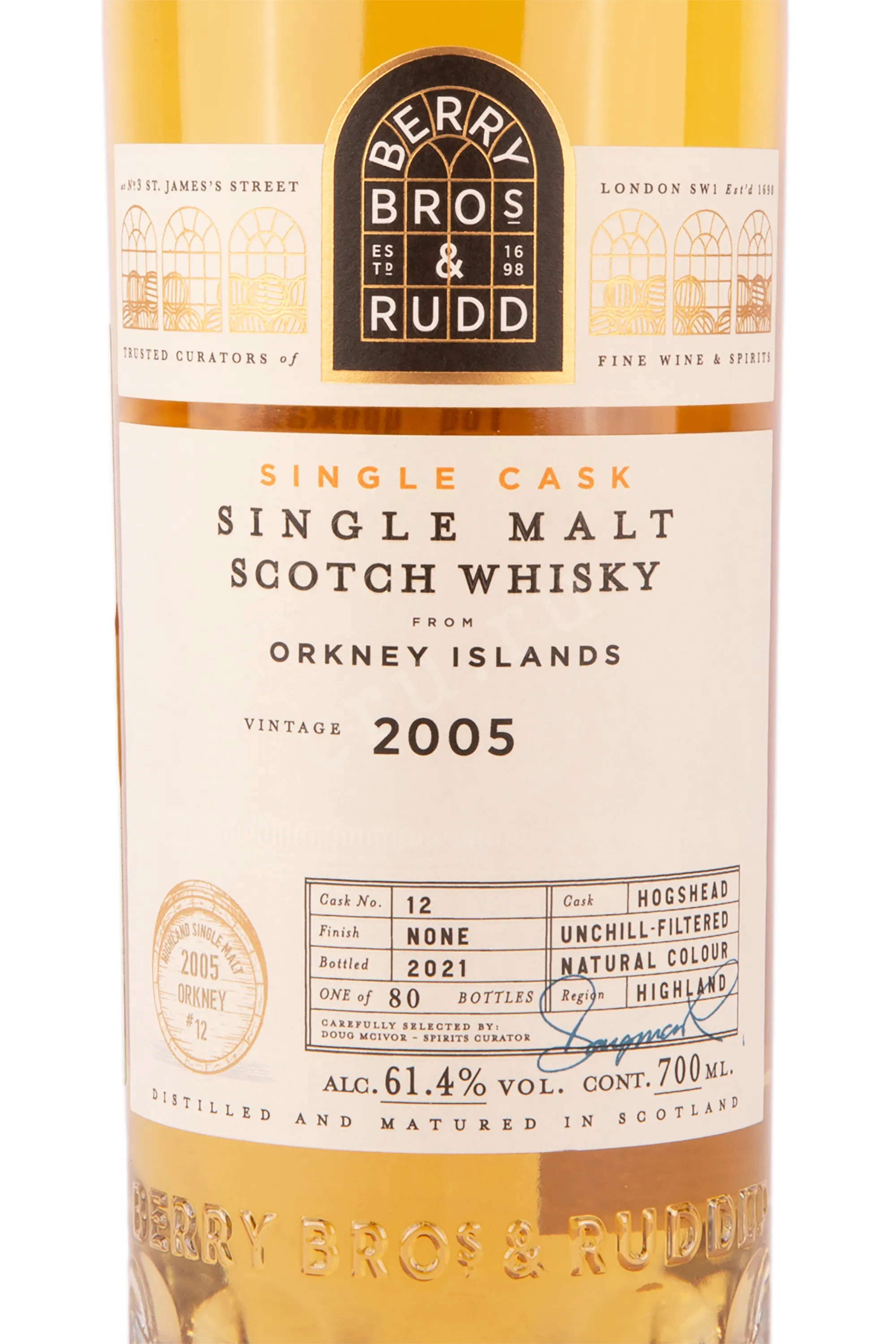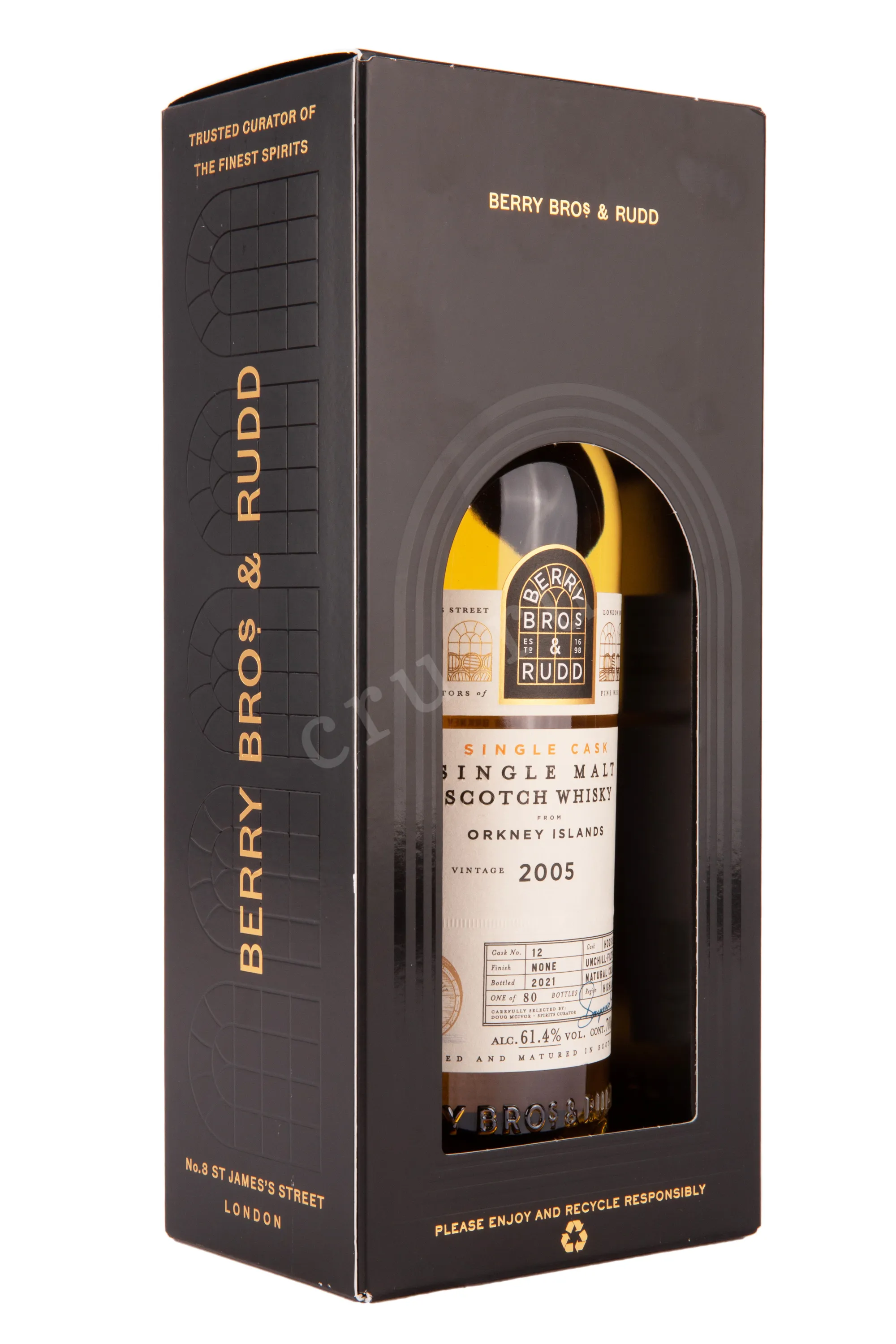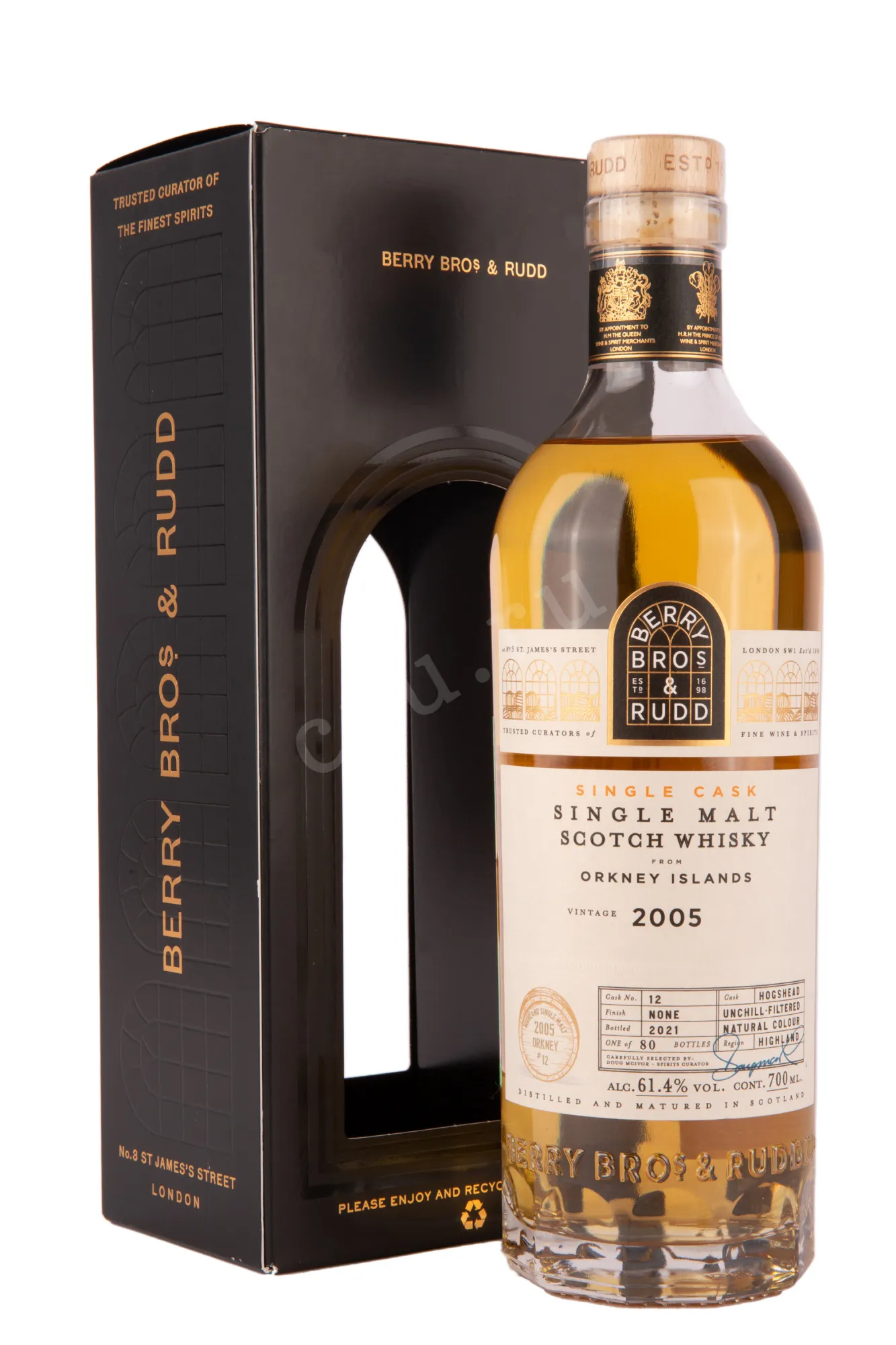 Виски Berry Bros & Rudd Orkney Islands 2005 gift box 0.7 l – это шотландский односолодовый скотч, произведенный лимитированной серией (всего 80 бутылок) на Оркнейских островах. Основой напитка является отборный ячмень 2005 года урожая. Спирты, полученные методом двойной перегонки, созревали в дубовых тарах из-под бурбона 16 лет. После напиток был бутилирован без холодной очистки при крепости 61.4%. Выпускается whisky в сосудах объемом 0.7 л в комплекте с сувенирным боксом.