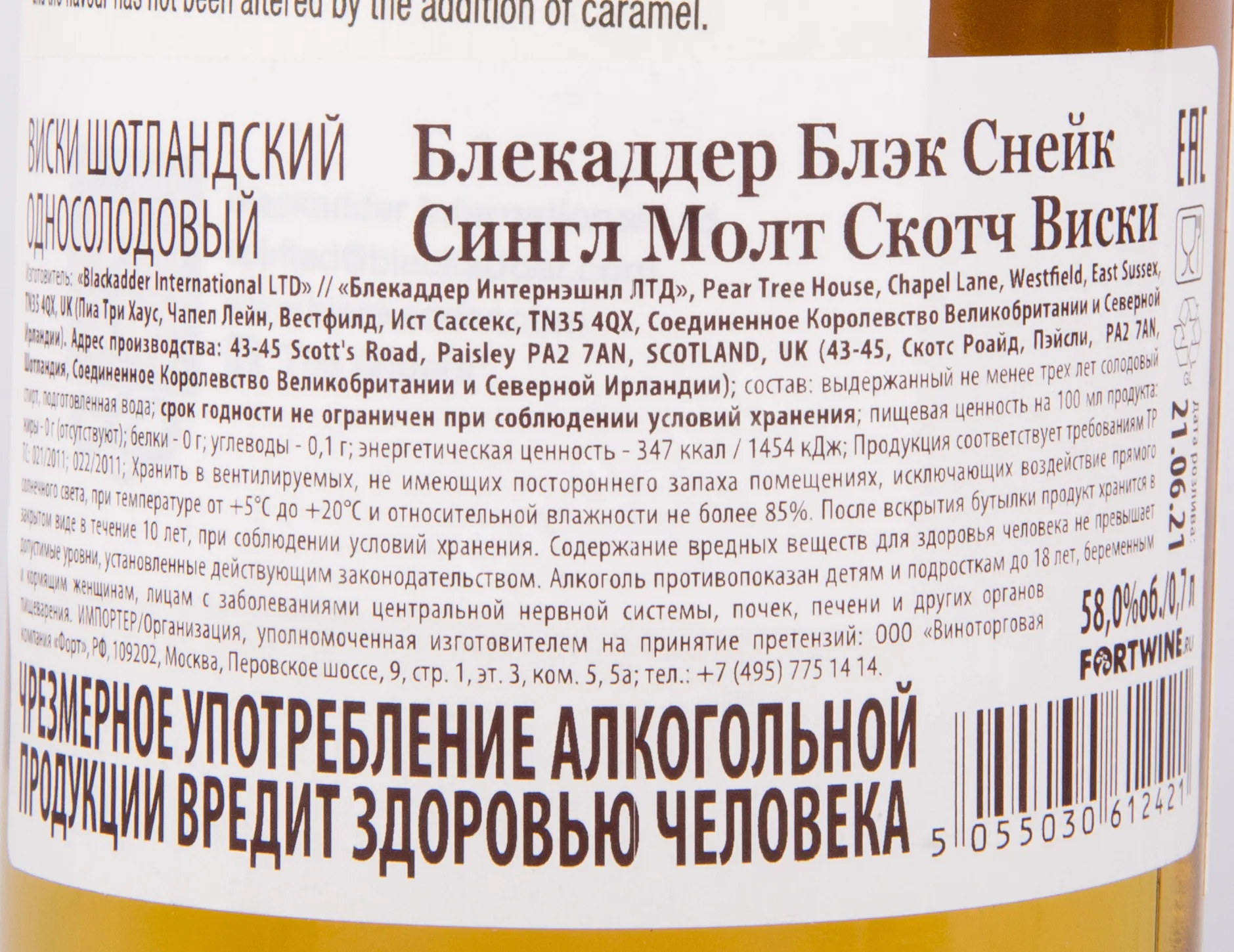 Виски Blackadder Black Snake Single Malt gift box 0.7 l – это односолодовый шотландский скотч, выпущенный лимитированным тиражом (всего 460 бутылок) в сувенирном боксе. Созревание спиртов протекает сначала в тарах из-под бурбона в течение 3-х лет, а после еще год по системе солера в барриках из-под хереса. Розлив осуществляется без применения холодной фильтрации при крепости 58%.