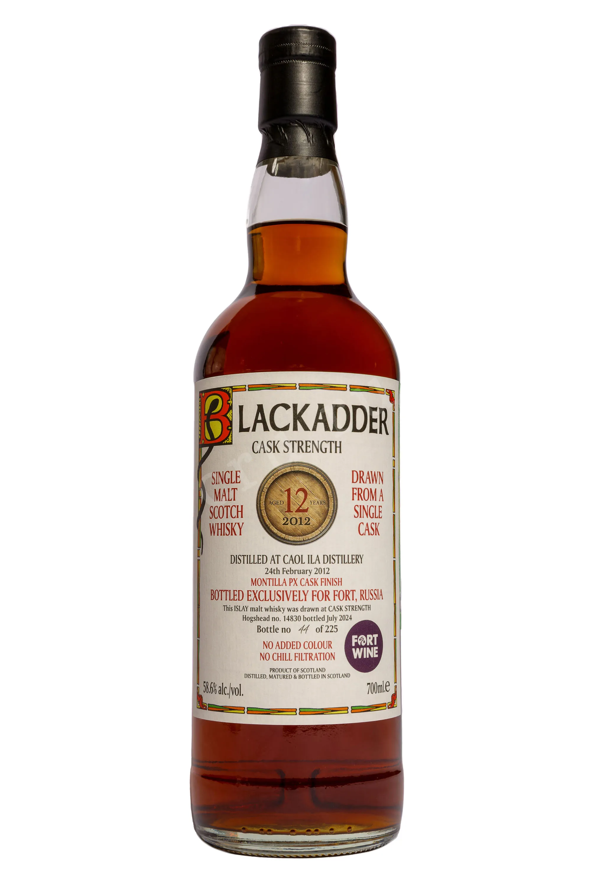 Виски Blackadder Caol Ila 12 YO 0,7 л в подарочной упаковке олицетворяет собой уникальное сочетание традиций и современности. Был разлит по заказу российской компании Fortwine независимым боттлером Блекаддер. Сингл молт дистиллирован на легендарной шотландской винокурне Каол Ила в Спейсайде и выдерживался в специально подобранных бочках 12 лет. Виски финишировал в бочках из-под крепленого вина Монтилья-Морилес Педро Хименес, благодаря чему дымно-солено-морские нотки в букете дополнились фруктовыми оттенками. Скотч разлили из одной бочки (хогсхед) №14830 в июле 2024 года при бочковой крепости 58,6% без предварительной фильтрации. Партия составила всего 225 бутылок.