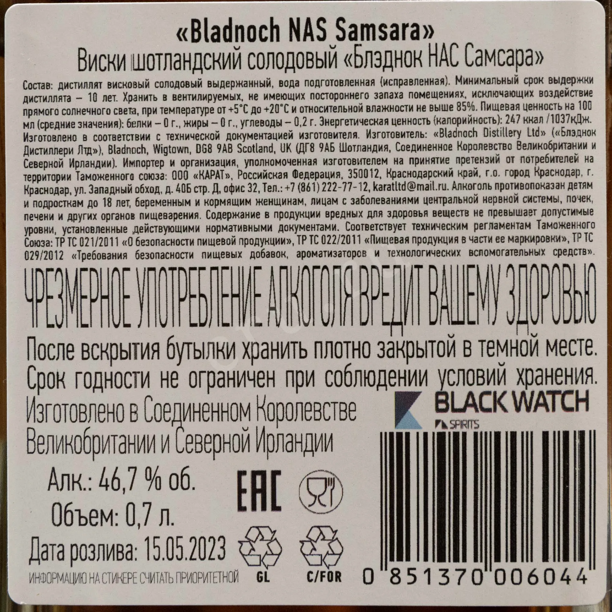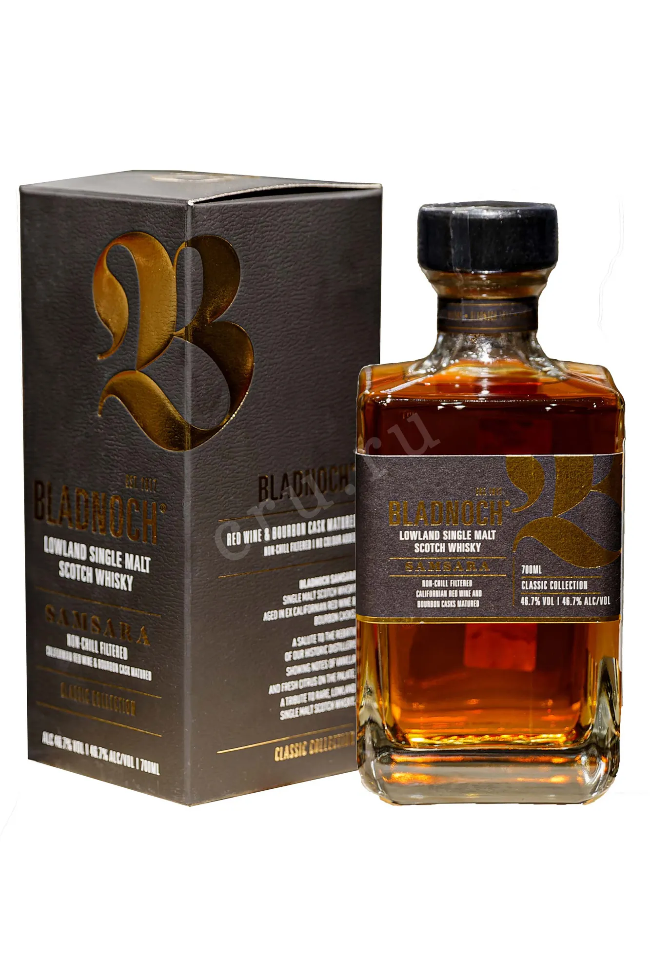 Виски Bladnoch Samsara 0,7 л в подарочной упаковке — односолодовый шотландский образец из региона Лоулендс. Напиток выпускается старейшей винокурней региона, основанной в 1817 году на берегах реки Бладнок. Название Самсара означает «перерождение». Для выдержки дистиллята используют американские дубовые бочки, ранее хранившие бурбон, и емкости из-под калифорнийского красного вина. Это придает скотчу необычный, сложный вкус и аромат. Бутылка в подарочной упаковкеимеет строгий дизайн с характерными чертами классического стиля Шотландии.