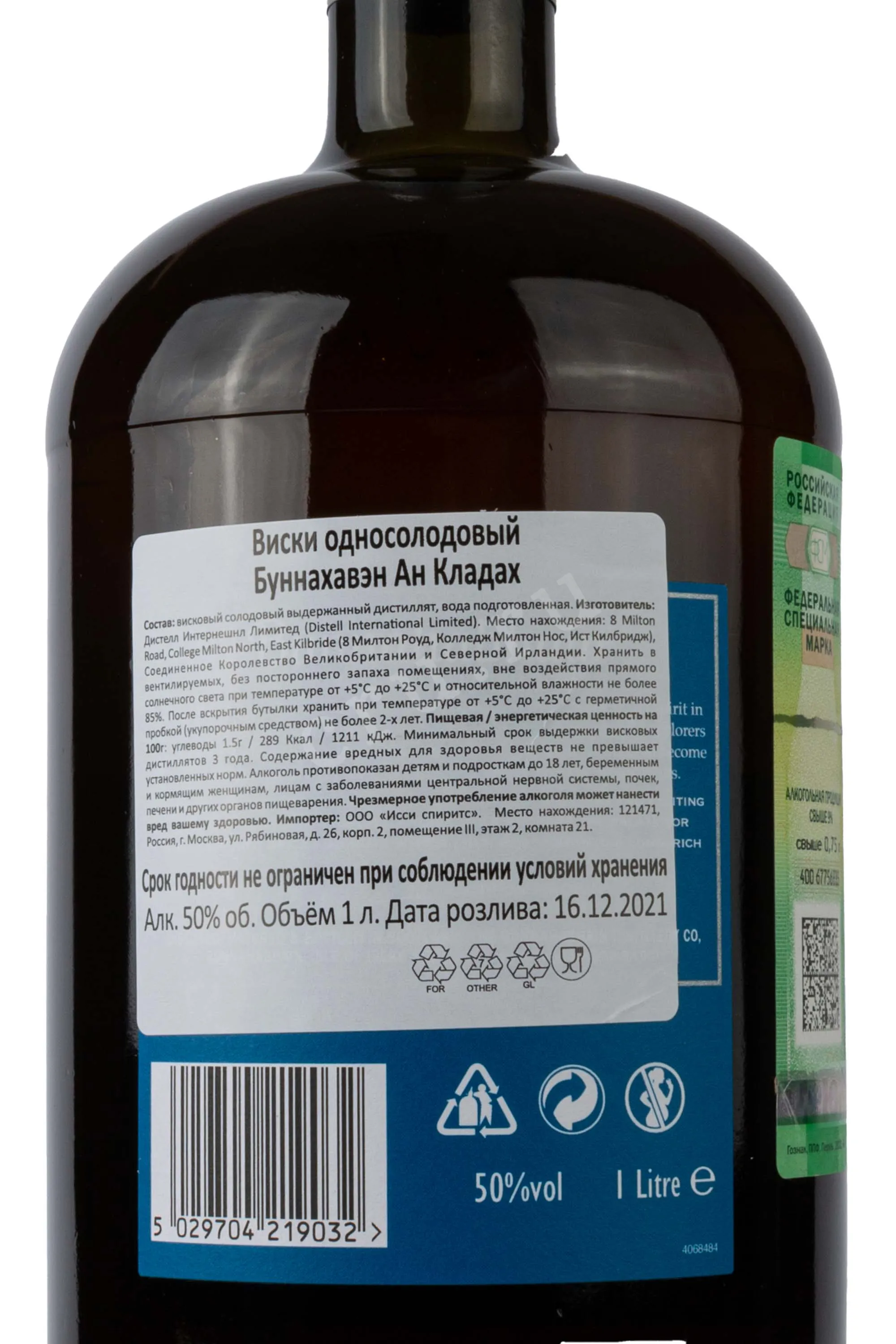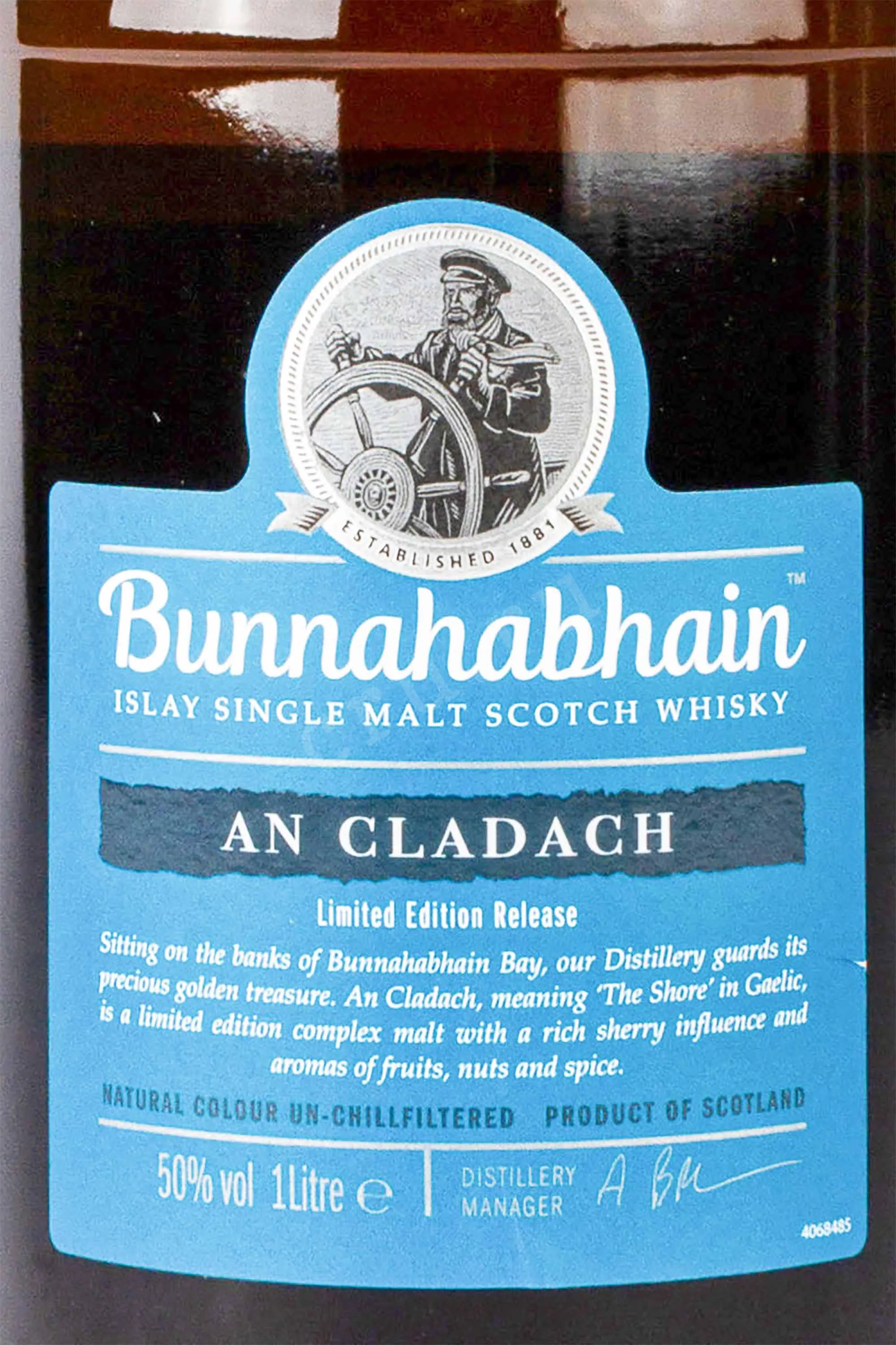 Виски Bunnahabhain An Cladach 1 л в тубе — сингл молт с шотландского острова Айла. Он обладает мягким, насыщенным характером и производится без холодной фильтрации. Название Ан Кладах переводится как «берег». Вискикурня Буннахавэн находится на побережье и использует неокуренный солод. Двойная дистилляция осуществляется в традиционных медных кубах. Напиток выдерживается в основном в хересных бочках, что придаёт ему легкую фруктовую сладость и глубину вкуса. Особенностью виски является натуральный золотисто-янтарный цвет (не подкрашивается, не фильтруется) и крепость 50%. Буннахавэн Ан Кладах был высоко оценён экспертами на международных конкурсах и получил медали International Spirits Challenge и The Scotch Whisky Masters.