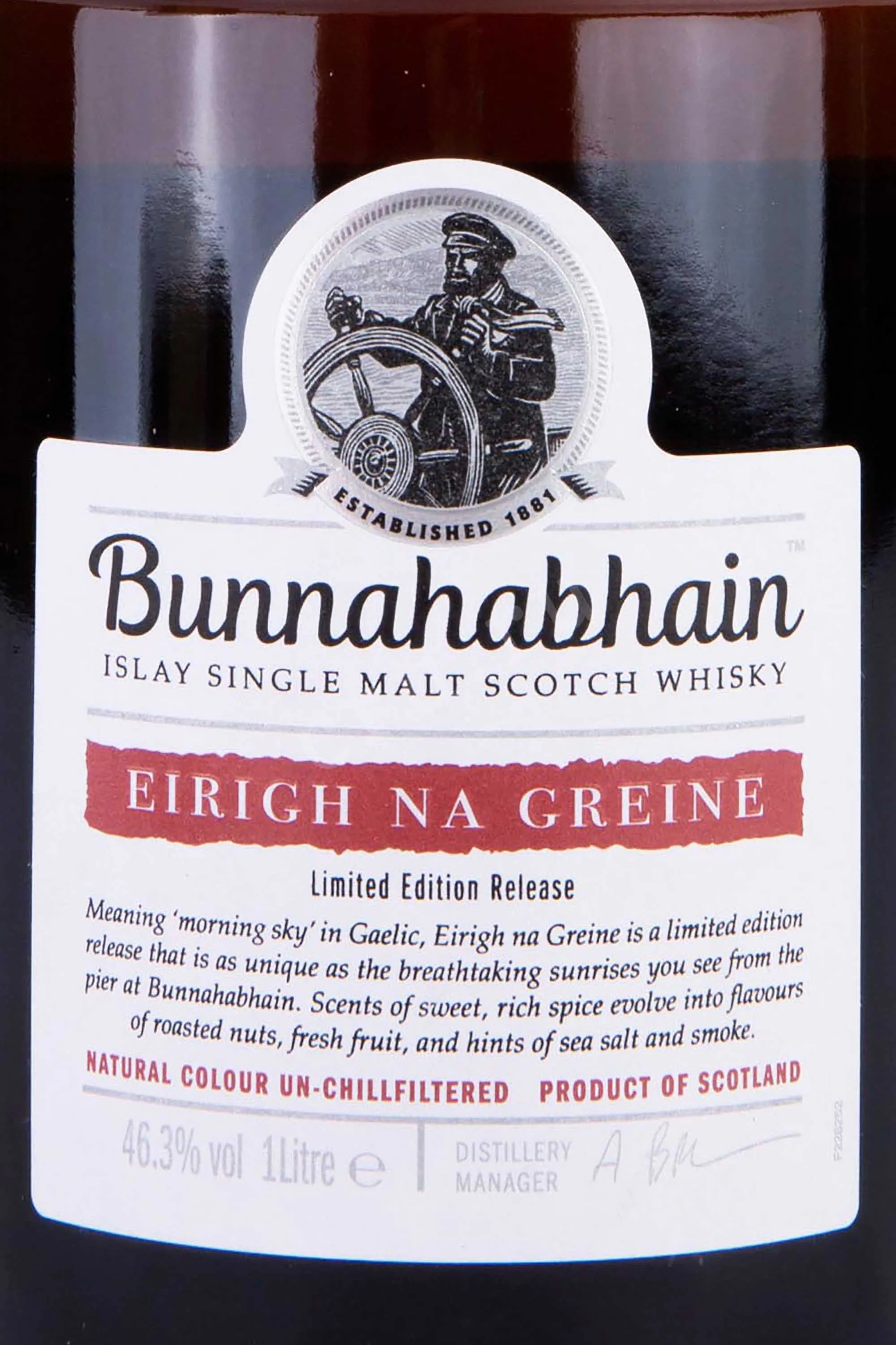 Виски Bunnahabhain Eirigh Na Greine 1 л в тубе — односолодовый скотч с ярко выраженным островным характером. Название «Эири не Грэйни» переводится с гаэльского языка как «Утреннее небо». Сингл молт созревал в бочках из-под красных вин Франции и Италии, приобретая фруктовую насыщенность и нежную пряность. Произведён на острове Айла и разлит без применения холодной фильтрации при крепости 46,3 %. Виски завоевал ряд наград, среди которых золотые медали престижного конкурса ISC, серебро и бронза International Wine & Spirit Competition и World Whiskies Awards. Критики отмечают его «сочный, ягодный профиль с морской солью и орехами». Скотч попал в рейтинги Whisky.com с оценкой около 90/100.