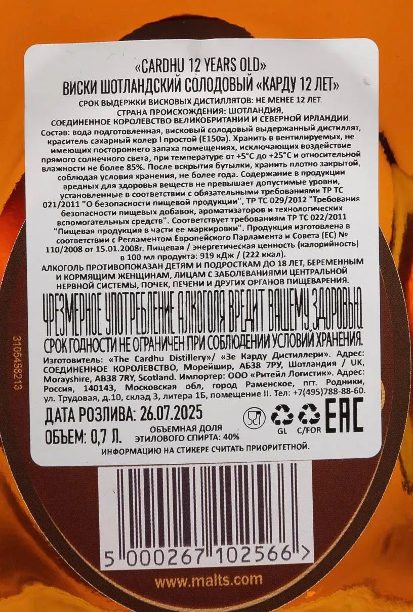 Виски Cardhu 12 лет 0.7 л — классический односолодовый скотч из региона Спейсайд. Стиль мягкий и округлый. Напиток известен своей деликатностью и сбалансированным характером. В производстве используется солодовый ячмень, ферментация проходит медленно, что помогает сохранить чистоту вкуса. Дистилляция ведётся в медных перегонных кубах традиционной формы. Выдержка длится не менее 12 лет в дубовых бочках, преимущественно из-под бурбона, благодаря чему виски приобретает сладковатые и сливочные оттенки. Карду 12-летний считается одним из самых элегантных представителей Спейсайда и часто рекомендуется как для знакомства с категорией single malt, так и для опытных ценителей. Уникальность напитка подтверждена наградами международного конкурса IWSC.