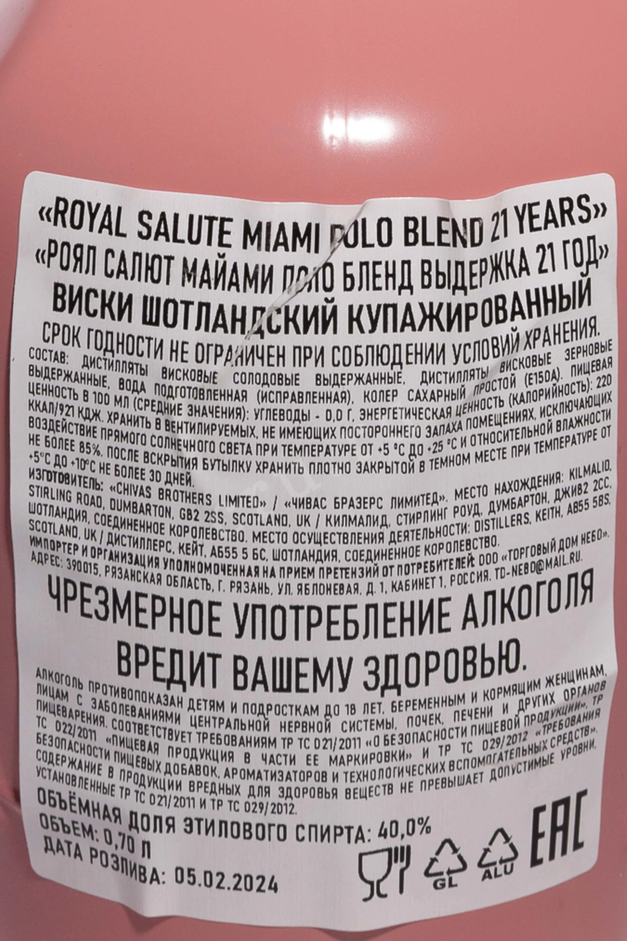 Виски Chivas Regal Royal Salute Miami Polo Edition 21 год в подарочной упаковке 0.7 л — премиальный купажированный скотч из коллекции Роял Салют, посвящённой миру поло и его культовым локациям. Купаж составлен из спиртов с выдержкой не менее 21 года. Созревание проходило в двух типах бочек: из-под бурбона первого наполнения и из-под ржаного виски. Первый тип формирует мягкость и округлый профиль, второй добавляет структуру и сдержанную пряность. Виски отличается сложным, но уравновешенным характером, без излишней тяжести. Образ релиза вдохновлён Майами, который давно связан с поло в США. Это отразилось в современном и лёгком стиле напитка при сохранении классической выдержанности. Лимитированный выпуск и керамический декантер розового цвета, отсылающий к архитектуре ар-деко, подчёркивают коллекционную ценность напитка.