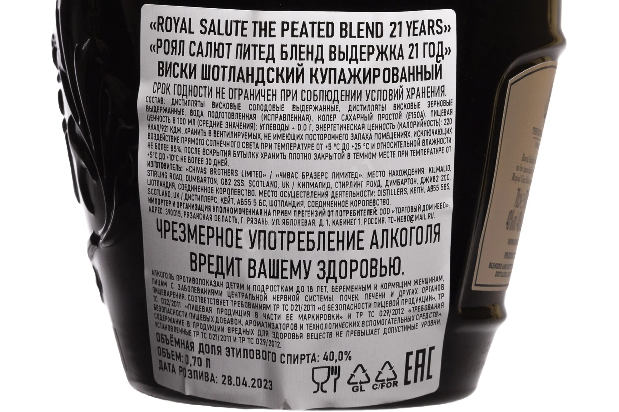 Виски Chivas Regal Royal Salute Peated Blend 21 год в подарочной упаковке 0.7 л — редкий купажированный скотч с выраженным дымным характером, созданный из отборных солодовых и зерновых дистиллятов с большой выдержкой. Он относится к линейке Роял Салют, которая была впервые представлена в 1953 году в честь коронации королевы Елизаветы II и получила название в память о торжественном салюте из 21 залпа. В версии Питед Бленд классическая элегантность вкуса дополнена нюансами торфяного солода, что придаёт глубину и современное звучание. Производство основано на строгом отборе выдержанных спиртов и длительной выдержке в дубовых бочках, позволяющей сохранить баланс между дымными, сладкими и пряными оттенками. Уникальность релиза подчёркивается коллекционным фарфоровым графином ручной работы, выполненным на британской мануфактуре Wade Ceramics, а также признанием профессионального сообщества. Этот виски был отмечен медалями конкурсов International Spirits Challenge и International Wine & Spirit Competition.