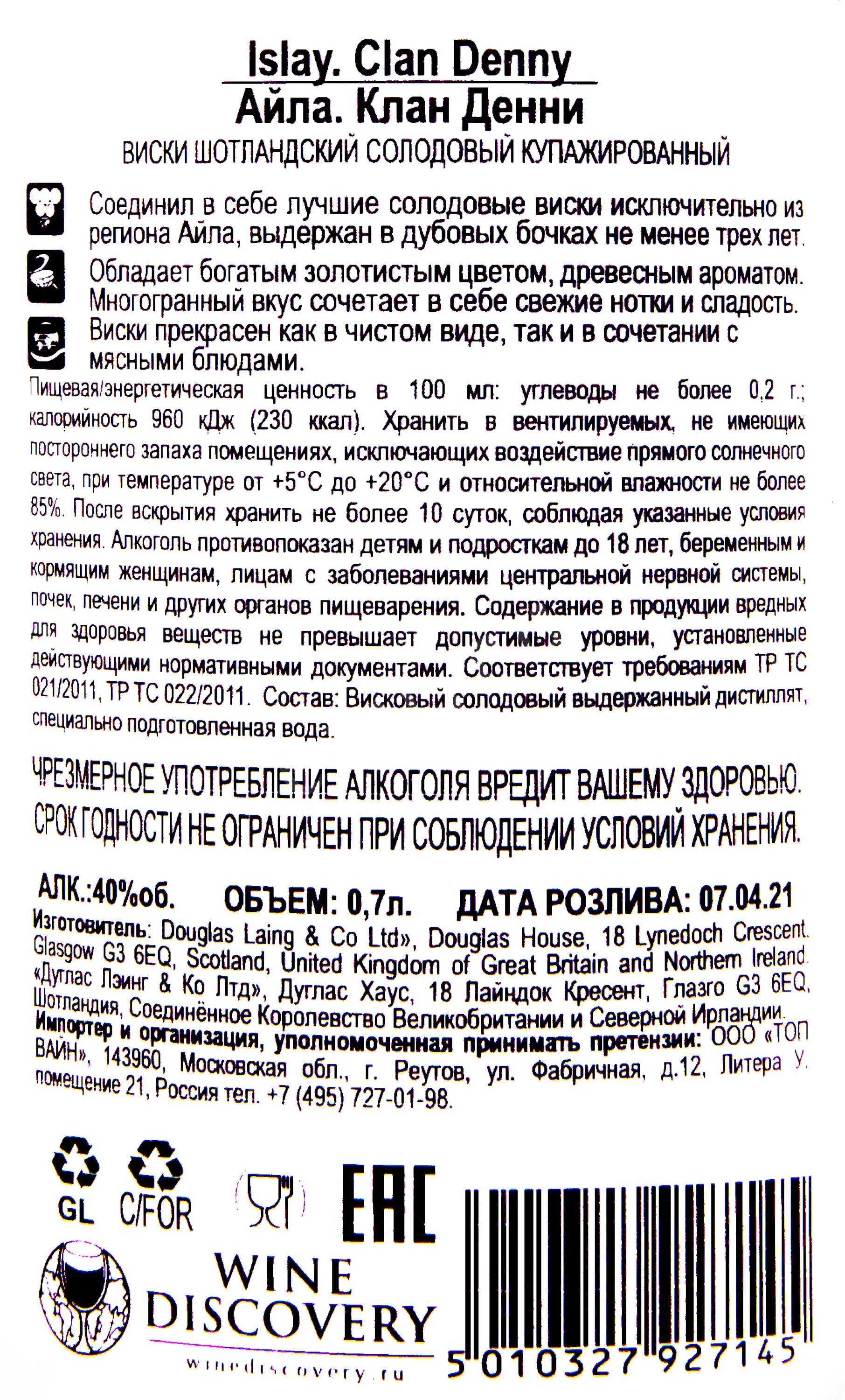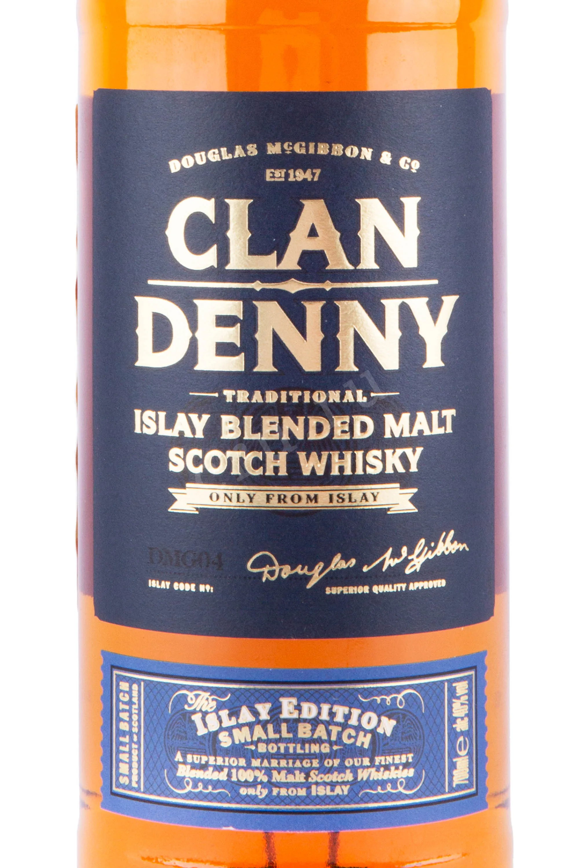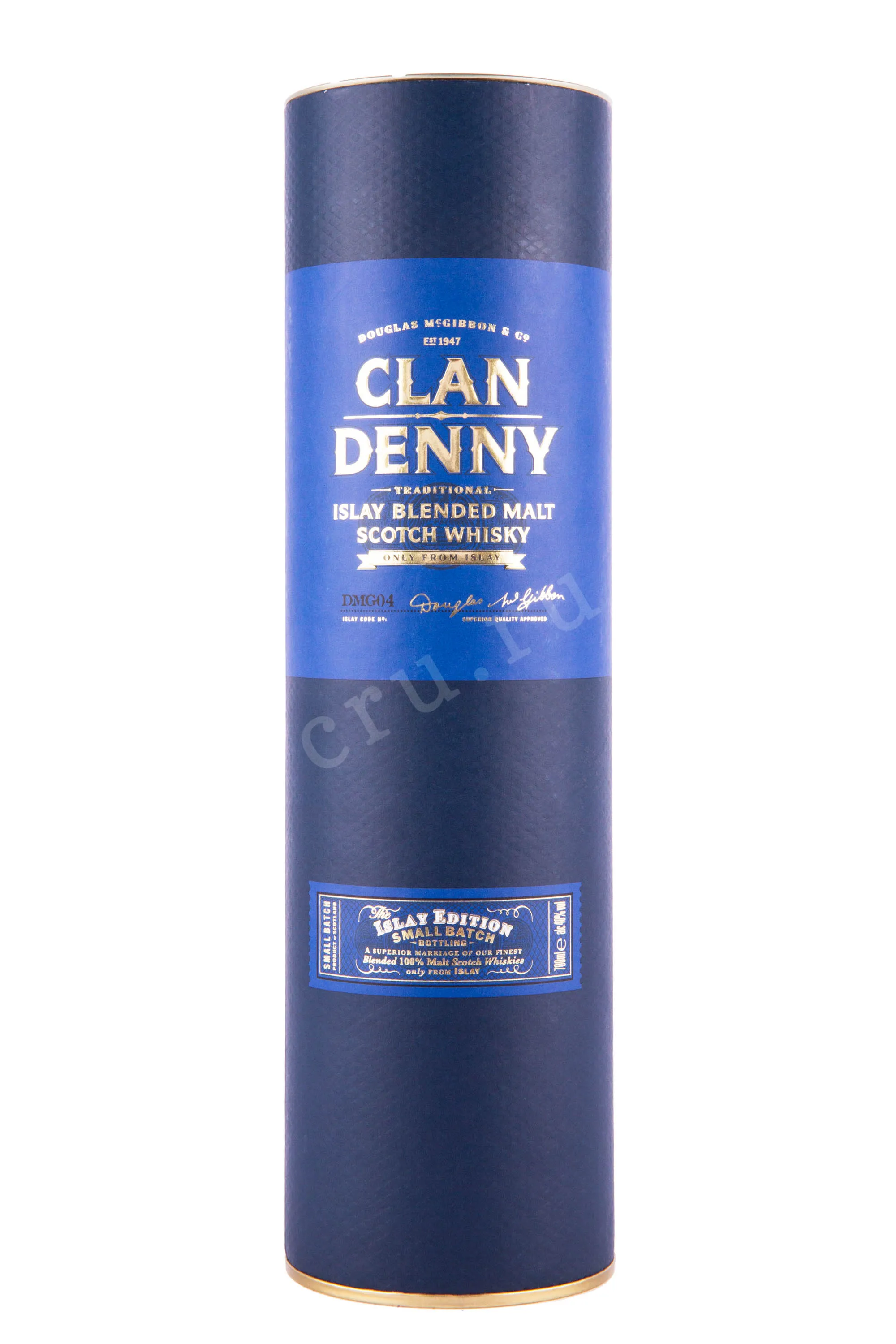 Виски Clan Denny Islay in tube 0.7 l – это купажированный солодовый алкоголь от шотландской компании, изготовленный из сырья с острова Айла. Спирты старели в течение 3-х лет в дубовых барриках из-под бурбона. Виски был бутилирован без холодной фильтрации при крепости 40%. Готовый напиток выпускается в брендовой сувенирной тубе. Джим Мюррей в своей «Библии виски» оценил скотч на 86.5 балла.