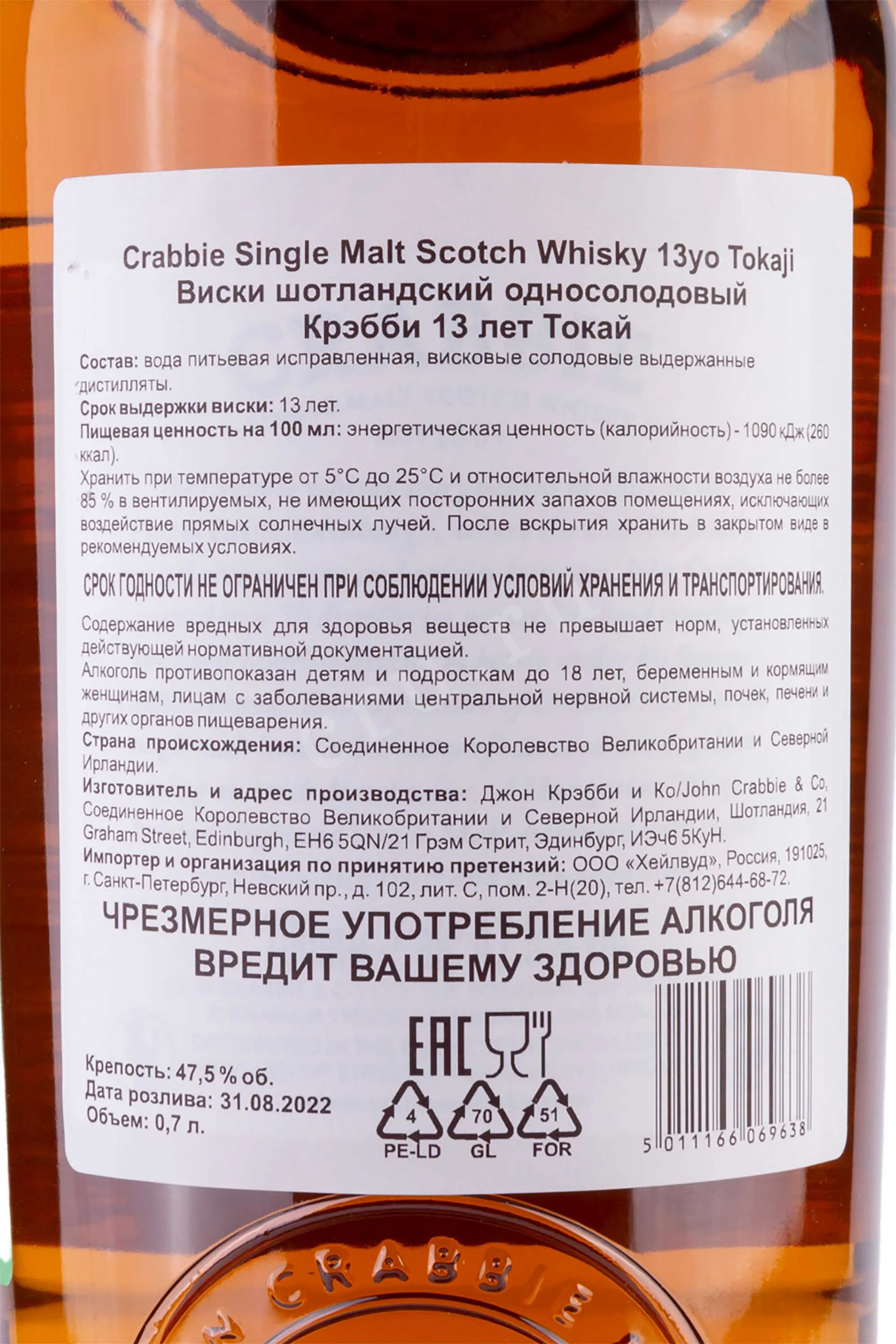 Виски Crabbie Tokaji 13 лет 0,7 л в подарочной упаковке — крафтовый сингл молт из Хайленда, выпущенный ограниченным тиражом. Произведен традиционным способом дистилляции, особенность заключается в двойной медленной выдержке: сначала в бочках из-под бурбона, а на финишном этапе — в бочках из-под венгерского сладкого токайского вина. Уникальность характера этого виски определяется редким сочетанием традиционной шотландской технологии и влияния токайских бочек. Скотч удостоен золотой медали на престижном международном конкурсе и получил высокие оценки в профильных изданиях. Критики отмечают его мягкость и комплексность вкуса. Этот сингл молт вошел в десятку лучших шотландских односолодовых сортов рейтинга Whisky Advocate.