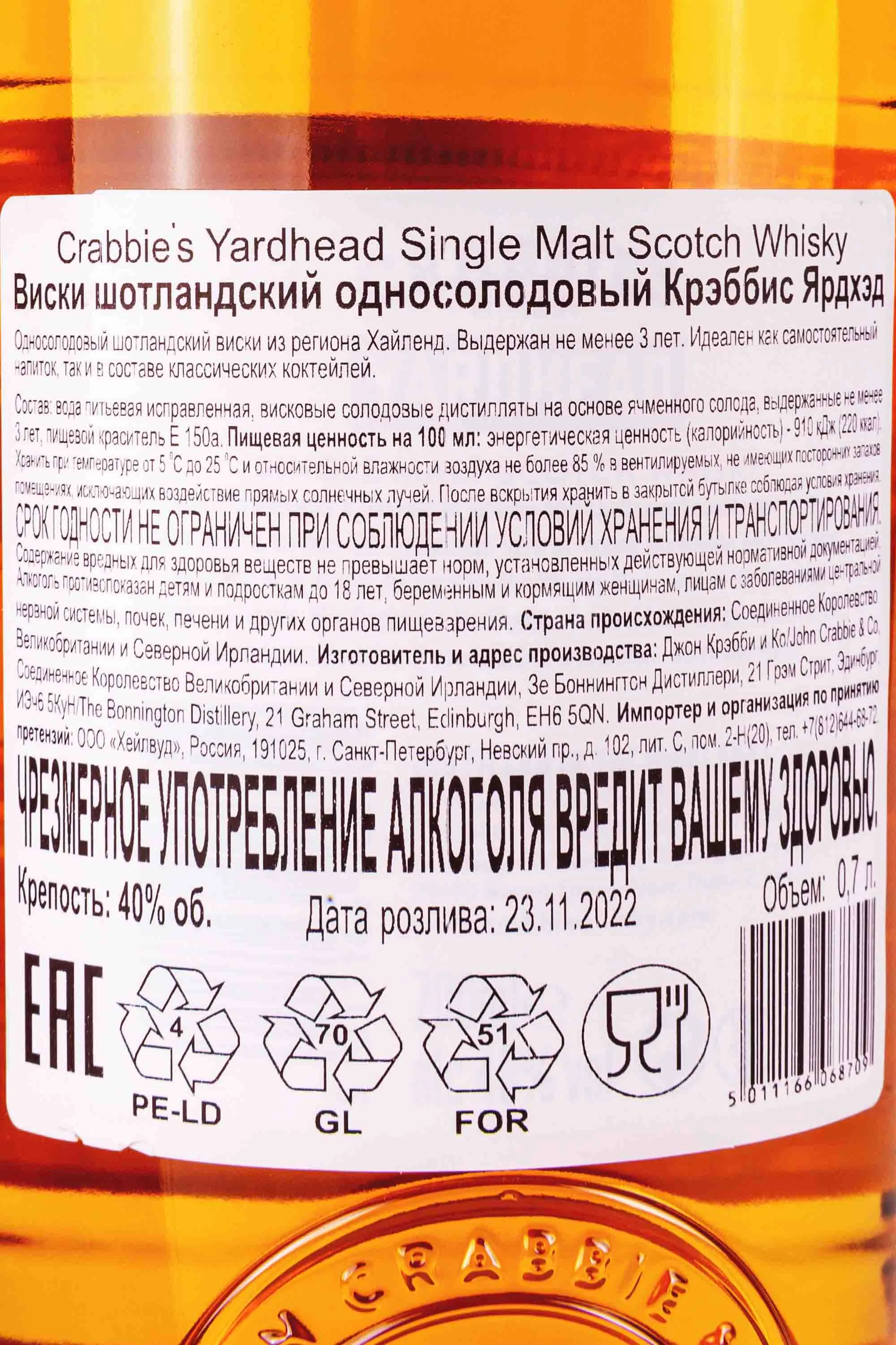 Виски Crabbies Yardhead 0.7 л. был создан на старейшей шотландской винокурне Джона Крабби в Эдинбурге, где мастера использовали особые медные перегонные кубы для получения чистого, насыщенного спирта с бархатистой текстурой. Для выдержки были использованы специально отобранные бочки, благодаря чему напиток приобрёл гармоничную сладость и тонкие ванильные оттенки. В процессе созревания скотч подвергался контролируемой выдержке в условиях прохладного и влажного шотландского климата, что позволило сформировать уникальный и узнаваемый профиль.