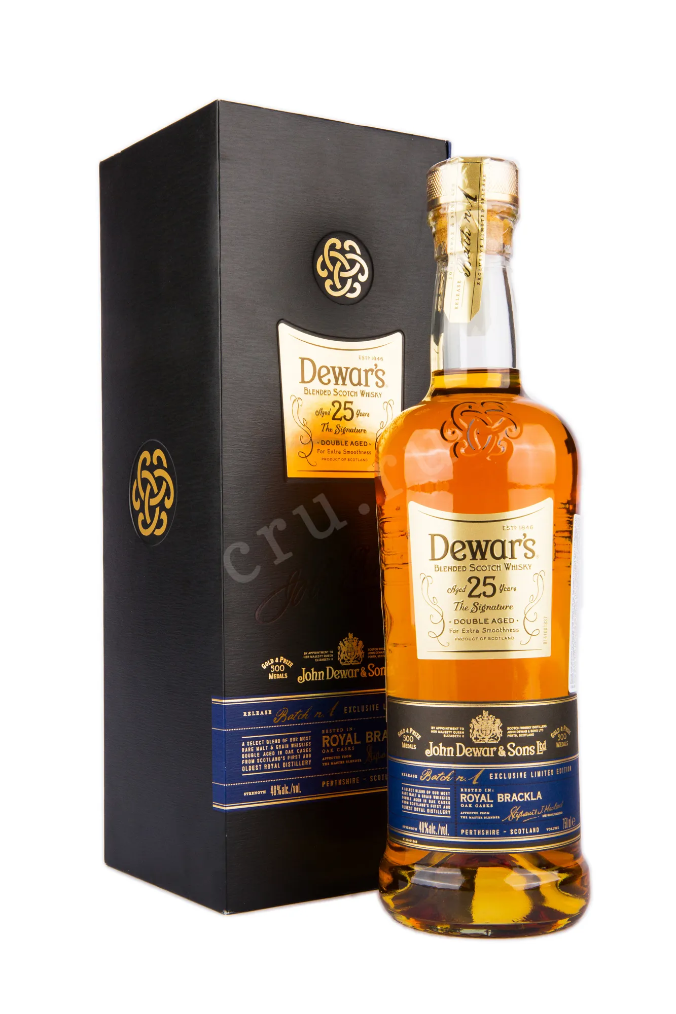 Виски Dewar`s Signature 0,7 л в подарочной упаковке — это купажированный образец премиум-класса. Напиток создан мастером купажа Томми Эйткеном на основе тщательно отобранных зерновых и односолодовых спиртов с выдержкой от 14 до 30 лет. Центральным компонентом бленда выступает 27-летний односолодовый виски с винокурни Aberfeldy. Уникальность образцу придаёт особая двойная выдержка («Double Aging»): после смешивания купаж помещают обратно в дубовые бочки для дополнительного созревания и объединения вкусовых нюансов. Каждая бутылка скотча пронумерована вручную, что подчёркивает эксклюзивность и высокое качество продукта.