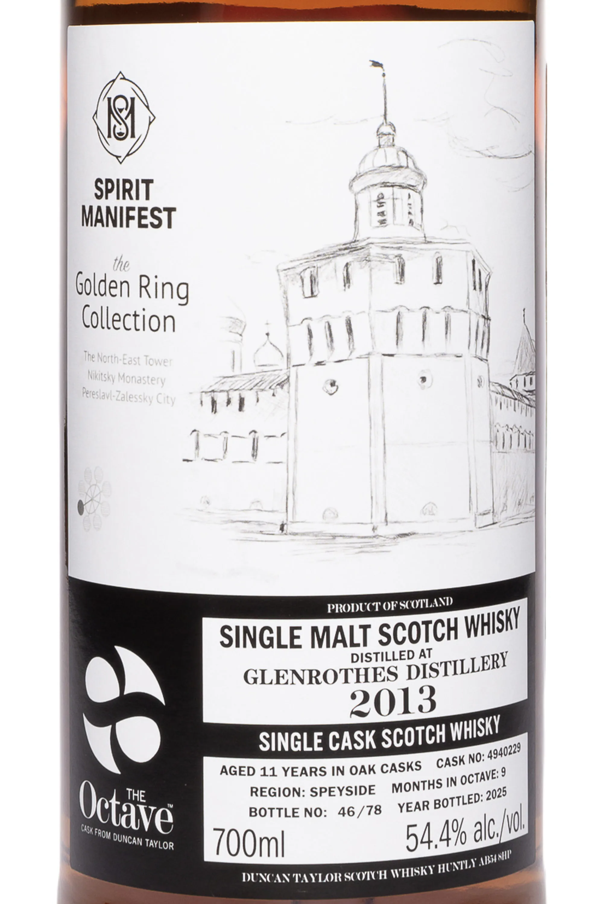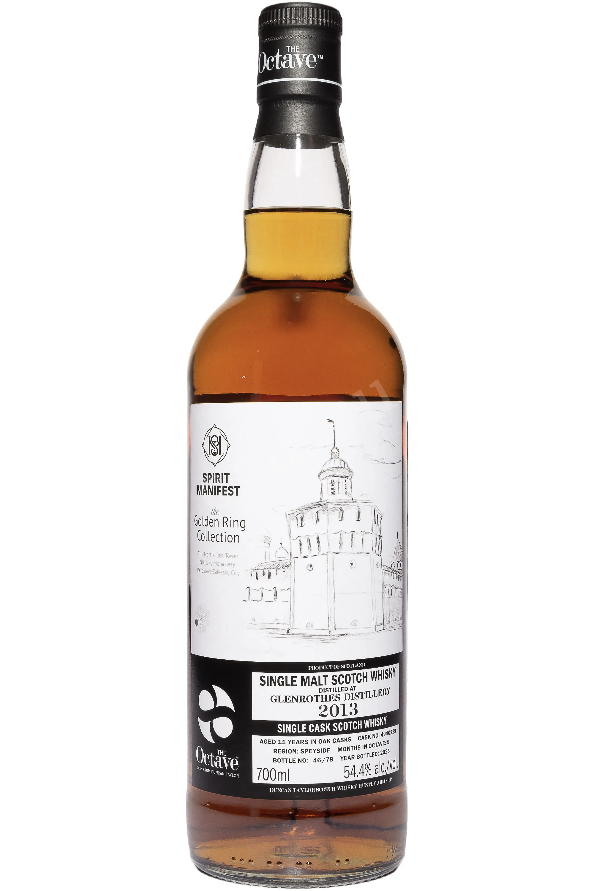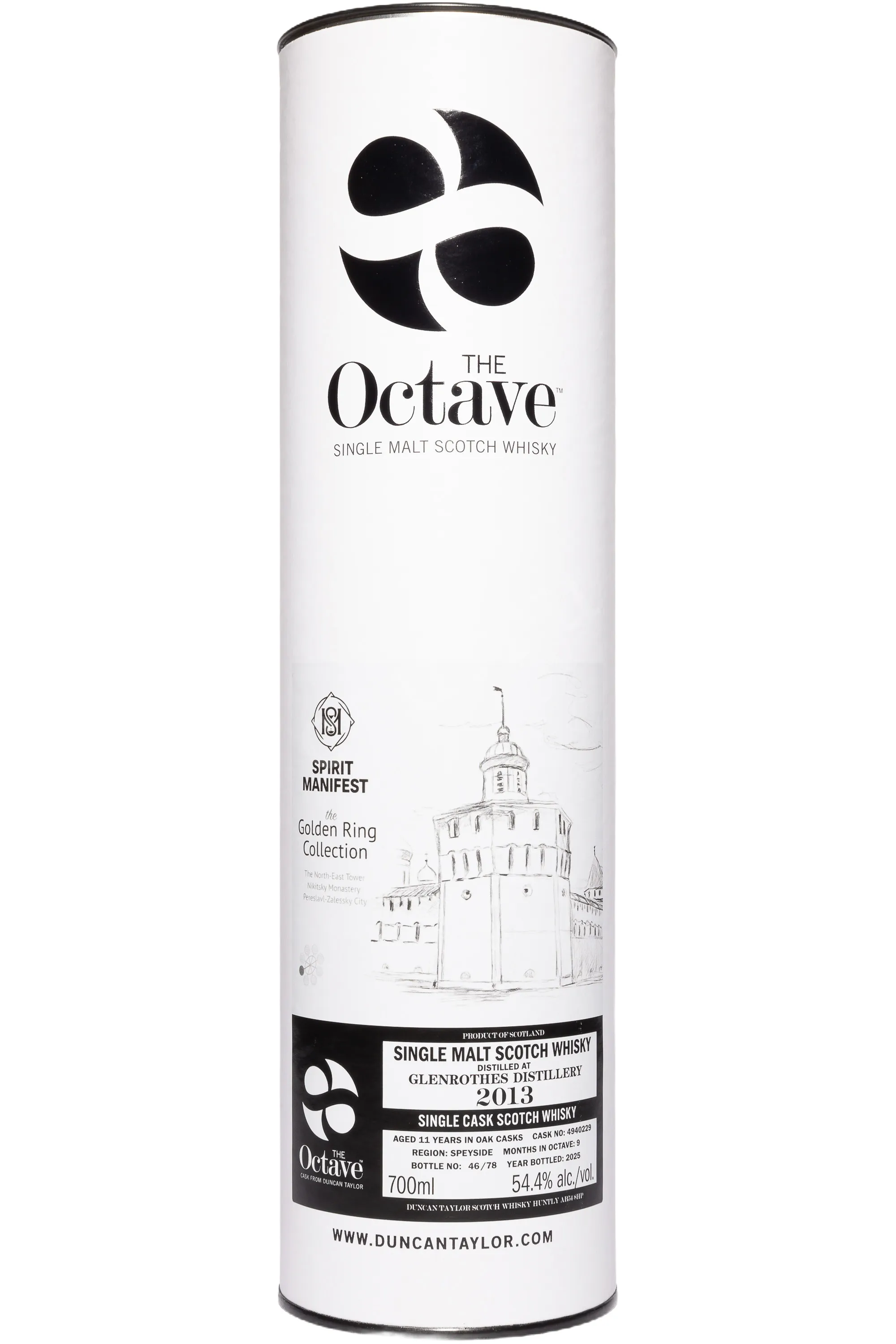 Виски The Octave Spirit Manifest Golden Ring Collection Glenrothes 11 лет в тубе 2013 0.7 л — это односолодовый скотч из региона Спейсайд, отличающийся сбалансированным характером и богатой текстурой. Дистиллят был произведён вискикурней Гленротес в 2013 году и прошёл дополнительную девятимесячную выдержку в бочке № 4940229 типа «октава», изготовленной из хересной стандартной бочки, в которой ранее хранился сорт Олоросо. Меньший формат обеспечивает более тесный контакт напитка с древесиной, что придаёт ему насыщенность и сложность. Виски разливался без холодной фильтрации (из одной бочки — 78 бутылок) и искусственных красителей, сохраняя естественный цвет и текстуру. Серия Октав Голден Ринг ценится коллекционерами за ограниченность тиража и эксклюзивность. Этот виски отмечен вниманием критиков за выразительность и гармонию, характерную для лучших образцов Speyside.