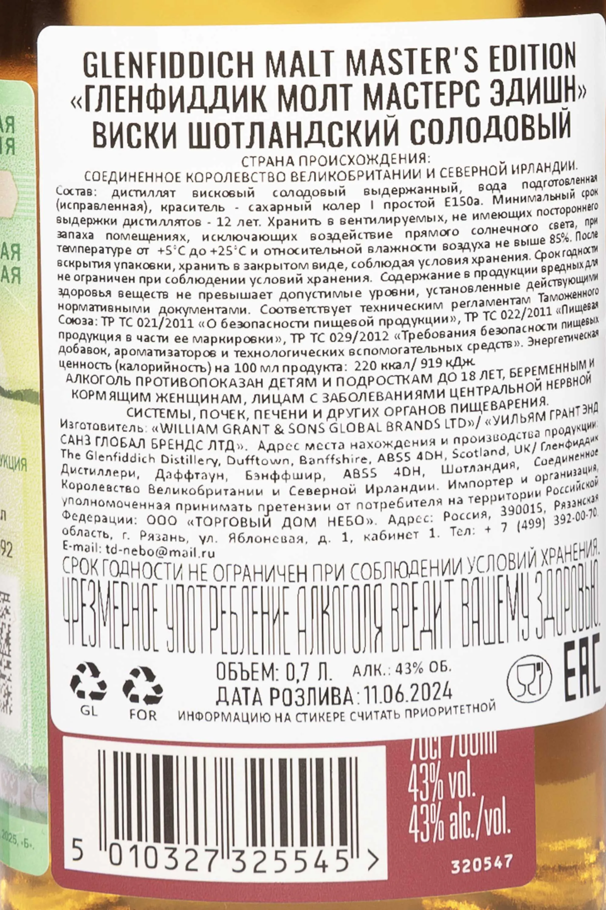 Виски Glenfiddich Malt Master Edition 0.7 л — шотландский сингл молт из региона Спейсайд, созданный мастером купажа Брайаном Кинсманом. Этот выпуск стал первым двойным выдержанным скотчем в истории винокурни Glenfiddich. Сначала дистиллят созревал около восьми лет в традиционных дубовых бочках, где формировалась основа вкуса. Затем виски проходил вторую выдержку в бочках из-под хереса, что придало ему сложный аромат и насыщенный характер. Такой метод делает напиток мягким и глубоким. Гленфиддик Молт Мастер Эдишн получил признание на международных конкурсах, включая золотые медали на International Wine & Spirit Competition и The Scotch Whisky Masters, а также серебро на International Spirits Challenge. Его считают образцом современного ремесленного подхода к классическому стилю Спейсайда.