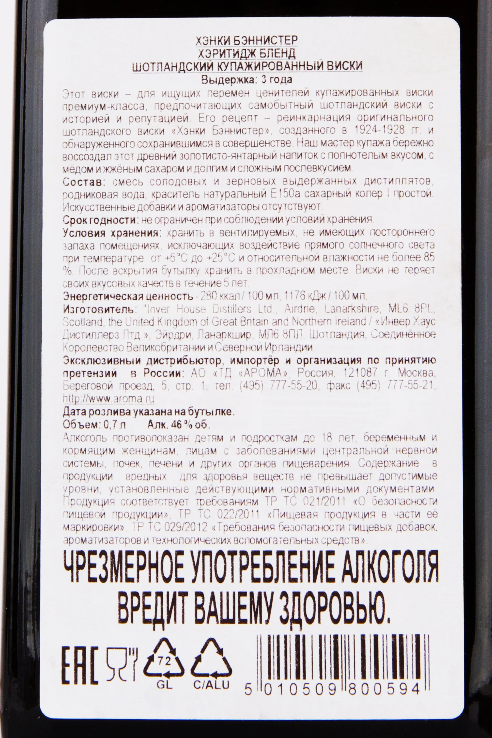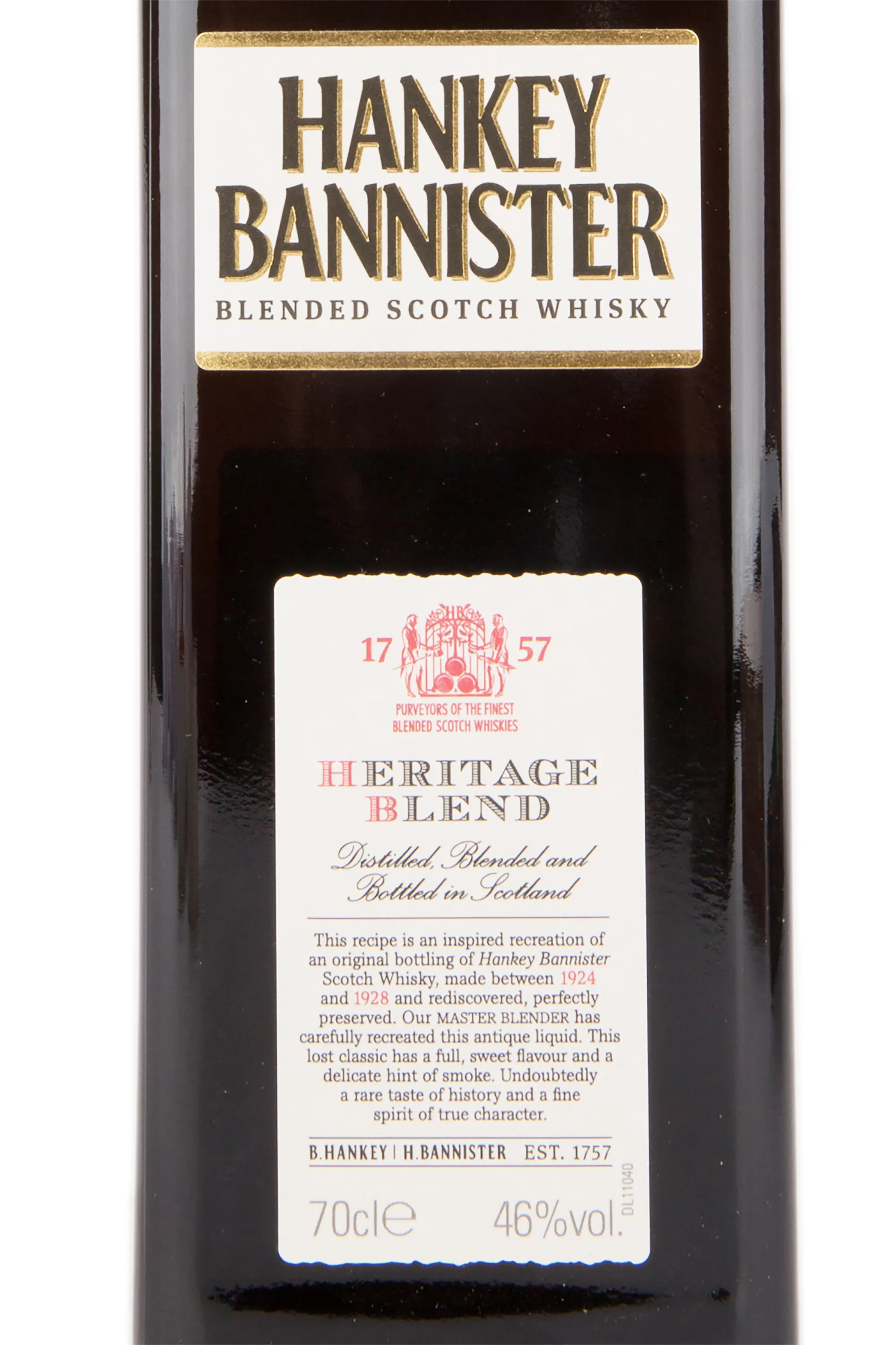 Виски Hankey Bannister Heritage Blend 0,7 л — это современное воплощение классического рецепта 1920-х годов. Напиток создаётся на основе зерновых спиртов региона Лоуленд и солодовых из Хайленда и Спейсайда. Выдерживается в дубовых бочках не менее 3 лет, разливается при крепости 46%. Этот виски неоднократно отмечен наградами на международных конкурсах, включая медали IWSC и World Whiskies Awards. Критики подчёркивают его гармоничный баланс сладости и лёгкой дымности.