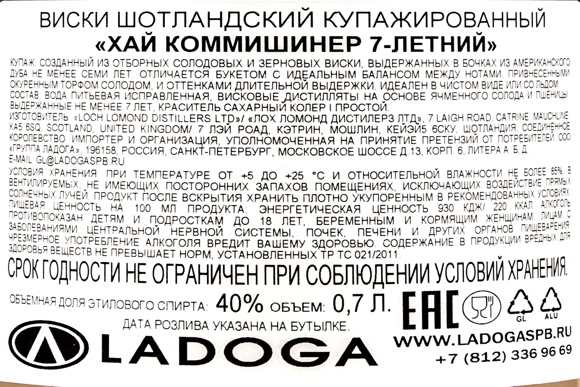 Виски High Commissioner 7 Years Old gift box 0.7 l – это купажированный алкоголь от шотландской компании, выпущенный в стильной сувенирной упаковке. Напиток изготовлен из солодовых и зерновых спиртов, полученных традиционным методом двойной перегонки, и выдержан в течение 7 лет в барриках из белого американского дуба. Бутилирование осуществляется после применения холодной фильтрации. Виски крепостью 40% завоевал несколько серебряных и бронзовую медали на конкурсах спиртного в Великобритании и США.