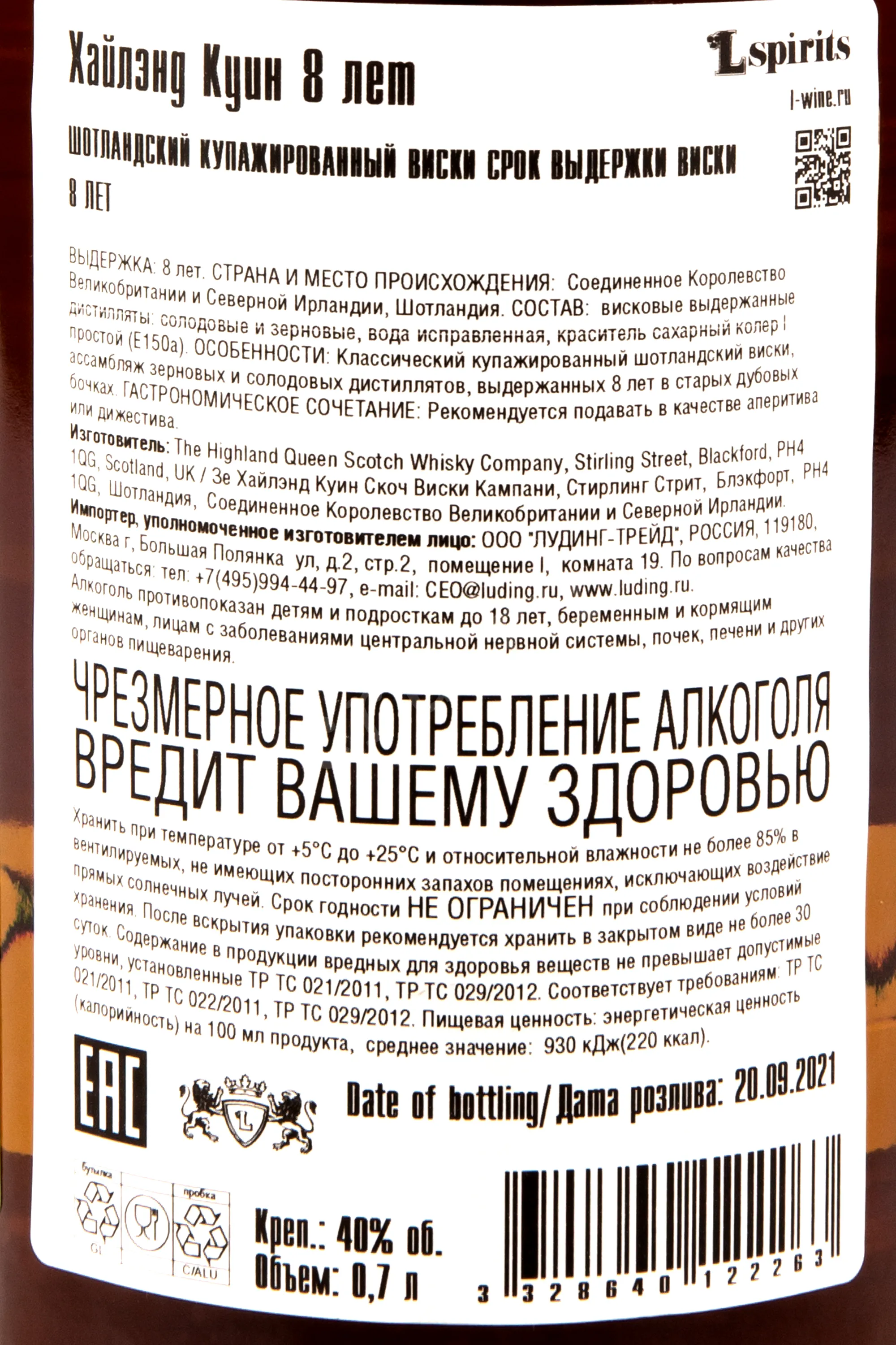 Виски Highland Queen Majesty 8 Years Old gift box 0.7 l – это шотландский купажированный скотч, выпускаемый в стильных сувенирных боксах. Изготавливают напиток классическим методом двойной перегонки, с последующим старением спиртов в старых дубовых тарах не менее 8 лет. После виски разливают по бутылкам с применением холодной фильтрации. Скотч был удостоен нескольких серебряных медалей на дегустационных конкурсах в Лондоне, а знаменитый критик виски Джим Мюррей оценил этот алкоголь на 89.5 балла.