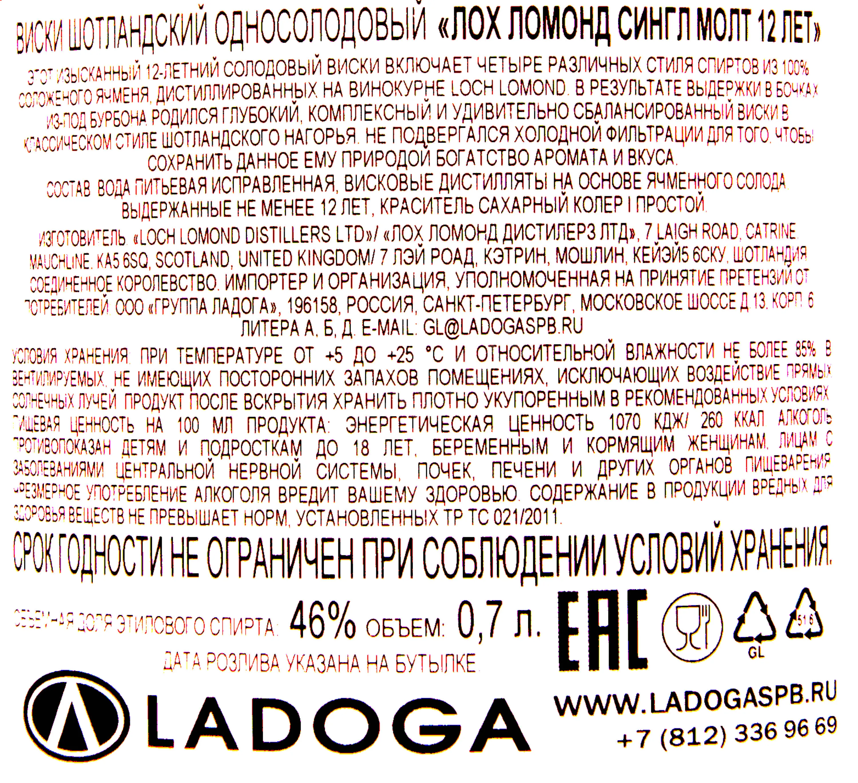 Виски Loch Lomond 12 Years Old gift box 0.7 l – это односолодовый скотч от шотландского производителя, представленный в ярких сувенирных упаковках. Созревание спиртов протекает в дубовых тарах трех типов: из-под бурбона, повторного обжига и повторного наполнения в течение 12 лет. Розлив осуществляется без применения холодной фильтрации при крепости 46%. Скотч был отмечен несколькими медалями на конкурсах спиртного в Лондоне, Сан-Франциско и Берлине, а также был оценен на 93.5 балла вискарным критиком Джимом Мюрреем.
