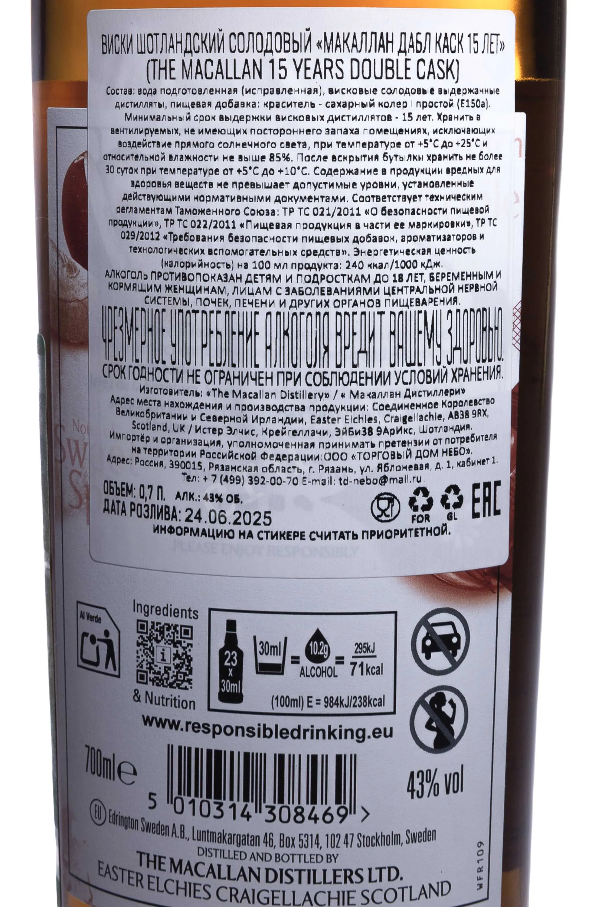 Виски Macallan 15 лет Double Cask 0.7 л — односолодовый скотч из Спейсайда с ровным, теплым характером и выразительным балансом. Он создается одной из самых известных вискикурен в Шотландии. Уникальный стиль сингл молта формируется благодаря выдержке в дубовых бочках 2 типов: американских и европейских (из-под хереса), изготовленных вручную. Белый американский дуб смягчает профиль и добавляет сладкие оттенки, европейский усиливает структуру и пряность. Выдержка длится не менее 15 лет, после чего виски разливают при крепости 43%. Серия Дабл Каск объединяет два подхода к выдержке в одном купаже, сохраняя узнаваемость стиля дома Макаллан дома и добавляя вкусу округлость.