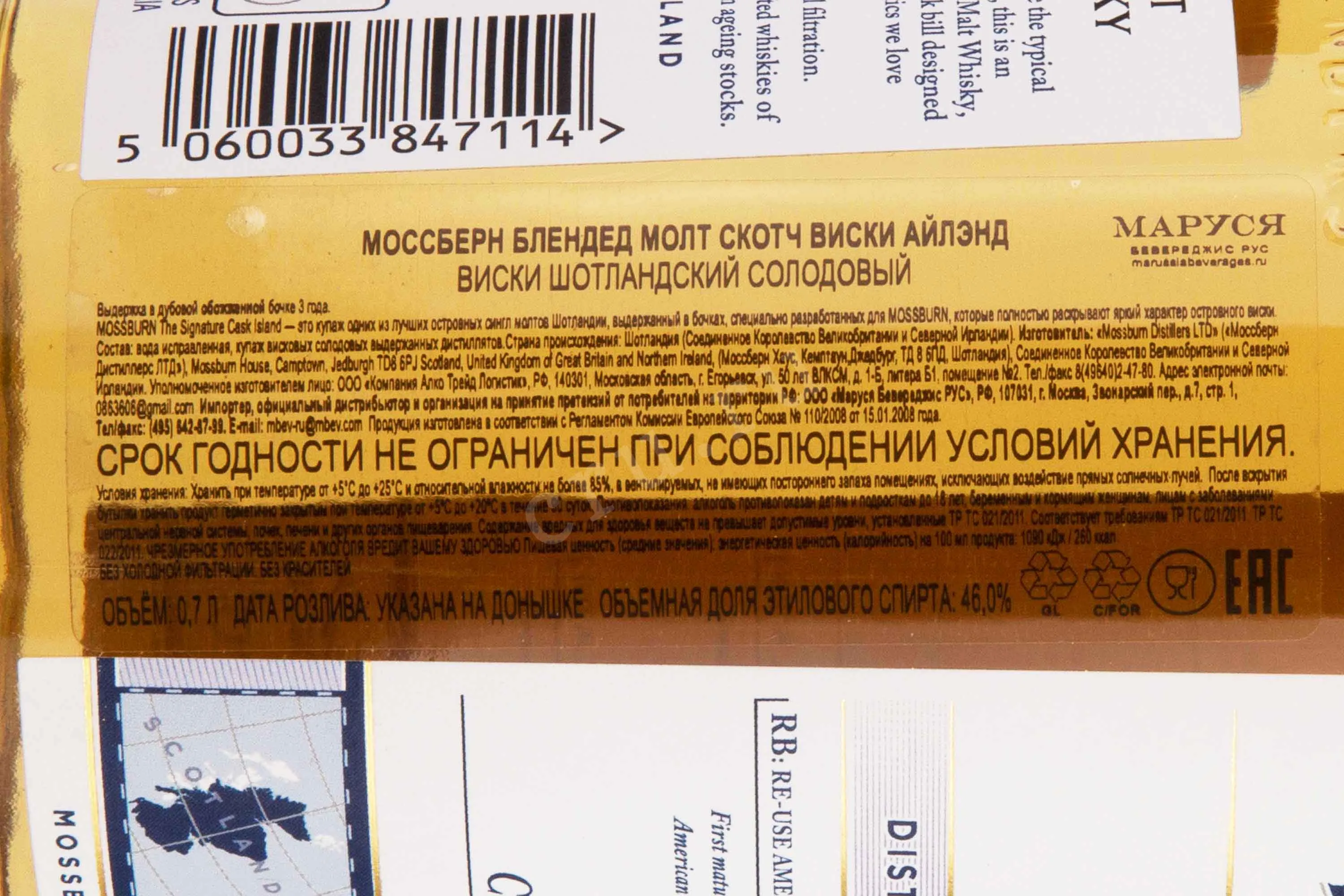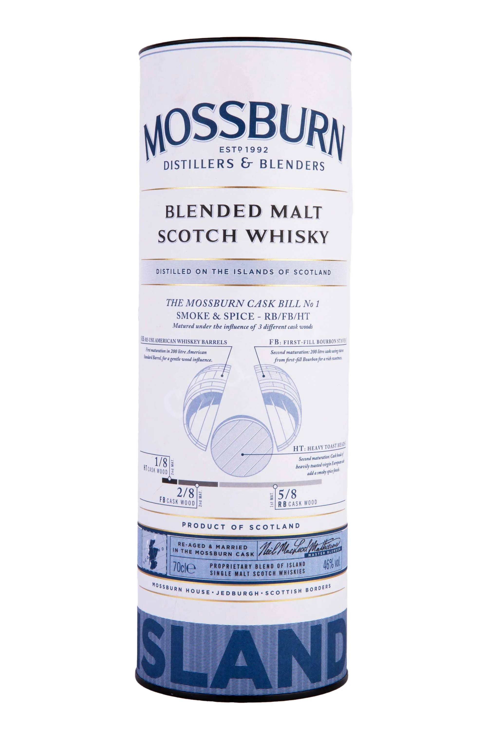 Виски Mossburn Island 3 года 0,7 л в подарочной упаковке — шотландский напиток с ярким островным характером. Этот купаж собирается из зерновых и солодовых спиртов, произведённых на островах Шотландии, и выдерживается не менее трёх лет. Особенность технологии — двойная выдержка. Сначала дистилляты созревают в традиционных бочках из американского дуба объёмом около 200 литров, а затем — в специально подготовленных бочках первого наполнения из-под бурбона, в которых крышки заменены на обожжённый европейский дуб. В результате получается скотч с насыщенным, но сбалансированным букетом. Перед розливом бленд не подвергается холодной фильтрации и не содержит красителей.