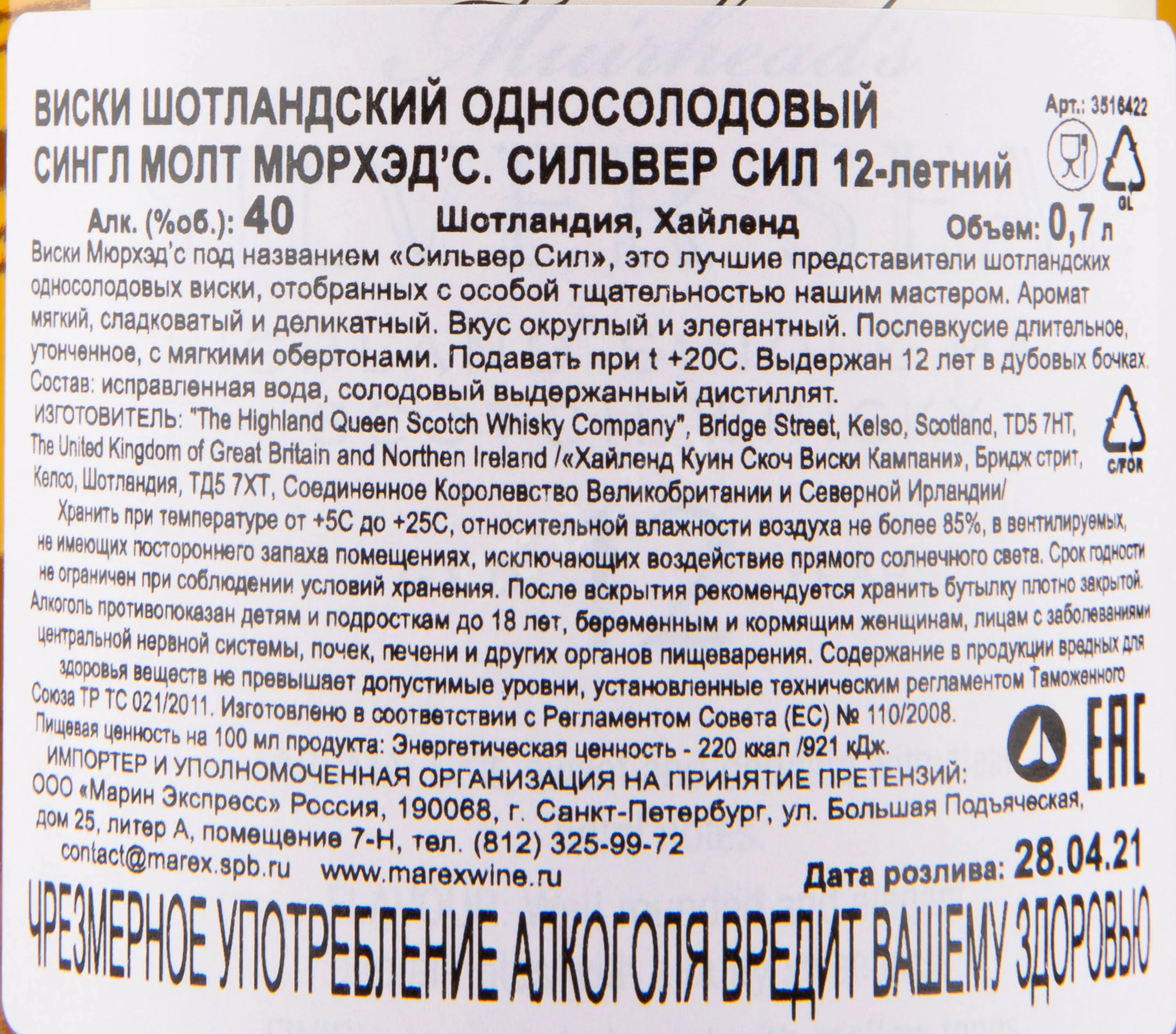 Виски Muirheads Silver Seal 12 лет 0.7 л — классический односолодовый скотч с богатым букетом и сбалансированным характером. Он производится с использованием традиционных медных перегонных кубов и выдерживается в дубовых бочках, преимущественно из-под бурбона. Благодаря длительному созреванию виски приобретает характерную глубину и многогранность. Отмечается экспертами за стабильное качество, мягкость вкуса и гармоничный профиль. Неоднократно входил в обзоры и рейтинги как достойный представитель своего класса с разумной ценой.