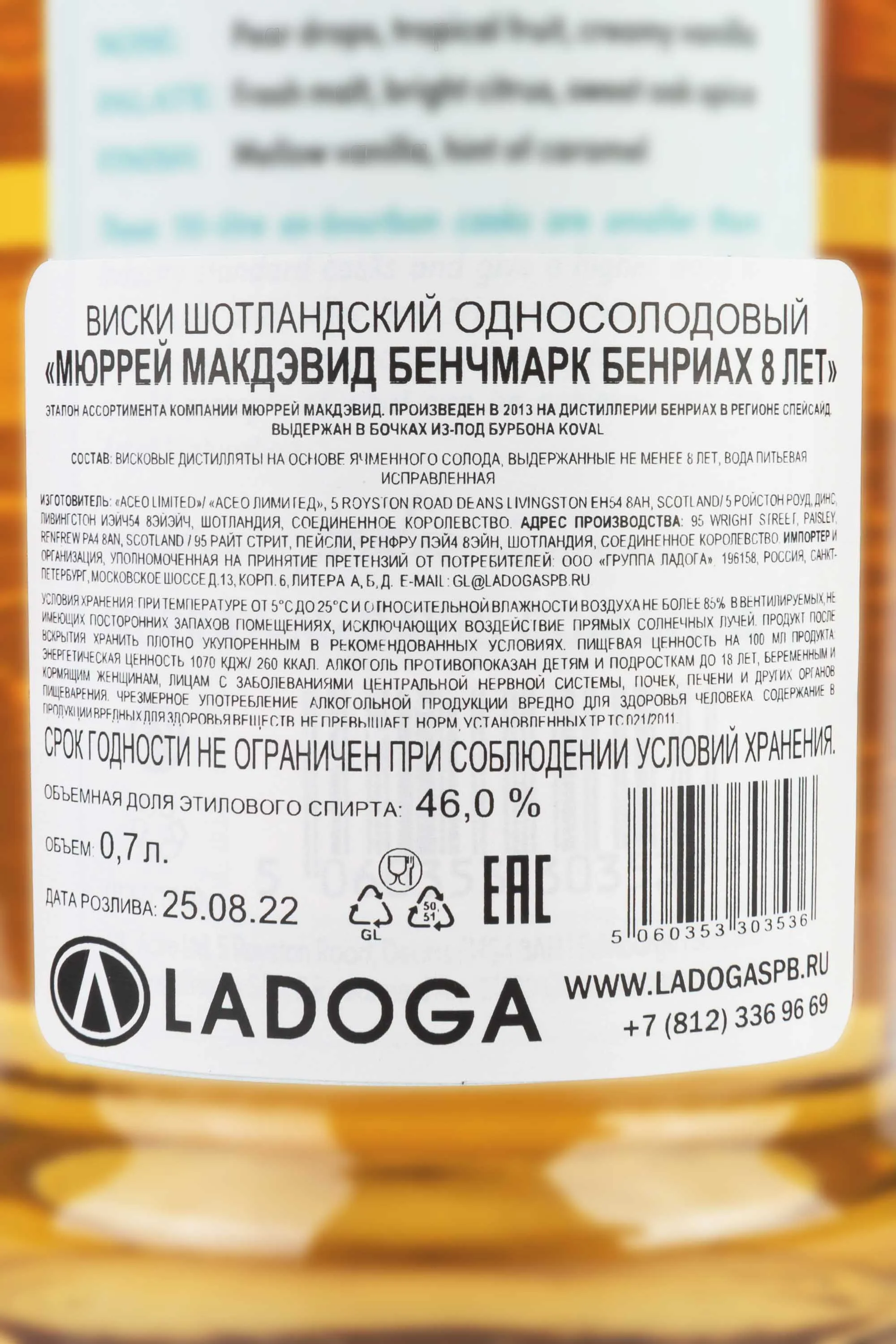 Виски Murray McDavid Benchmark Benriach 8 Years Old, gift box 0.7 л выдерживался по эксклюзивной технологии, включающей двойную выдержку в тщательно отобранных дубовых бочках. Сначала напиток прошел многолетнее созревание в традиционных американских бочках из-под бурбона, а затем завершил созревание в особых европейских емкостях, что придало уникальные многогранные оттенки вкуса и аромата. Благодаря такому подходу, виски приобрел особую глубину и сложность.