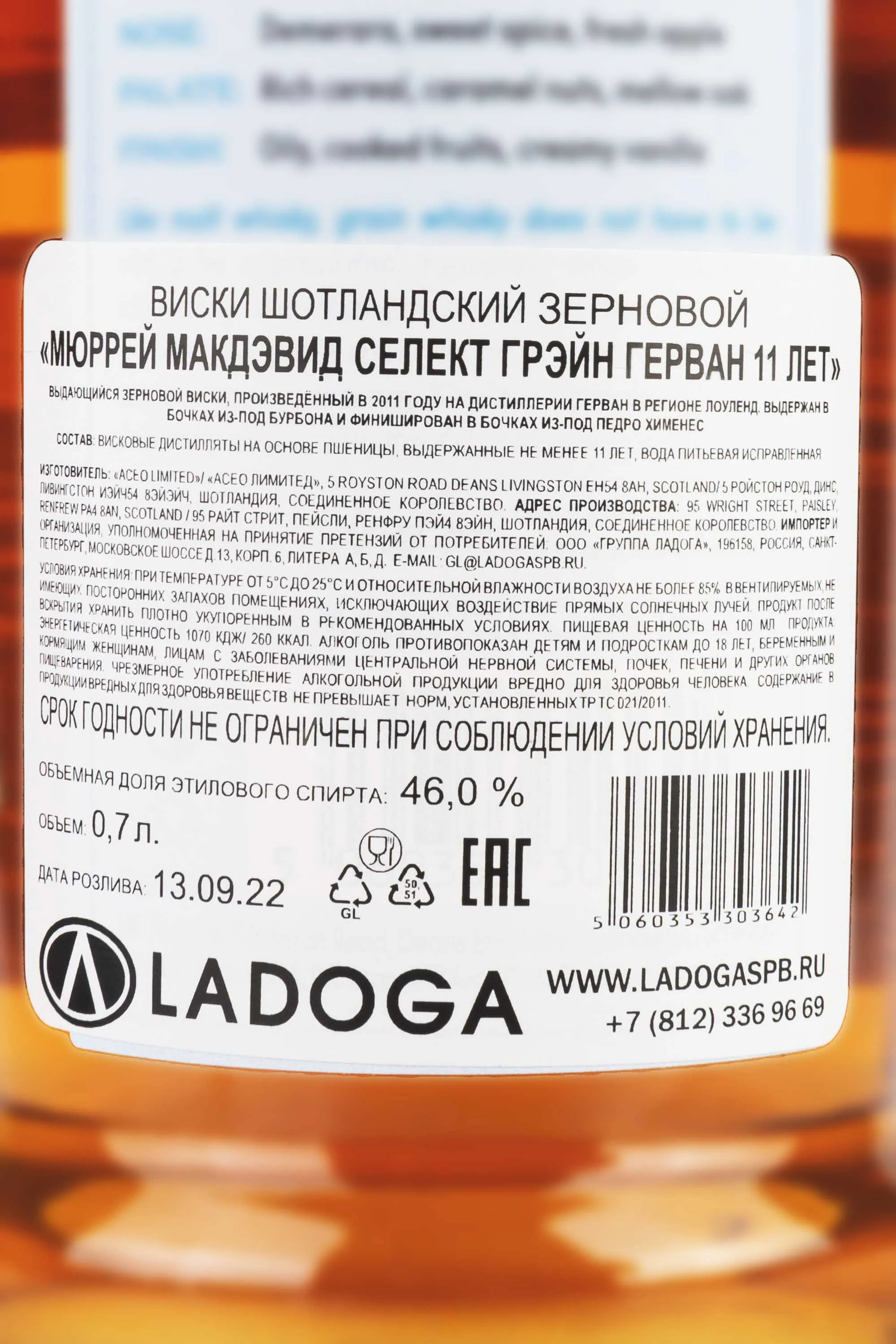 Виски Murray McDavid Select Grain Girvan 11 лет 0,7 л в подарочной упаковке — однозерновой скотч из региона Лоуленд, созданный на винокурне Гирван в 2011 году и бутилированный в 2022 году. Основным сырьем для этого релиза стала пшеница, придавшая напитку характерную мягкость и кремовую текстуру. Первоначально дистиллят выдерживался в дубовых бочках-хогсхедах, а затем в течение трех лет — в емкостях из-под хереса Педро Хименес от испанской бодеги Ximénez-Spínola. Такой подход к выдержке, известный как ACE (Additional Cask Enhancement), позволяет достичь особой глубины вкуса и аромата. Всего было выпущено 1093 бутылки этого виски, каждая из которых представляет собой уникальный образец мастерства и необычный подарок для ценителей редкого алкоголя.
