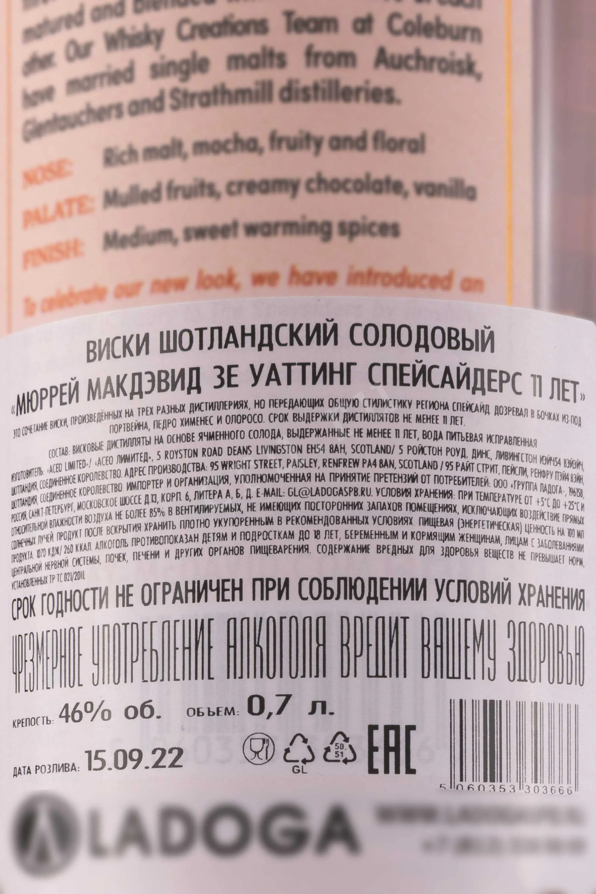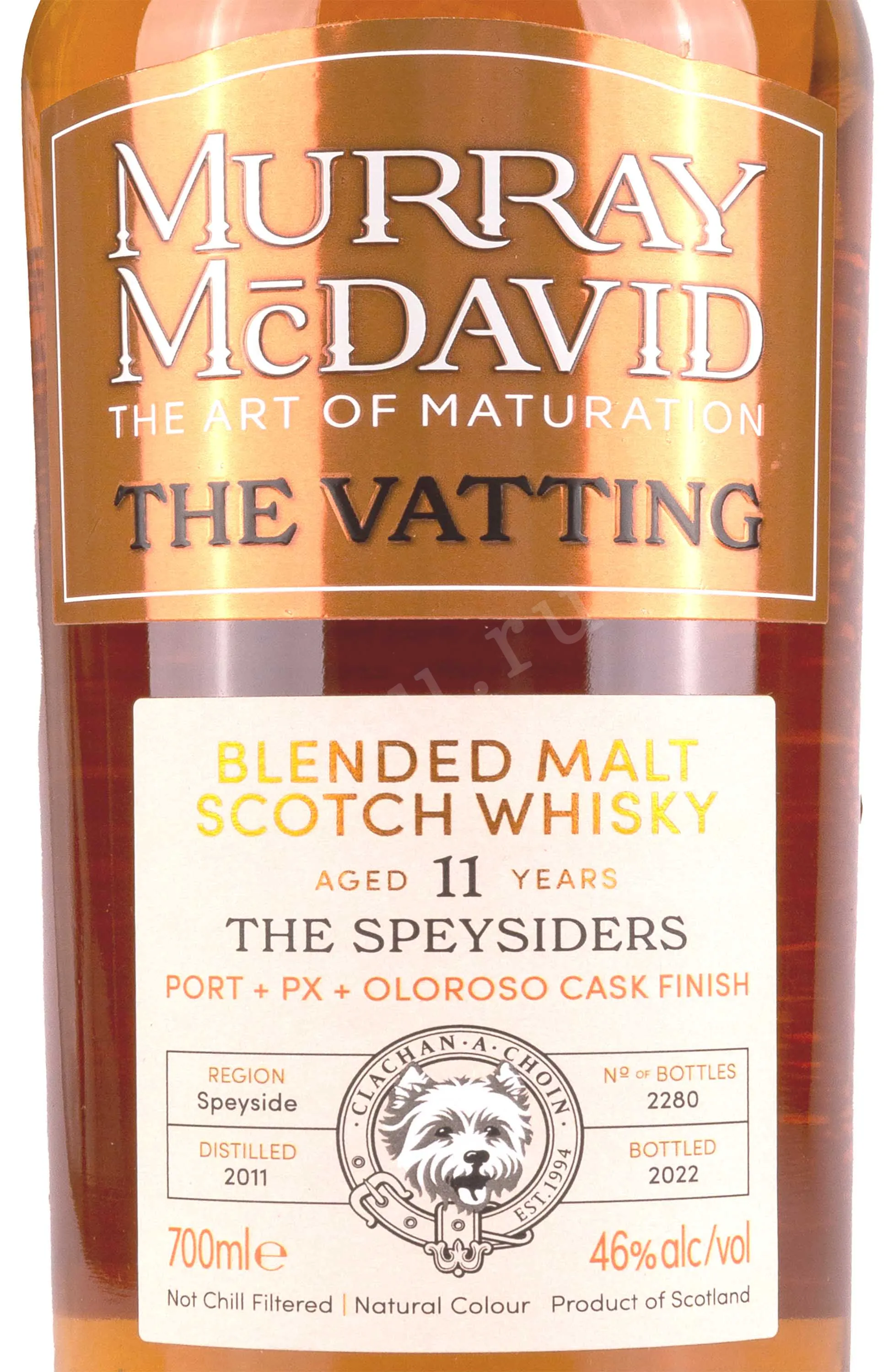 Виски Murray McDavid The Vatting The Speysiders 11 лет 0,7 л в подарочной упаковке — это особый образец купажированного солодового скотча из региона Спейсайд. Напиток составлен из дистиллятов с трех винокурен. Спирты созревали на протяжении 11 лет с довыдержкой в дубовых бочках из-под хереса, бурбона и портвейна, приобретая характерную сложность и индивидуальность. Важной особенностью стало отсутствие холодной фильтрации, благодаря чему молт сохранил богатую текстуру и естественный характер вкуса.