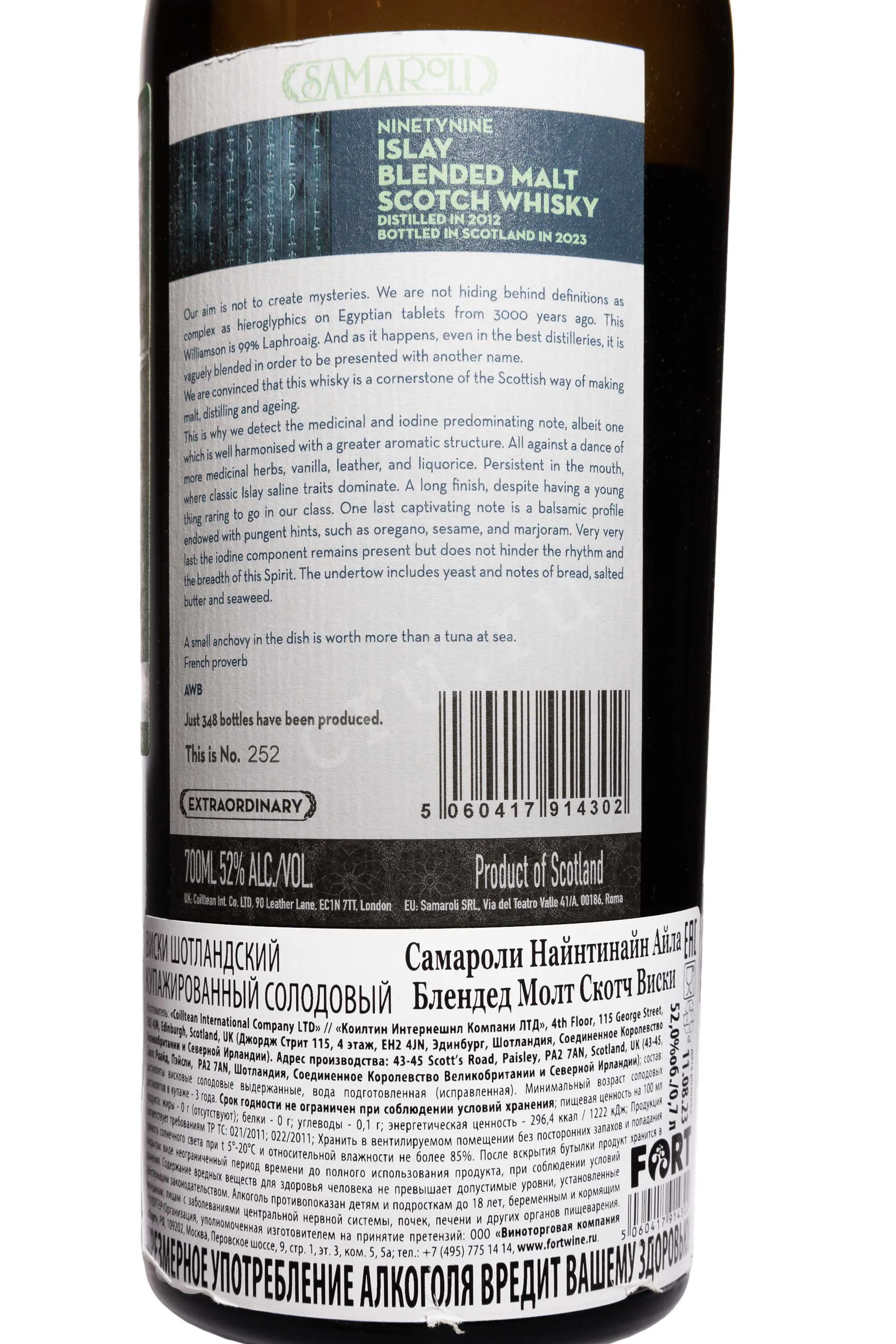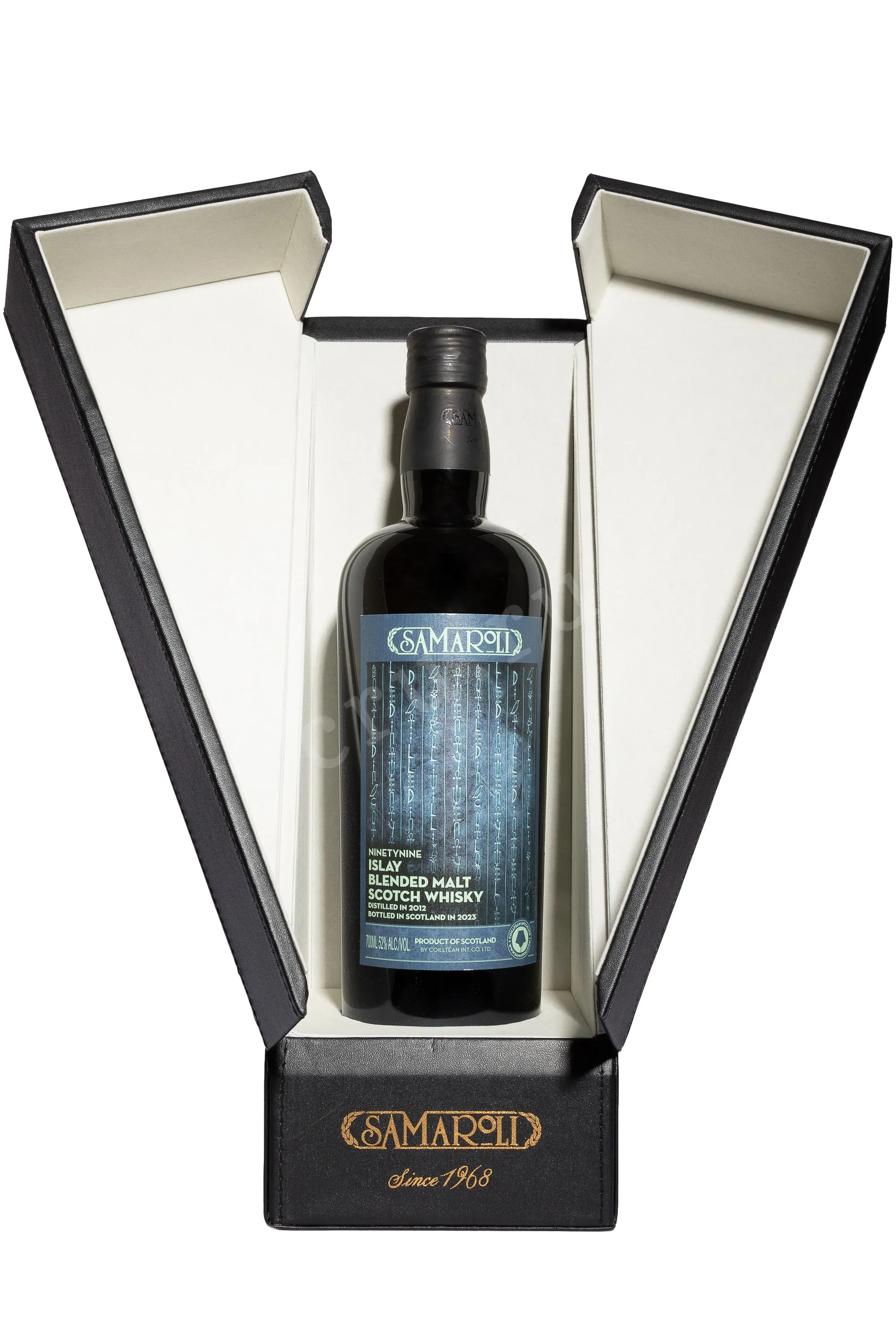 Виски Samaroli Ninetynine Islay 0,7 л в подарочной упаковке создан как авторская интерпретация островного стиля. В её базе лежат спирты, практически полностью происходящие с винокурни Лафройг. Производитель прямо подчёркивает открытость подхода: цель — не создавать загадки и не маскировать происхождение за сложными определениями. В основе релиза лежит скотч Williamson, который на 99% состоит из дистиллятов Лафройг, но по традиции выпускается под другим именем. Дом Самароли видит в этом продолжение практики старых шотландских блендеров, где важнее выражение региона, чем буквальное указание на винокурню. Стиль Айлы раскрывается через торфяную мощь, соляной мотив и плотную структуру, которые формируются в суровом морском климате. Выдержка проходит в бочках из-под бурбона, что смягчает дымность и добавляет объёма. Как и все представители коллекции боттлера, напиток выпущен очень ограниченной партией.