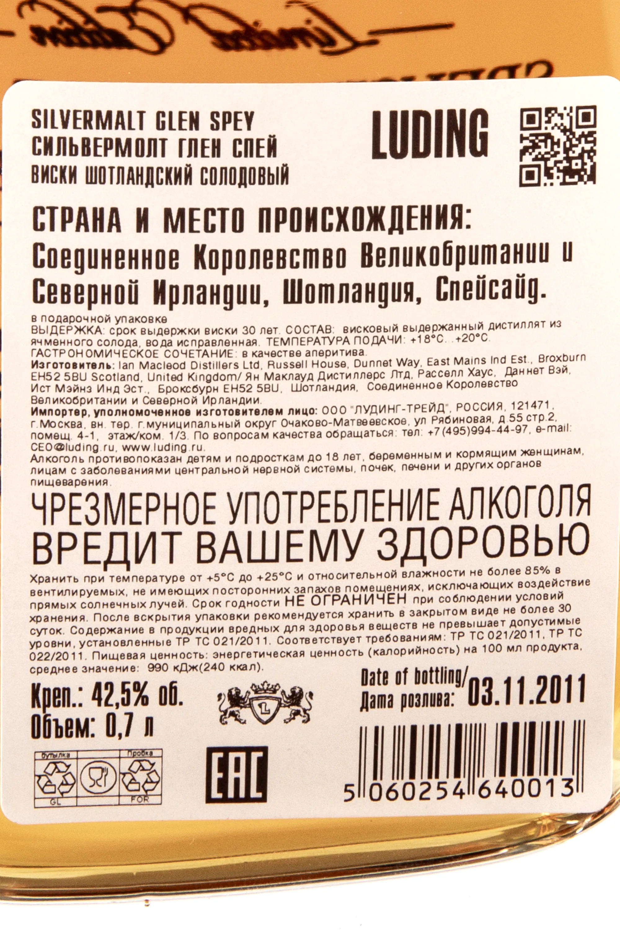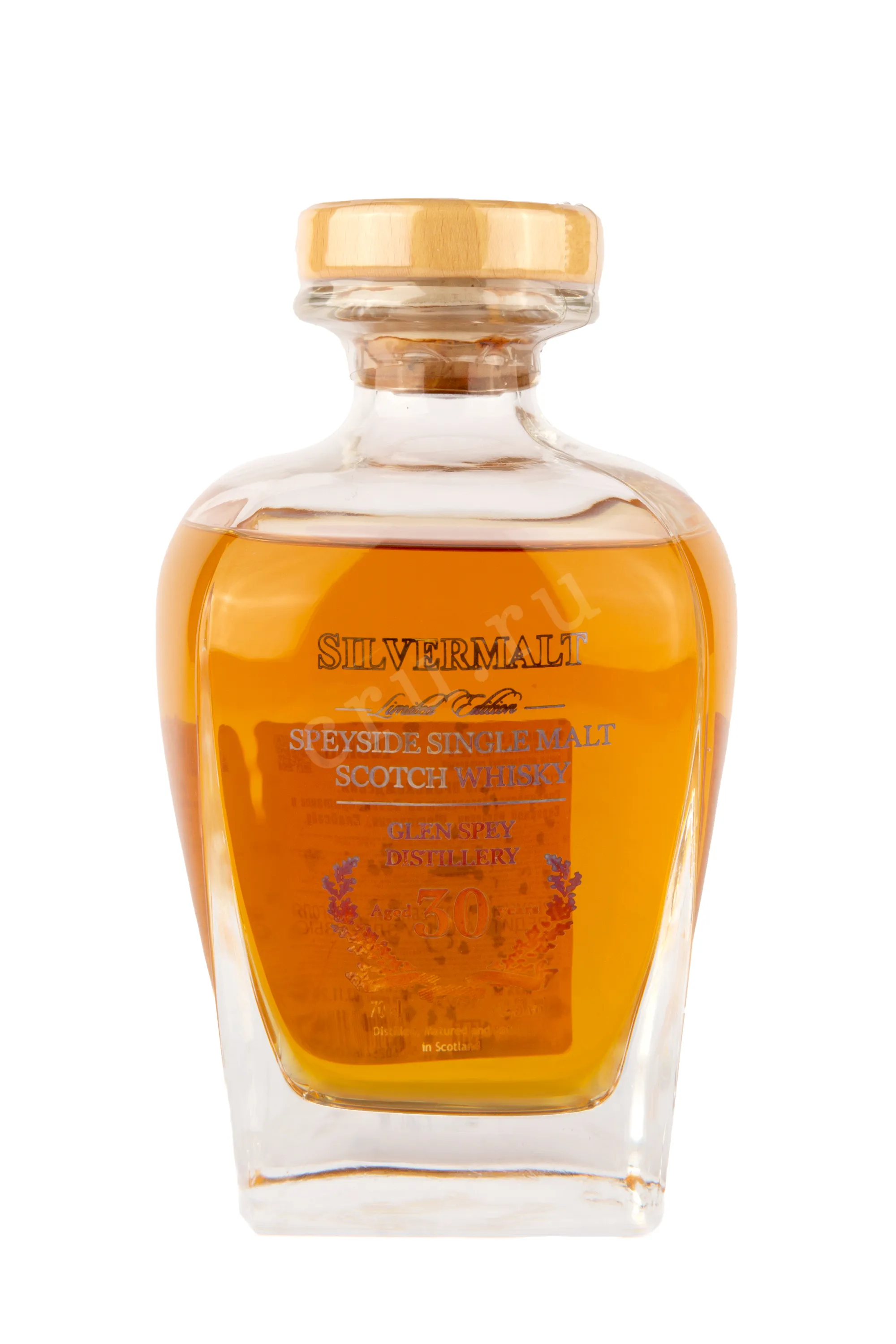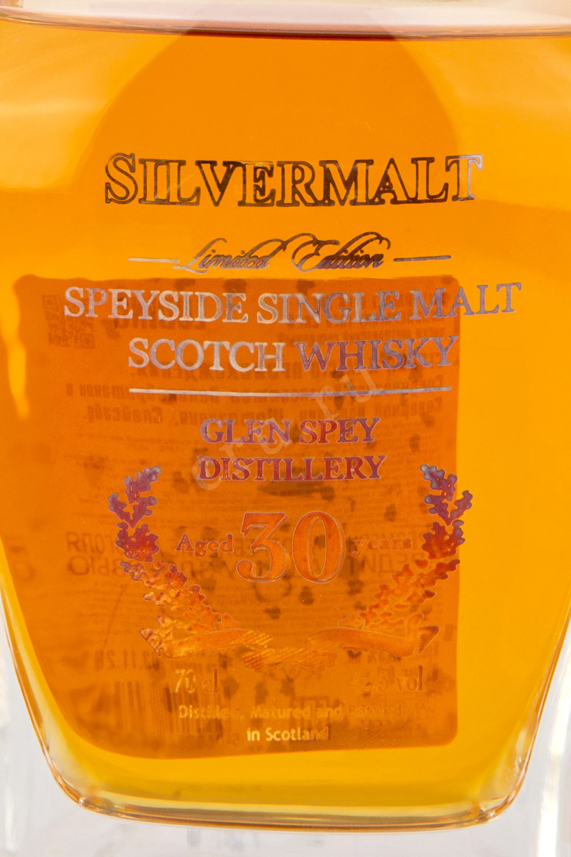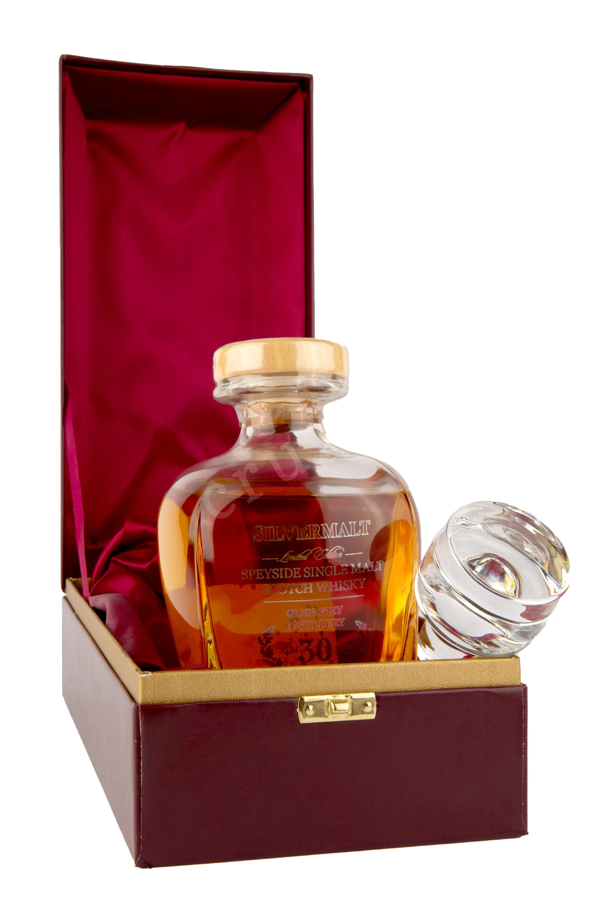 Виски Silvermalt Glen Spey 30 Years Old gift box 0.7 l – это эксклюзивный односолодовый шотландский алкоголь, выпущенный лимитированной партией в фигурных хрустальных декантерах в сопровождении с презентабельным сувенирным боксом. Созревание спиртов протекало в дубовых барриках в течение 30 лет, а розлив производился без применения холодной фильтрации при крепости 42.5%.