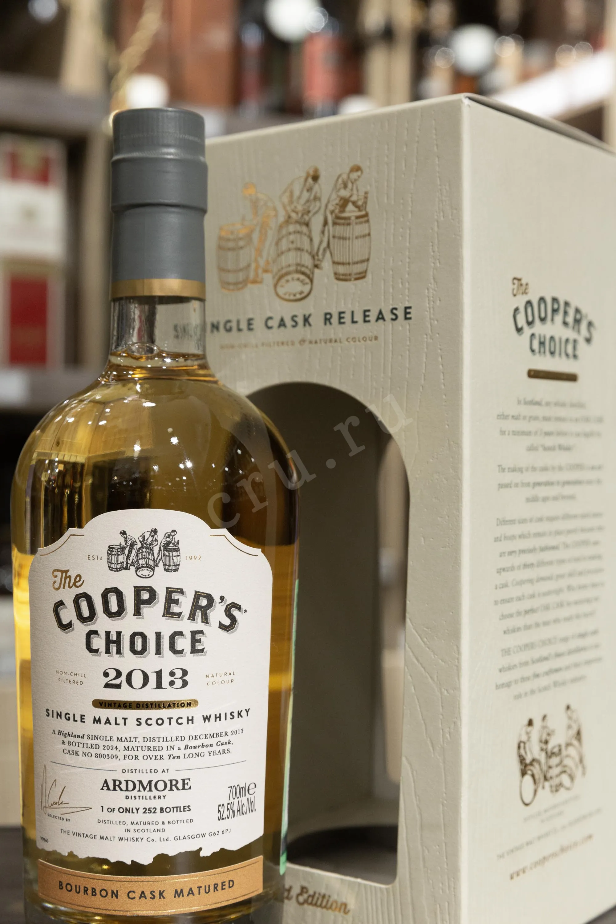 Виски The Cooper's Choice Ardmore Bourbon Cask Matured 0,7 л в подарочной упаковке представляет собой лимитированный релиз из серии редких шотландских сингл молтов. Он создан на винокурне Ардмор, известной своим характерным дымным стилем с мягким торфяным акцентом. Напиток выдерживался в бочках из-под бурбона, что придало ему чистоту вкуса, округлость и сладковатые нюансы. Каждая партия выпускается ограниченным тиражом и разливается без холодной фильтрации, что позволяет сохранить естественный аромат и насыщенность. Уникальность выражена в сочетании легкой дымности и мягких ванильных тонов, что высоко ценится коллекционерами и знатоками элитного виски.