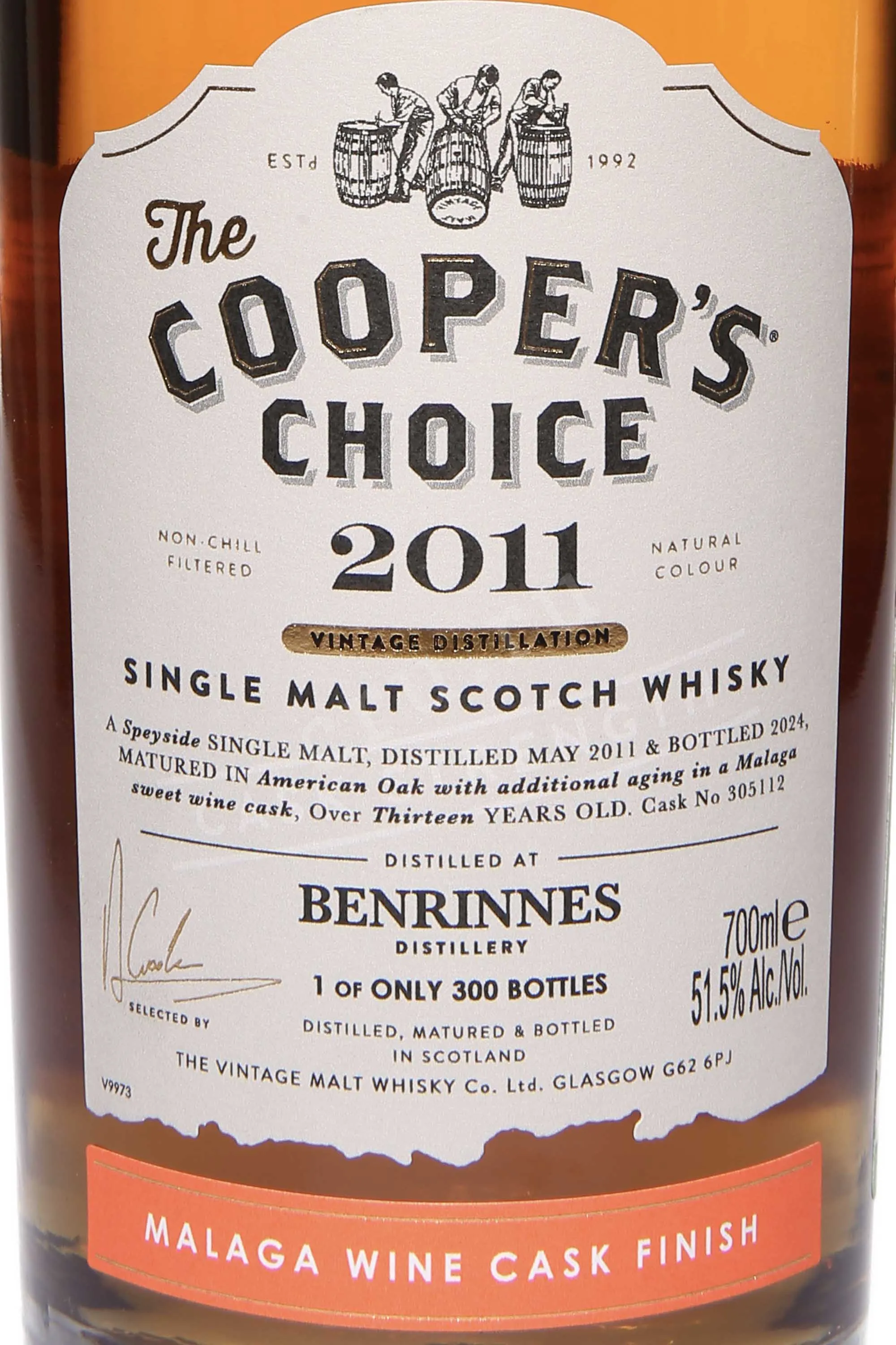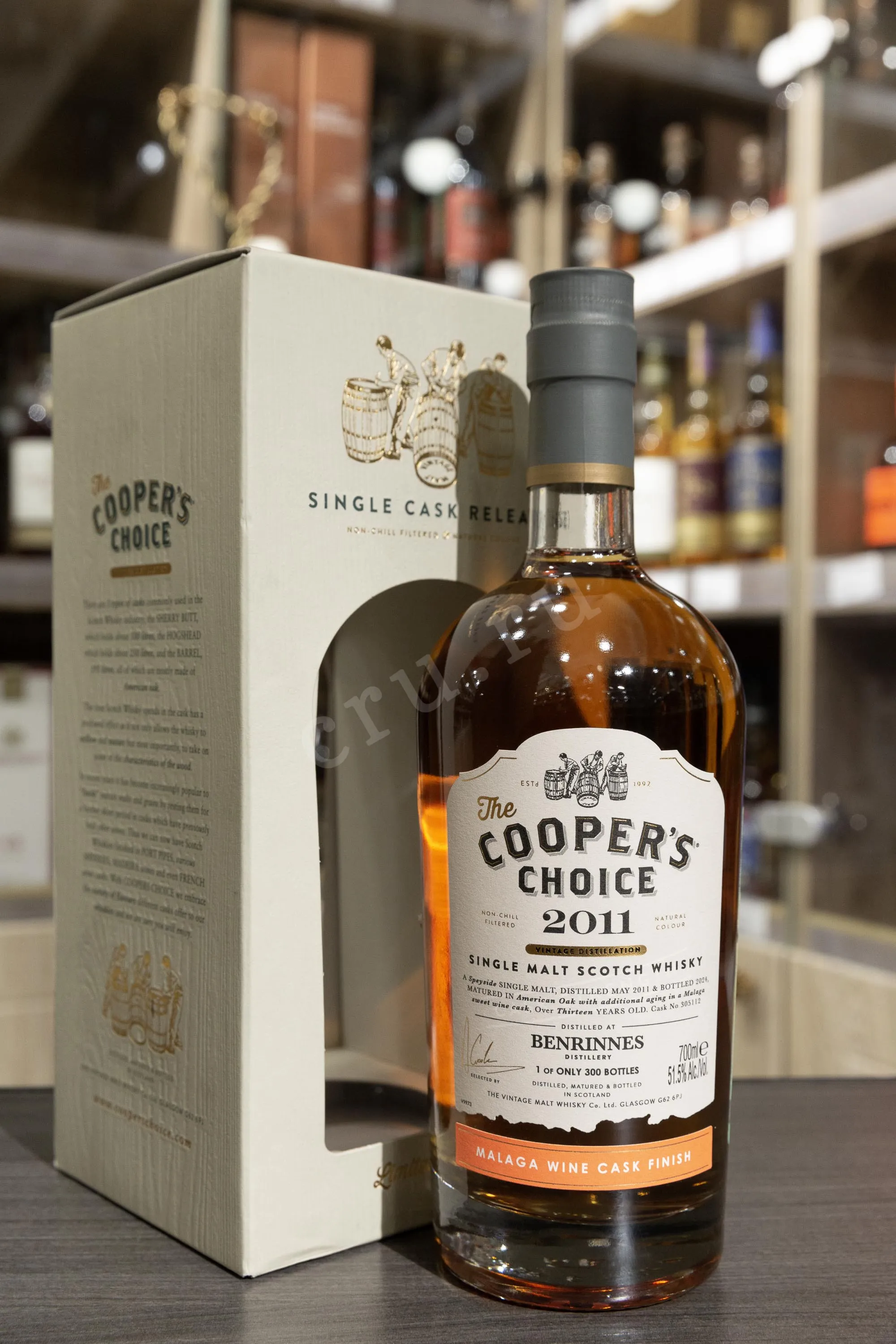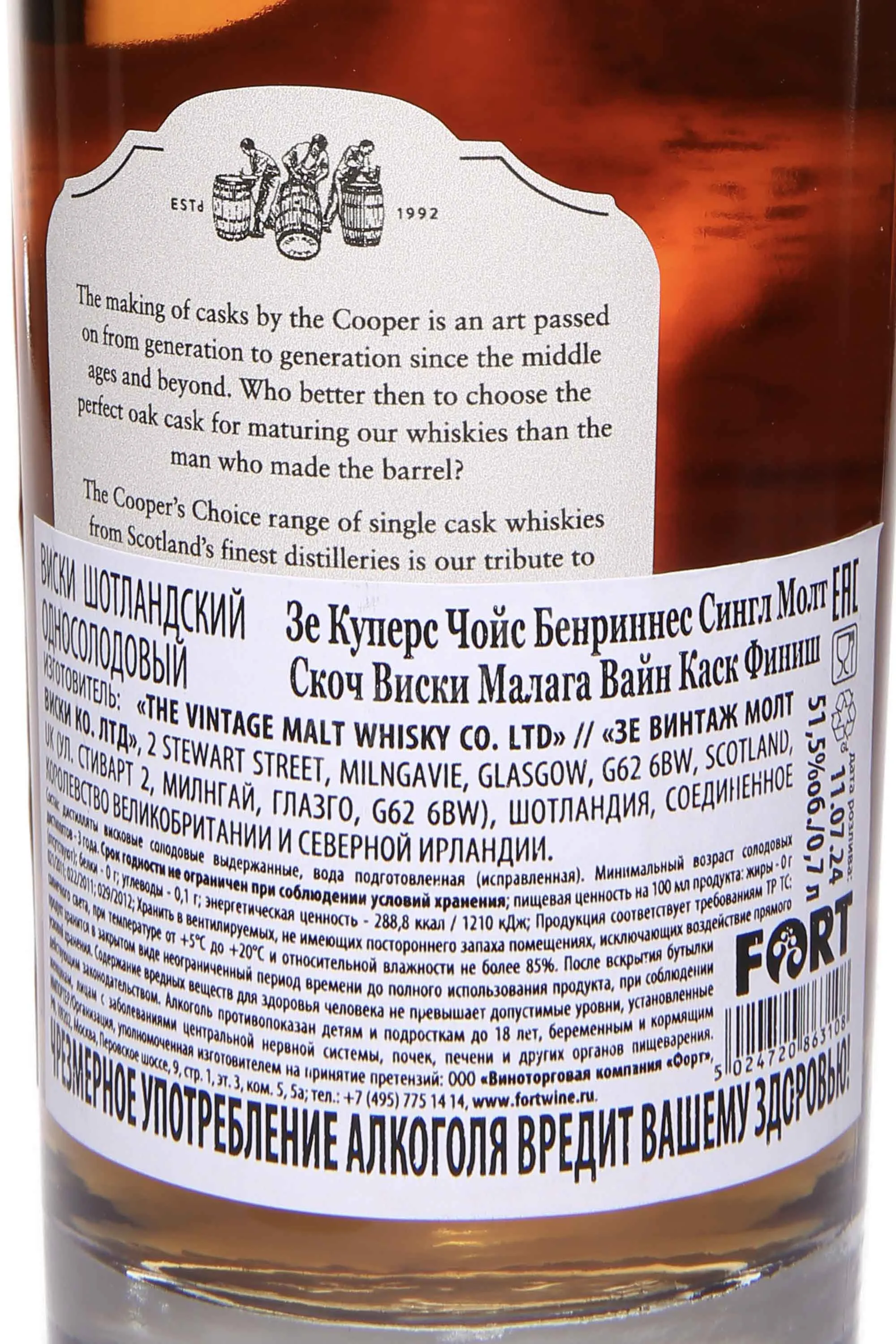 Виски The Cooper's Choice Benrinnes Malaga Wine Cask Finish 0,7 л в подарочной упаковке выпущен ограниченным тиражом и представляет собой редкий релиз от независимого боттлера. Скотч произведен на винокурне Бенриннес. Ее сингл молты известны классическим характером с выраженной плотностью и сложной структурой. После традиционной дистилляции виски прошел дополнительную выдержку в бочках из-под сладкого испанского вина Малага, что придало ему особую мягкость и яркий фруктовый акцент. Такой метод финишной выдержки используется нечасто и делает релиз коллекционным. Скотч ценится среди критиков за сбалансированность и насыщенный вкус, а также за гармоничное сочетание традиционного характера дистиллята и южного винного стиля.