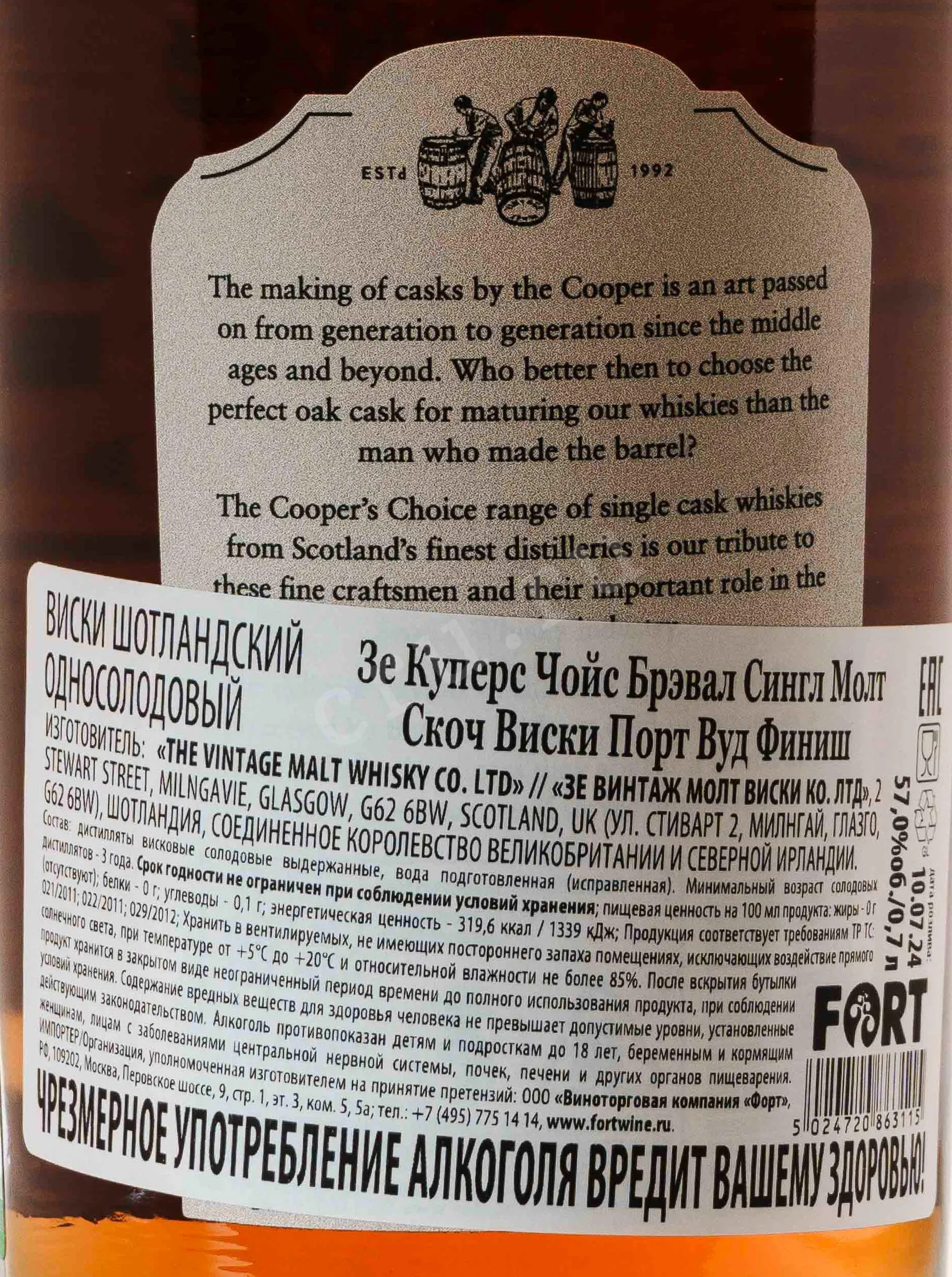 Этот эксклюзивный релиз серии «Выбор бондаря» крайне лимитирован — выпущено всего 570 бутылок на весь мир. Виски разлит при внушительной бочковой крепости 57% без холодной фильтрации и добавления красителей, что сохраняет его аутентичный характер. Благодаря влиянию портвейна, традиционно мягкий и цветочный стиль спиртов Braeval приобрел благородную ягодную сладость и глубокую текстуру. Это великолепный образец зрелого виски для ценителей сложных винных финишей.