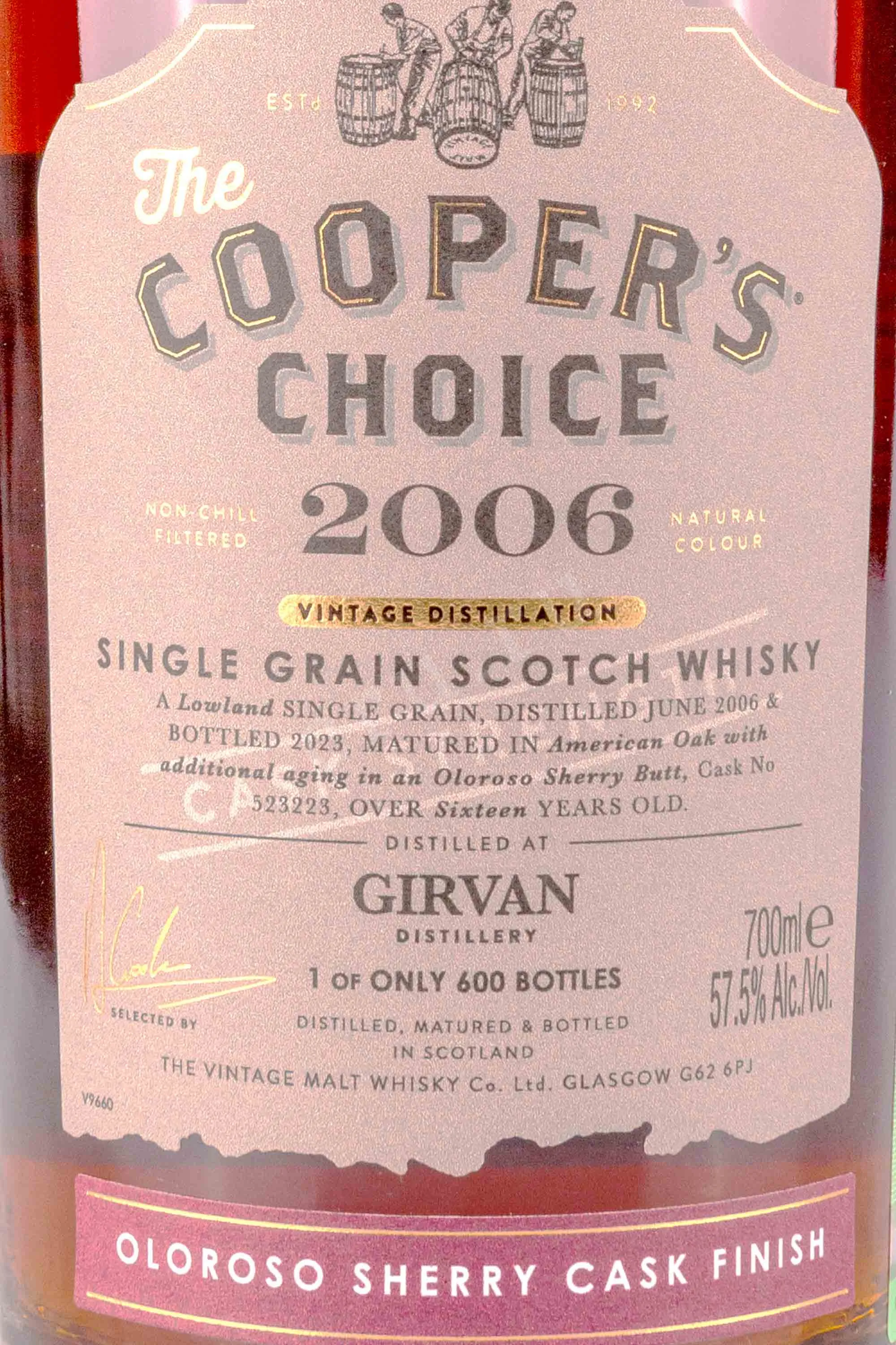 Виски The Coopers Choice Girvan Oloroso in gift box 0.7 л был выдержан по особой технологии, разработанной независимой шотландской компанией The Vintage Malt Whisky Company. Сначала напиток прошёл длительное созревание в бочках из-под бурбона, а затем дополнительно выдерживался в тщательно отобранных хересных бочках из-под алкоголя сорта Oloroso. Благодаря уникальной двойной выдержке, приобретена характерная глубина и утончённость вкуса с яркими фруктовыми и пряными оттенками, ставшими фирменной чертой этого релиза.
