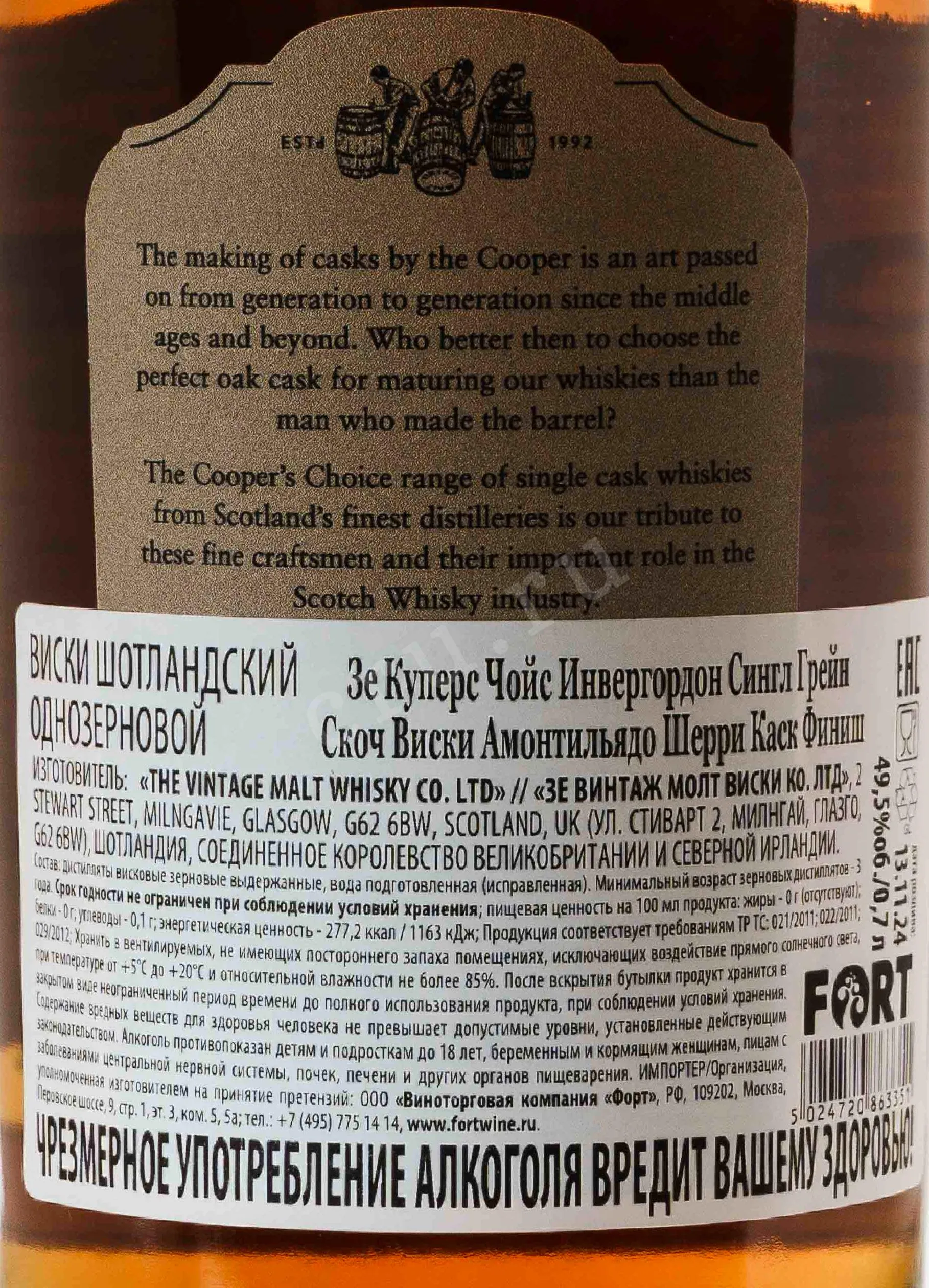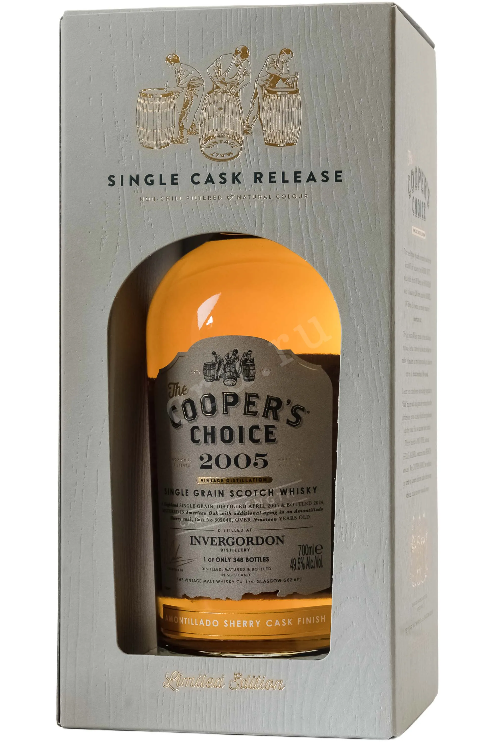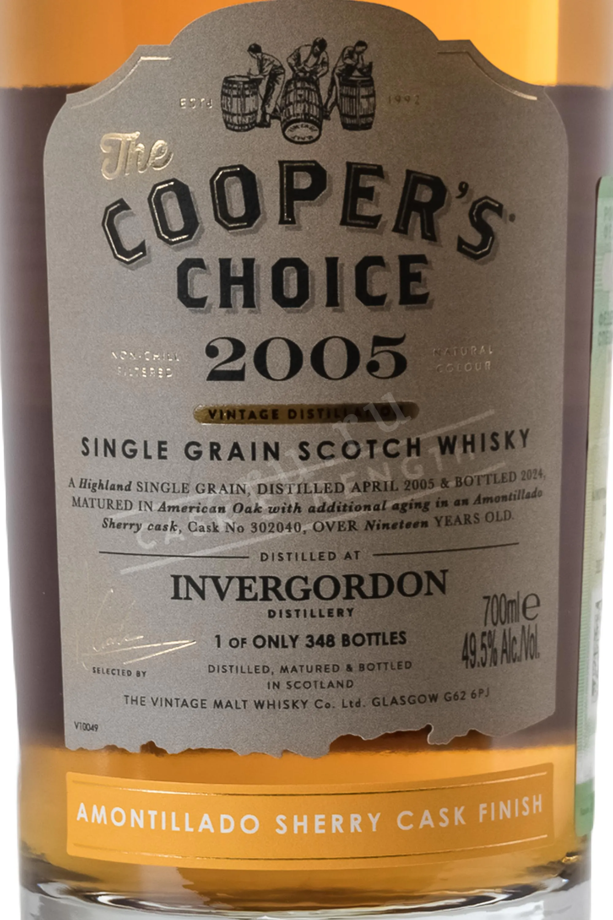 The Cooper's Choice Invergordon 2005 — это редкий коллекционный однозерновой шотландский виски из региона Хайленд (Highlands), выпущенный независимым боттлером The Vintage Malt Whisky Co. Напиток был дистиллирован на заводе Invergordon в апреле 2005 года и созревал в течение 19 лет. Первичная выдержка проходила в бочках из-под американского дуба, после чего виски прошел дополнительное дозревание в ценной бочке из-под сухого хереса Amontillado (Cask №302040).