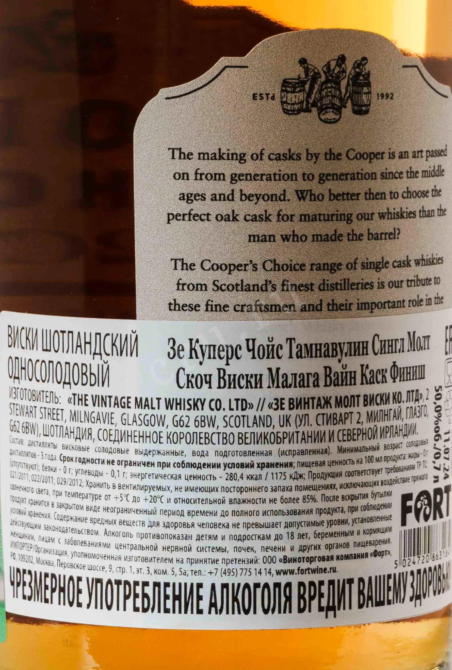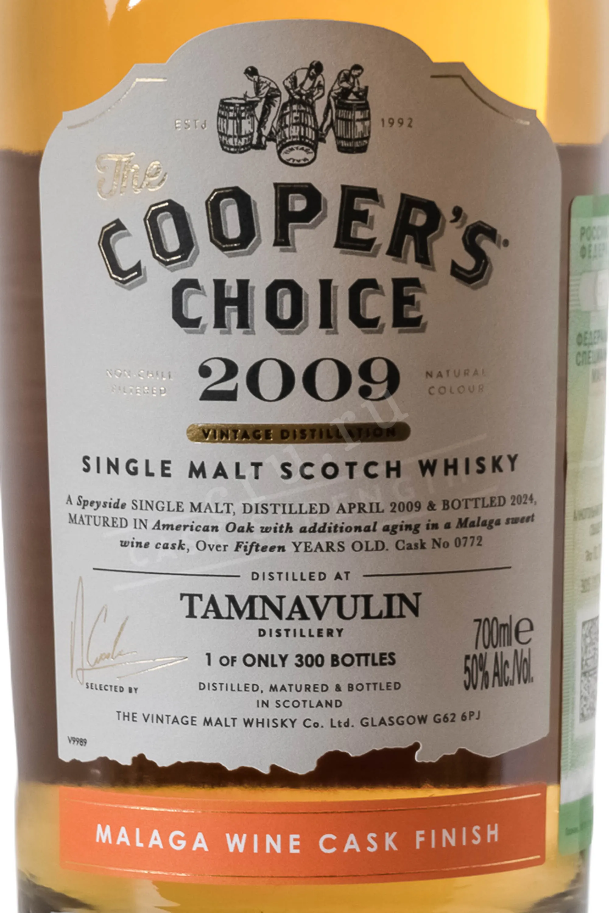 The Cooper's Choice Tamnavulin 2009 — это редкий образец спейсайдского виски от независимого боттлера The Vintage Malt Whisky Co, входящий в престижную серию «Выбор бондаря». Напиток был дистиллирован в апреле 2009 года и провел 15 лет в бочках, пройдя уникальный путь созревания. Начальный этап выдержки проходил в классическом американском дубе, после чего виски был перемещен в одну-единственную бочку из-под сладкого испанского вина Малага (Cask №0772) для финальной отделки.