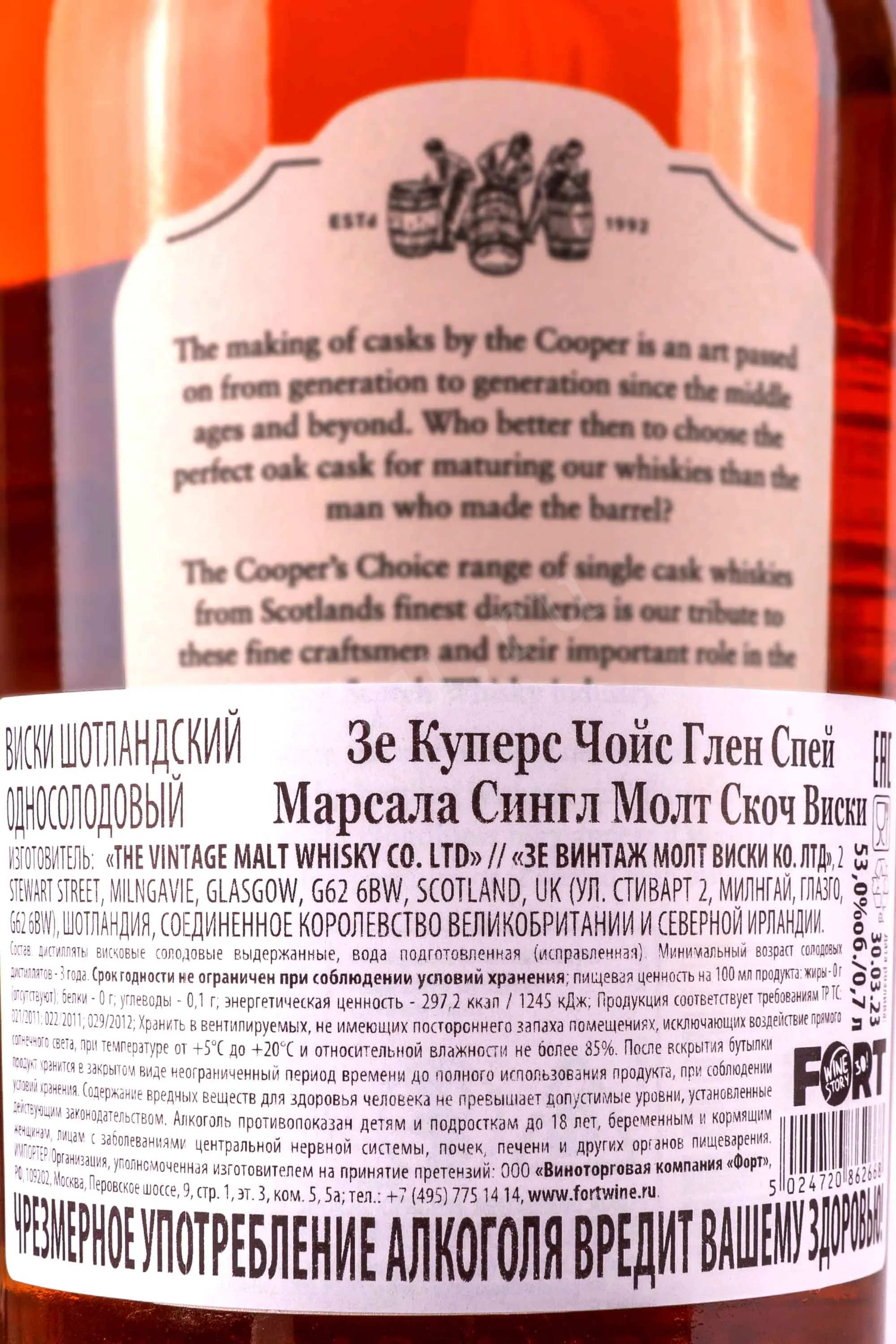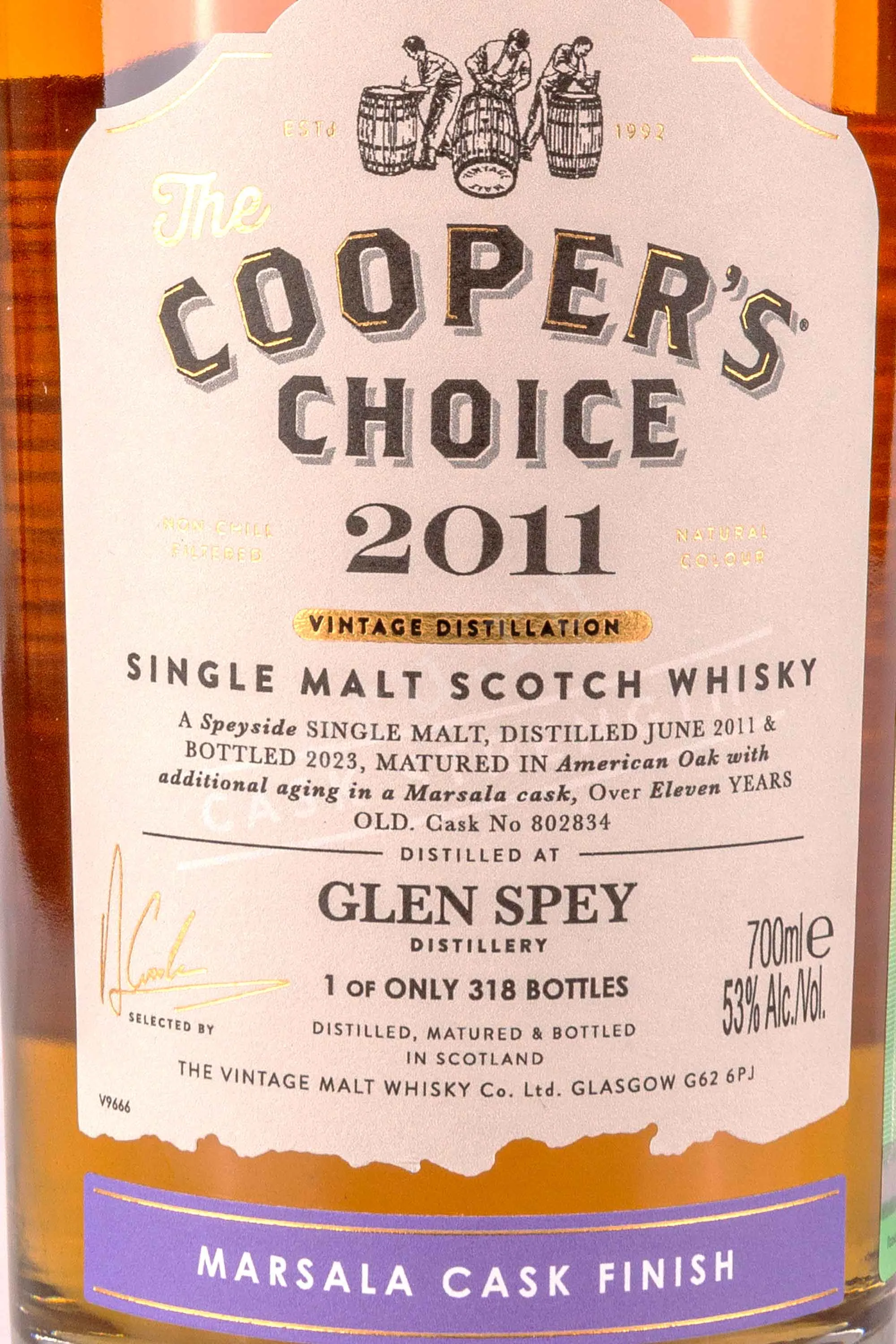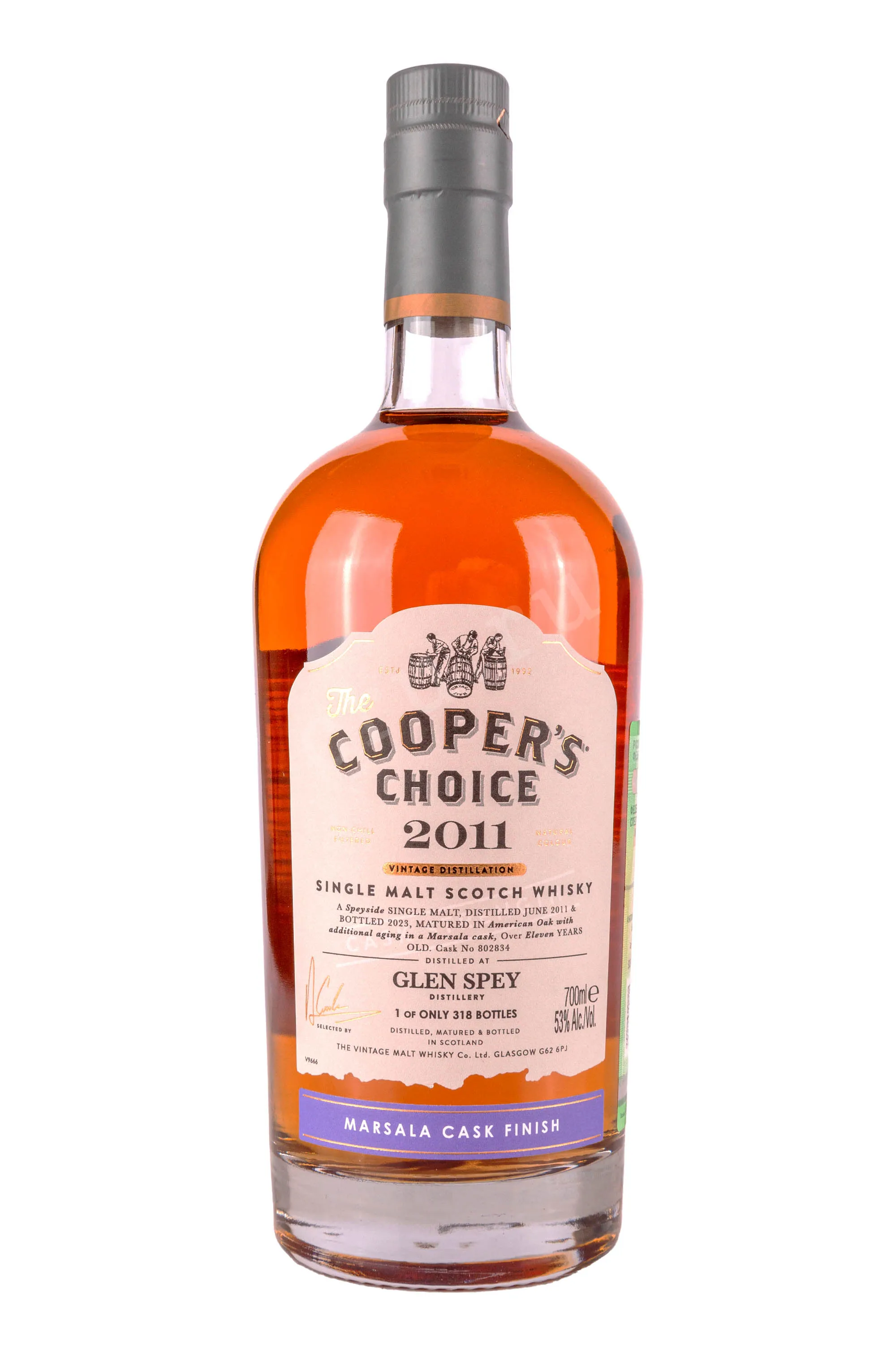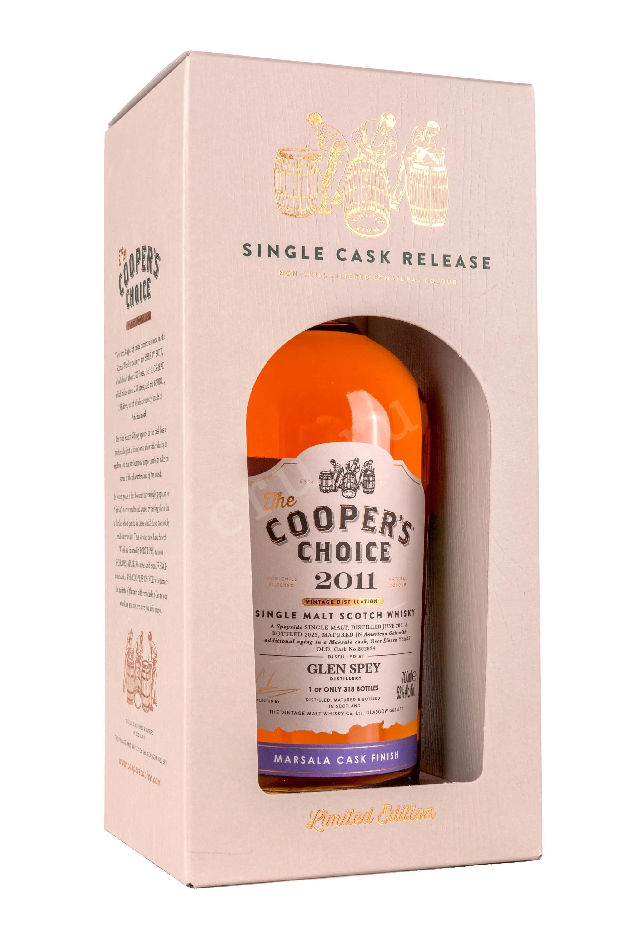 Виски The Coopers Choice Dalmunach Glen Spey Marsala Cask Finish 0,7 л в подарочной упаковке — лимитированный релиз, созданный из спиртов двух шотландских дистиллерий: Далмунак и Глен Спэй. Особенность купажа — финишная выдержка в бочках из-под марсалы, привезённых с Сицилии. Это итальянское креплёное вино известно своей фруктовой яркостью и насыщенным характером. Созревание дистиллятов в этих бочках позволило усилить сладкие и винные ноты, не теряя фирменной шотландской сухости. Розлив произведён вручную, без холодной фильтрации и добавления красителей. Крепость напитка — выше обычного, 53%. Общий тираж ограничен несколькими сотнями бутылок, каждая из которых имеет индивидуальный номер и представляет особый интерес для коллекционеров редкого алкоголя.
